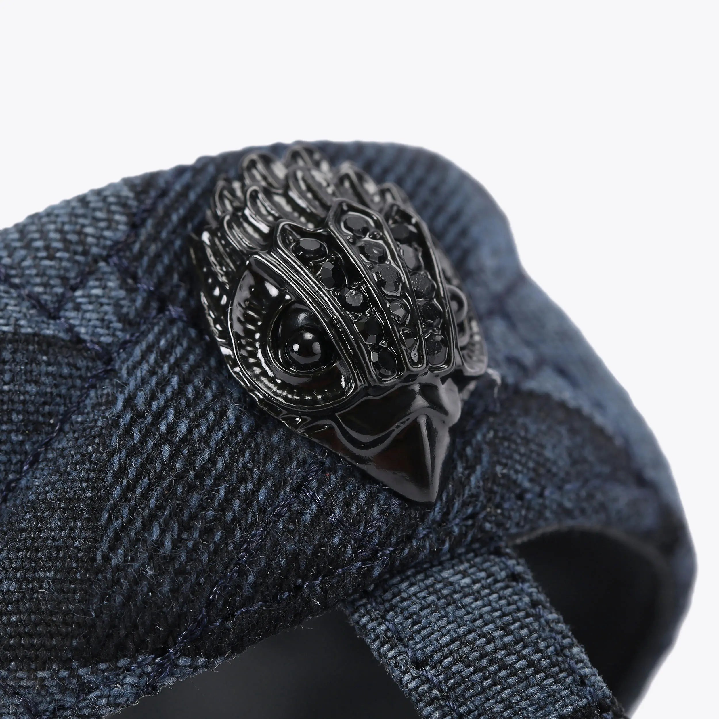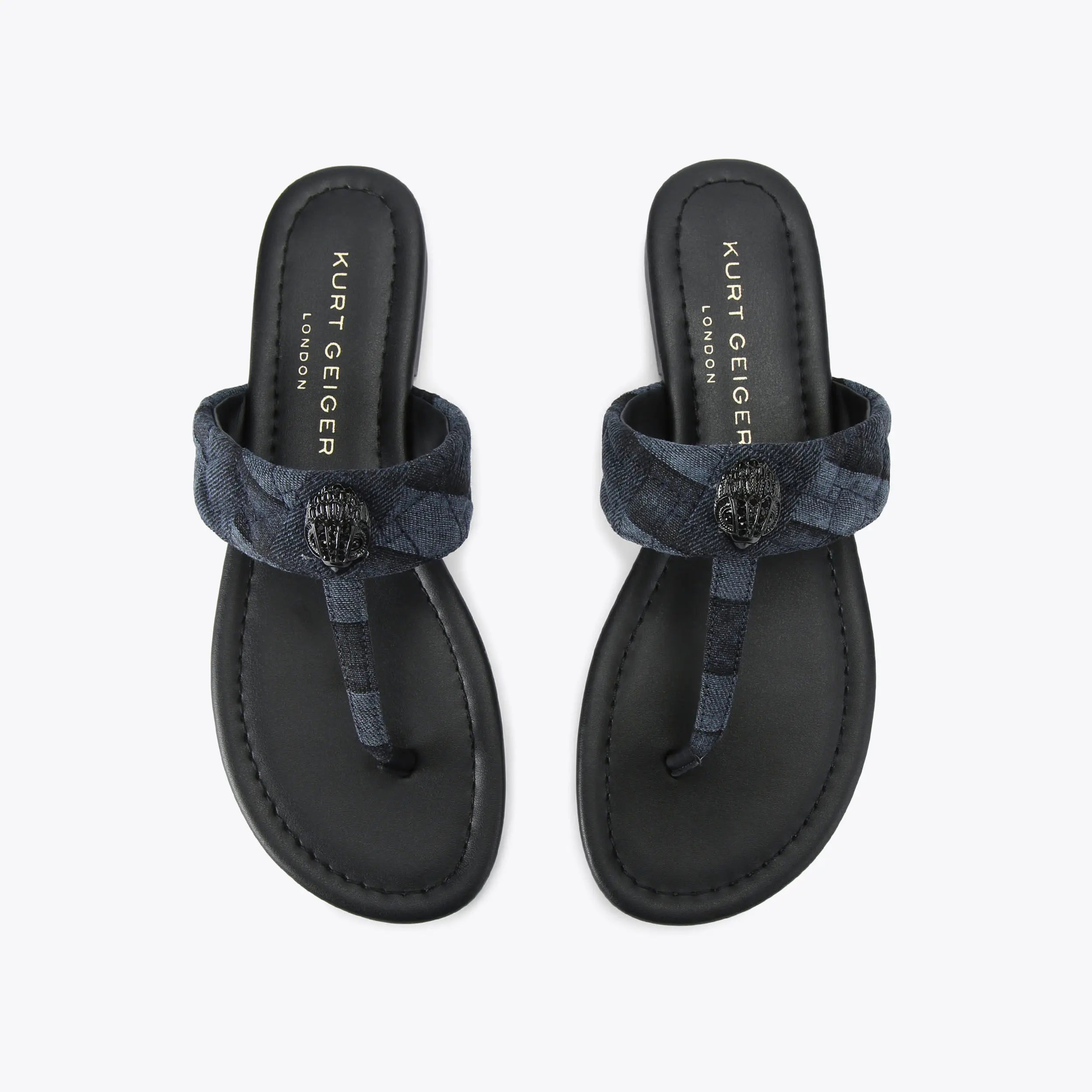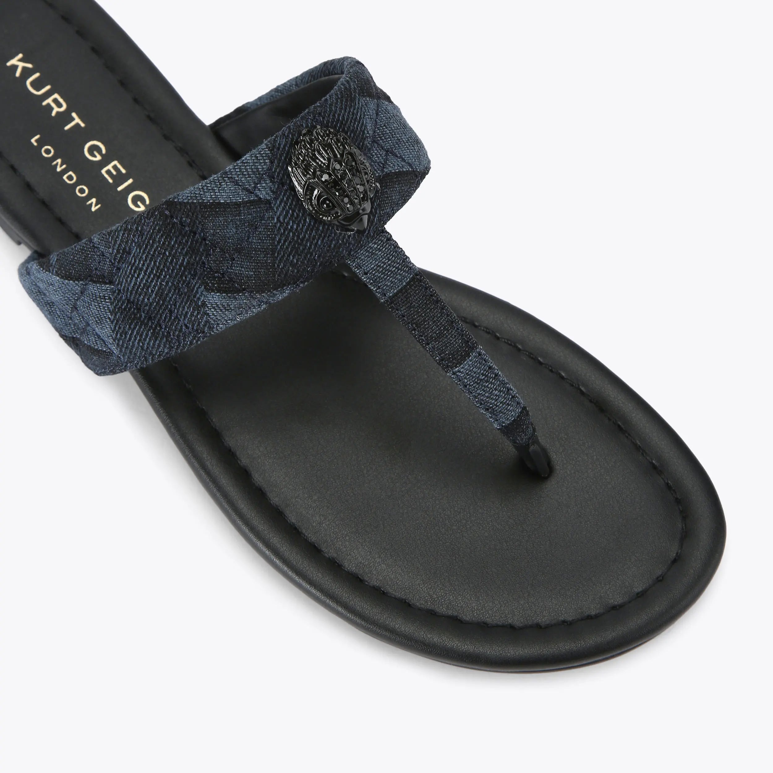This Kensington T-Bar Sandal, an addition to the iconic Kensington collection, features a toe post strap which is crafted from a denim with bleached weave design. The black eagle head sits on the strap.