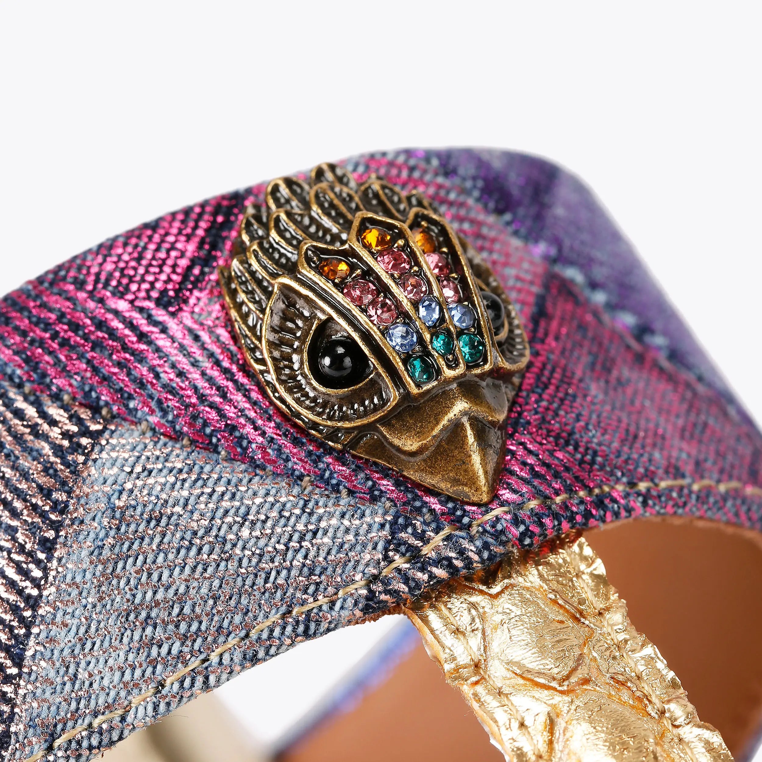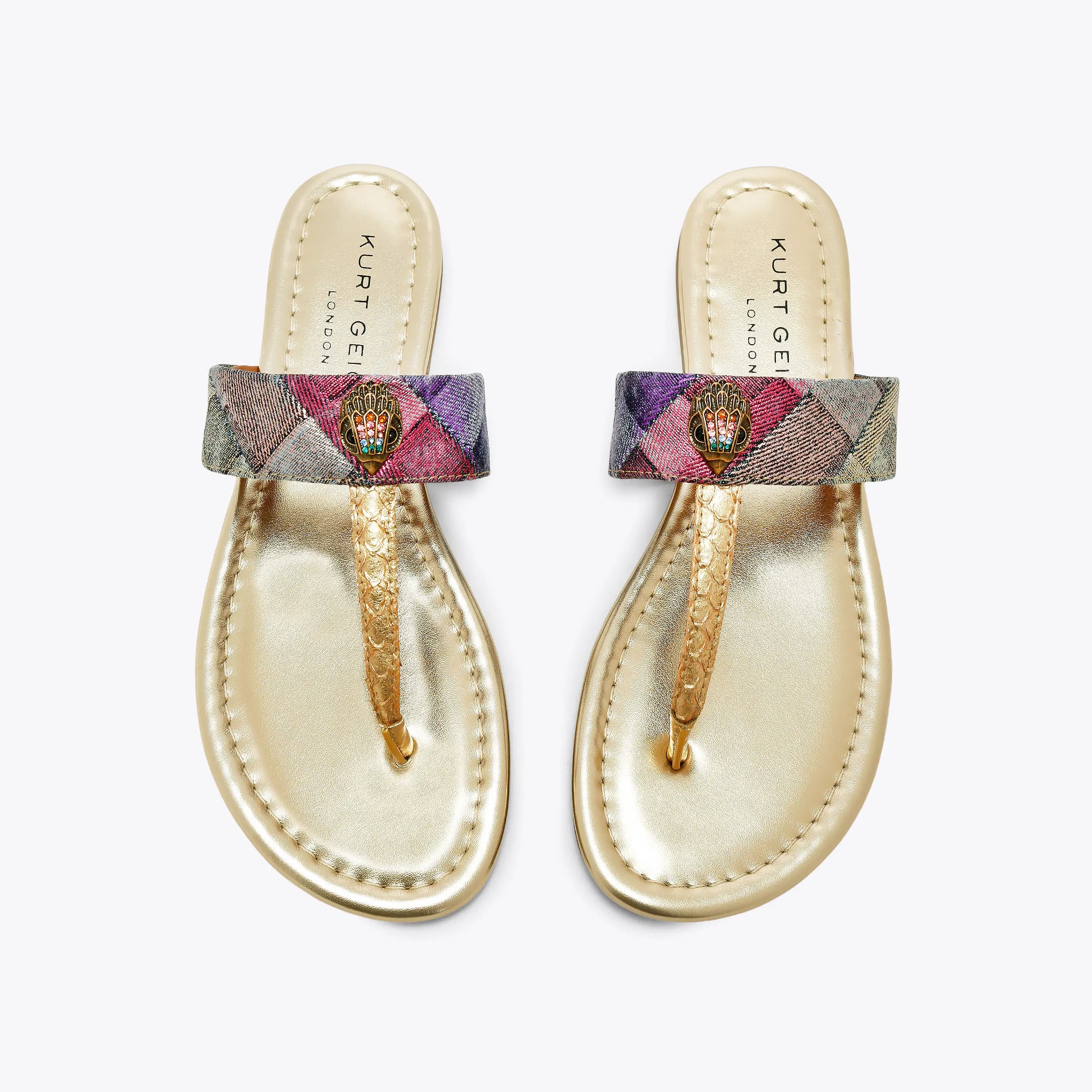This Kensington T-Bar Sandal, features a toe post strap which is crafted from a rainbow denim with gold foil embossing. There is an antiqued brass eagle head with rainbow crystals sat on the top of the strap.