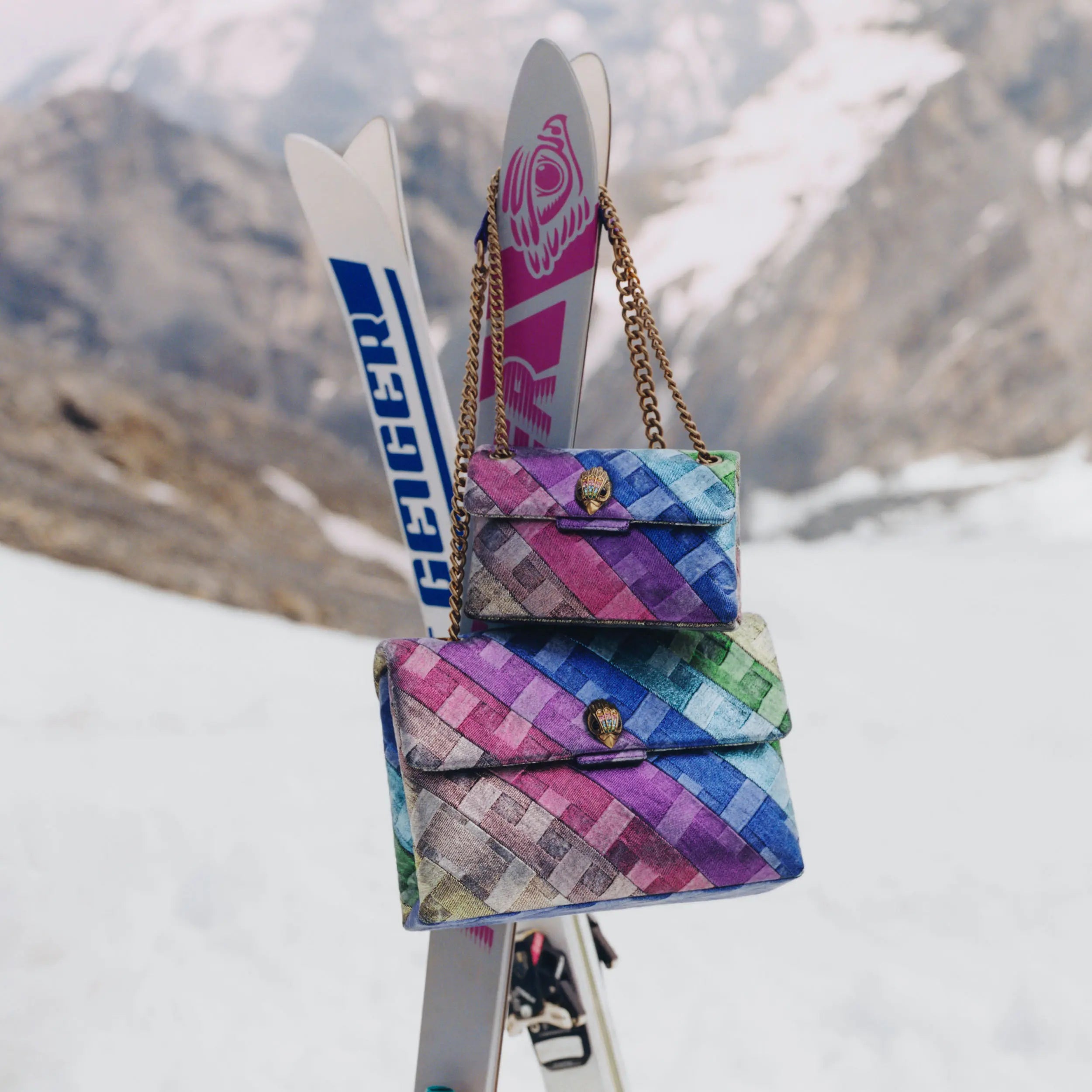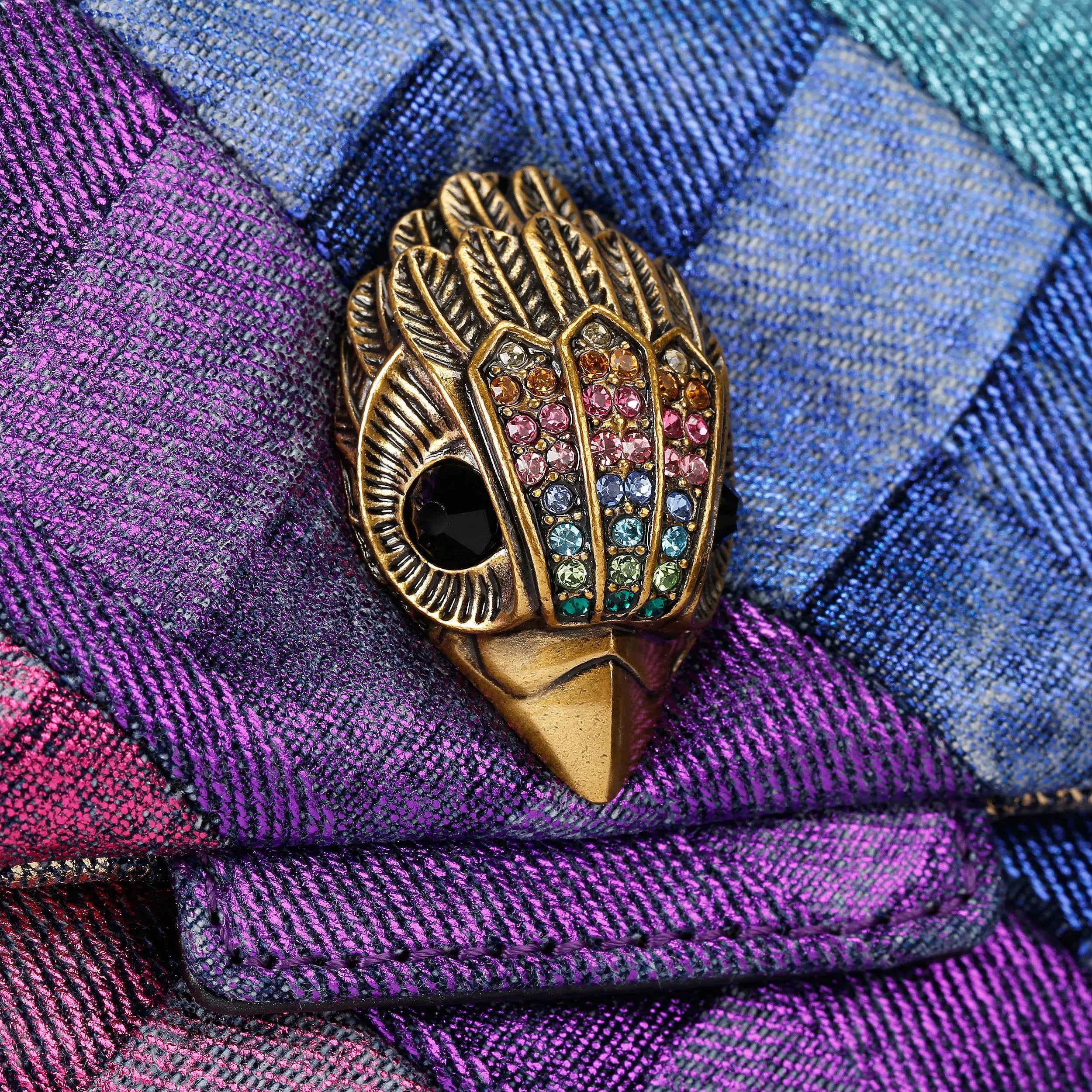 This Mini Kensington purse is crafted from a washed denim in weave print with gold foil. The antiqued brass eagle head features crystals on the front flap.