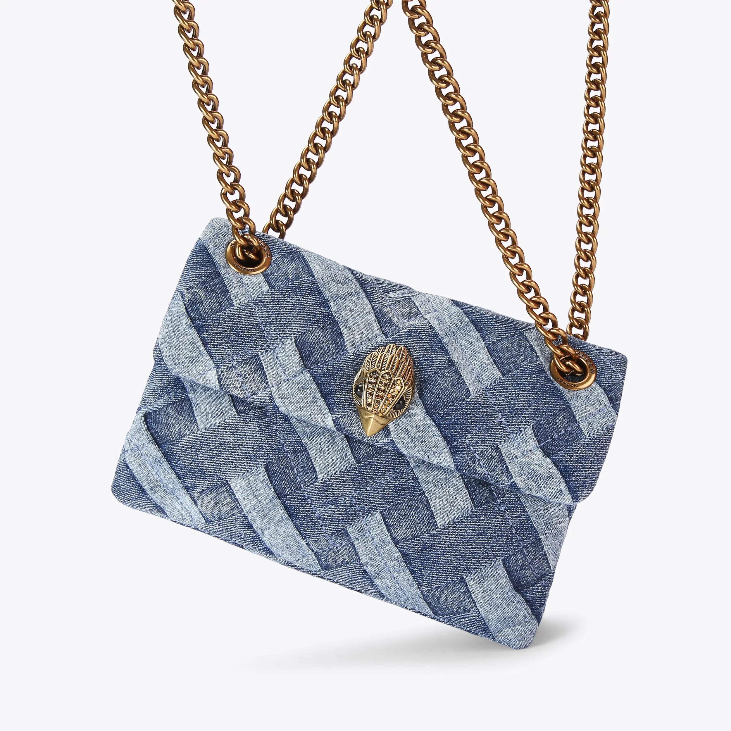 This Mini Kensington purse is crafted from an acid wash denim in weave print. The antiqued brass eagle head features crystals on the front flap.