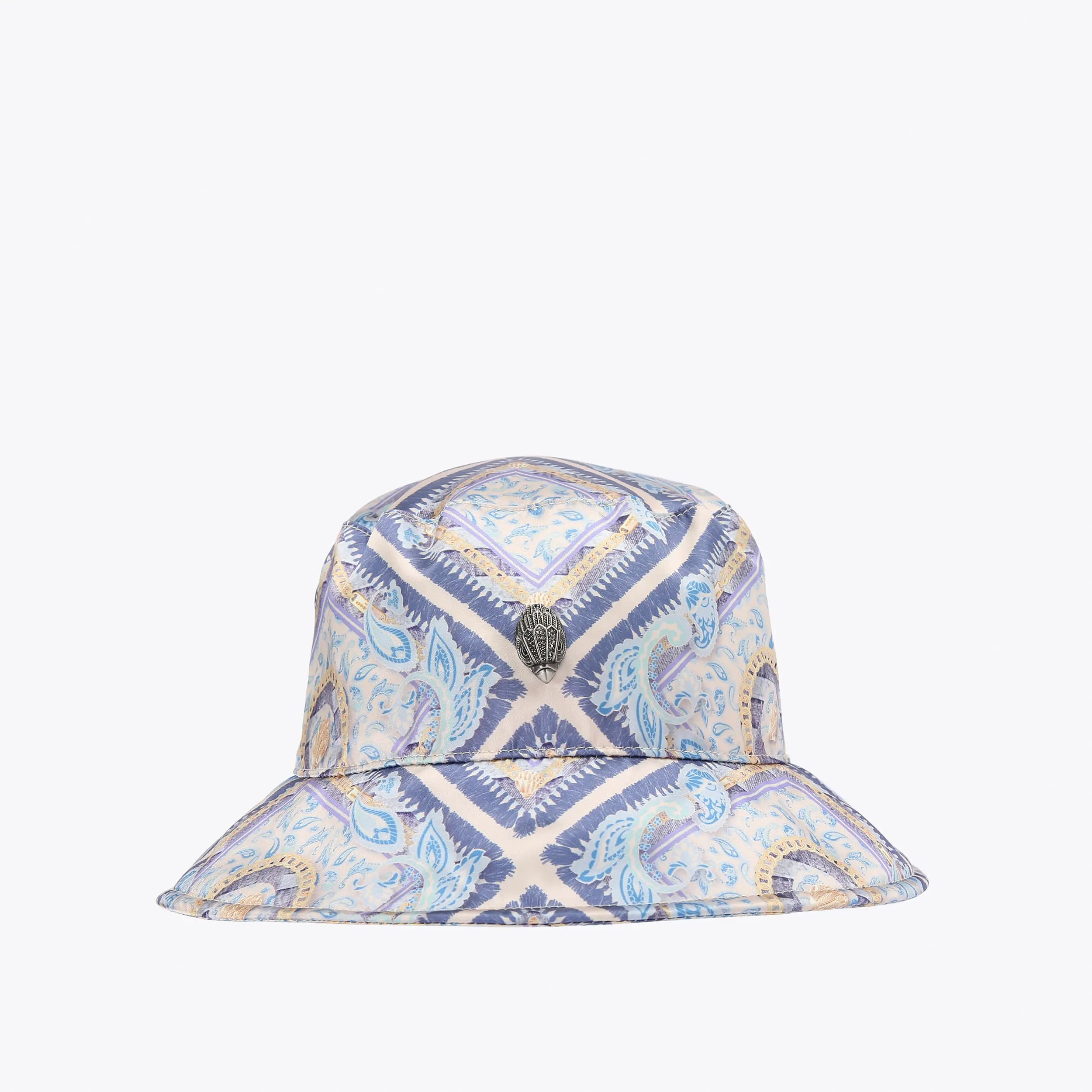 This Kensington Bucket Hat arrives in a blue paisley printed nylon. The antiqued silver eagle head features crystals and is to be worn to the front.