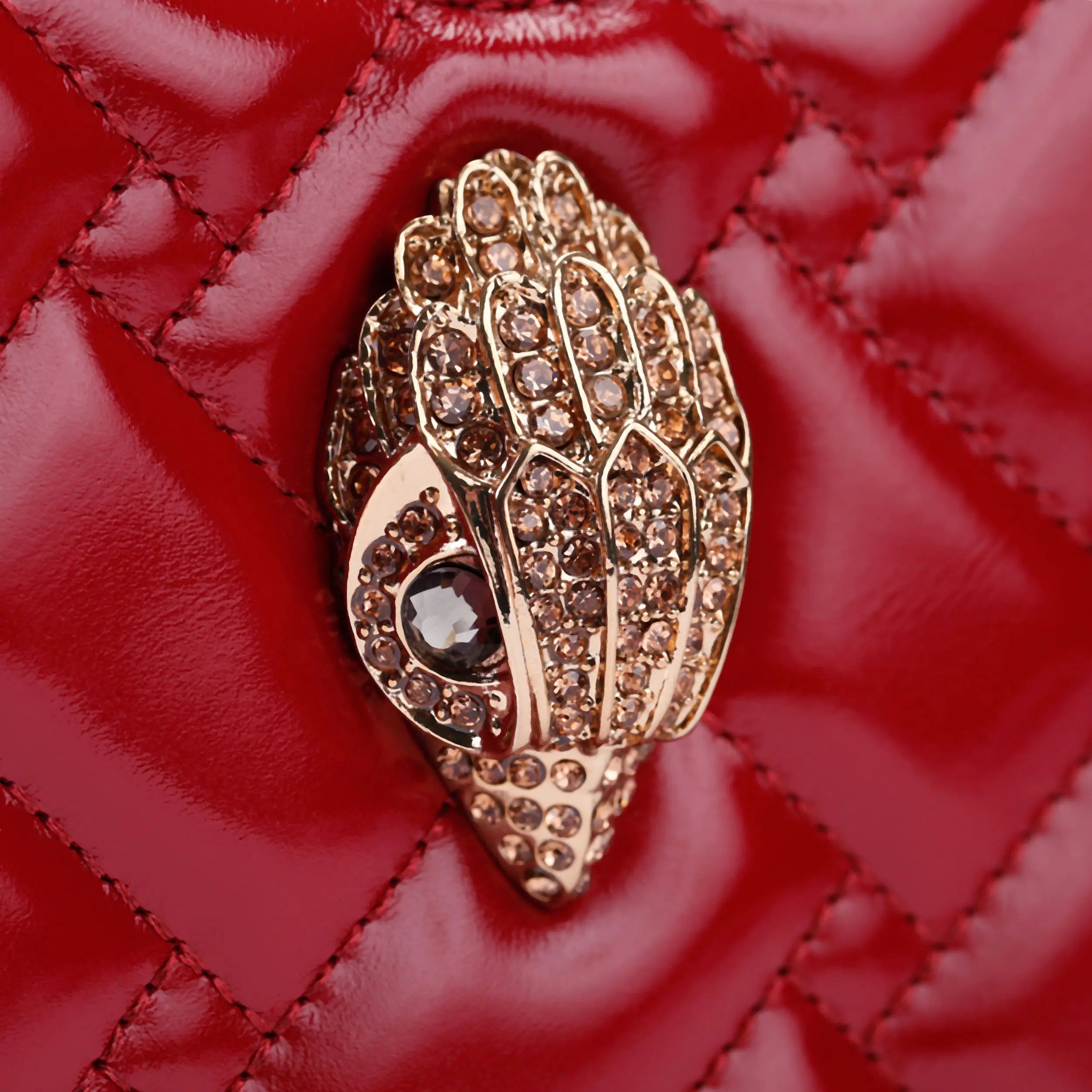 The Kensington Small Camera Drench is crafted from a red patent leather with overstitch weave pattern. The gold eagle head features crystals and black crystal eyes on the front flap.