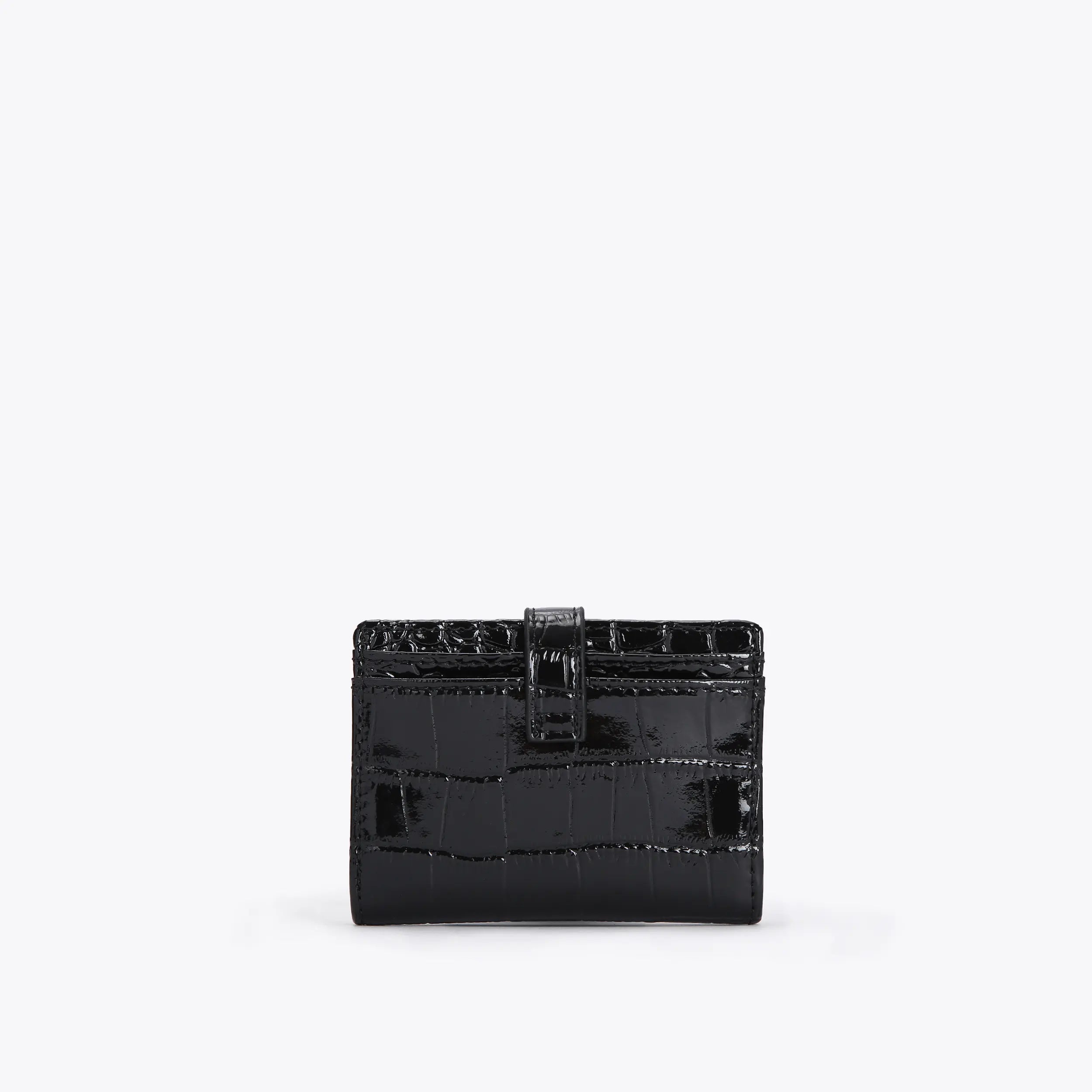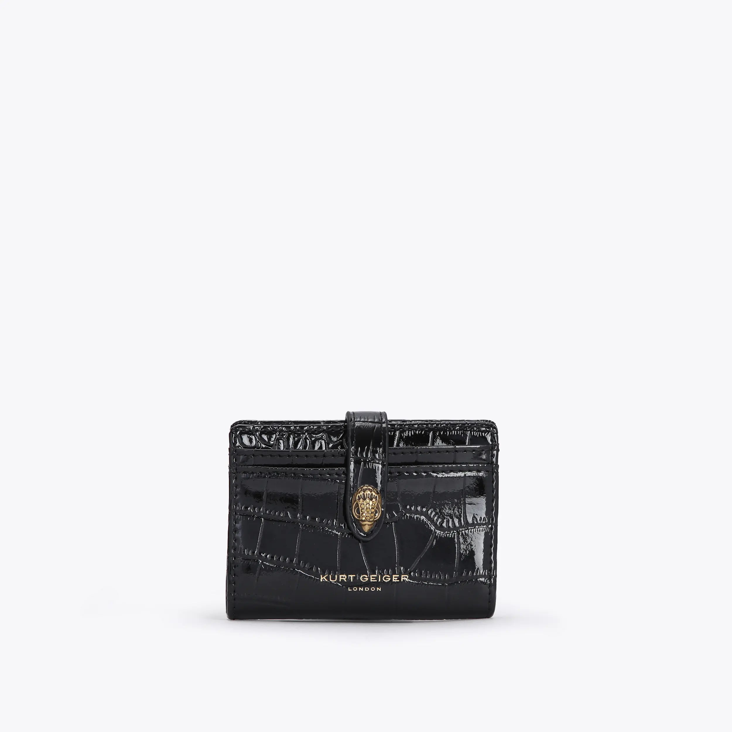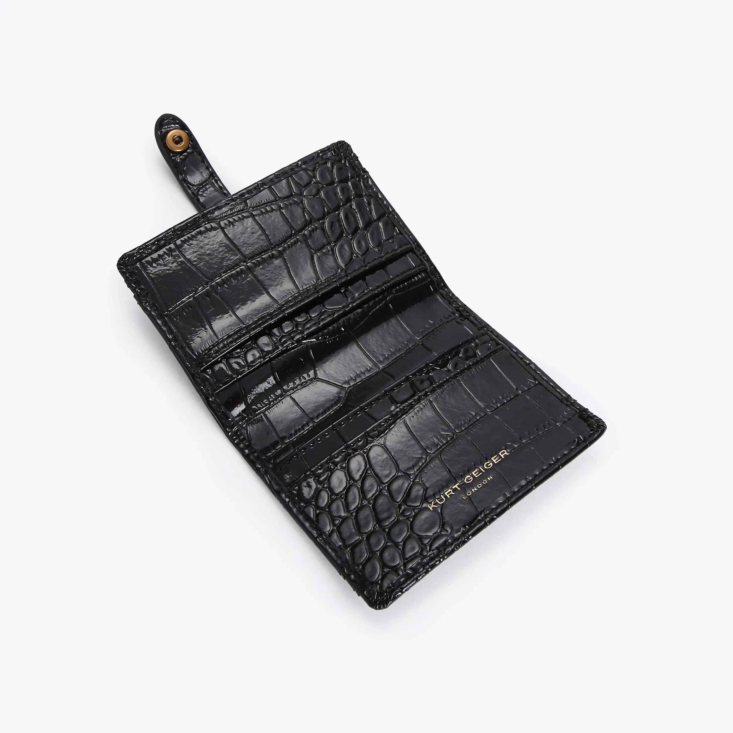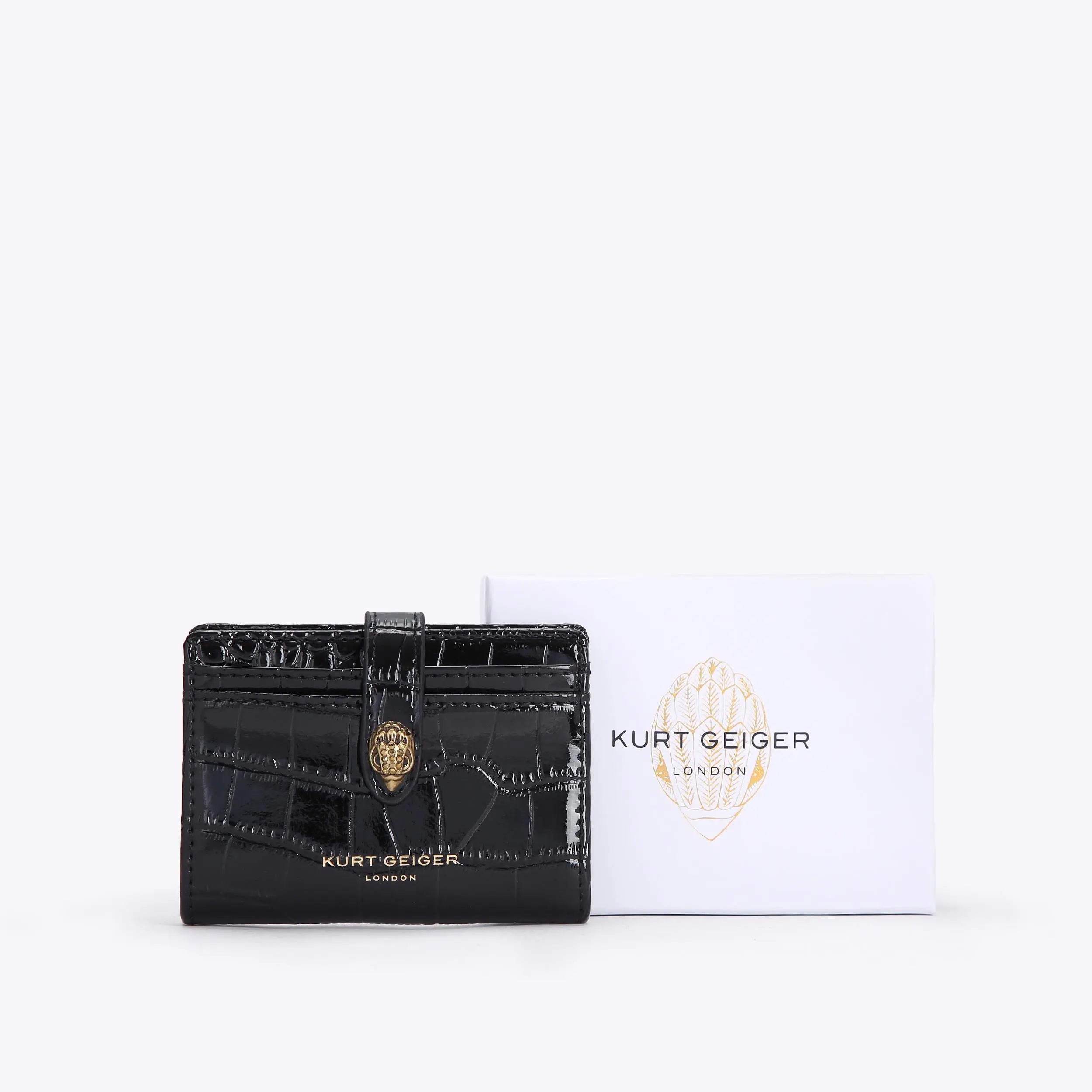 The Multi Card Holder is crafted from a croc embossed cow leather. The antiqued brass Eagle head features opaque brass crystals and black bead eyes which sits on the closure.