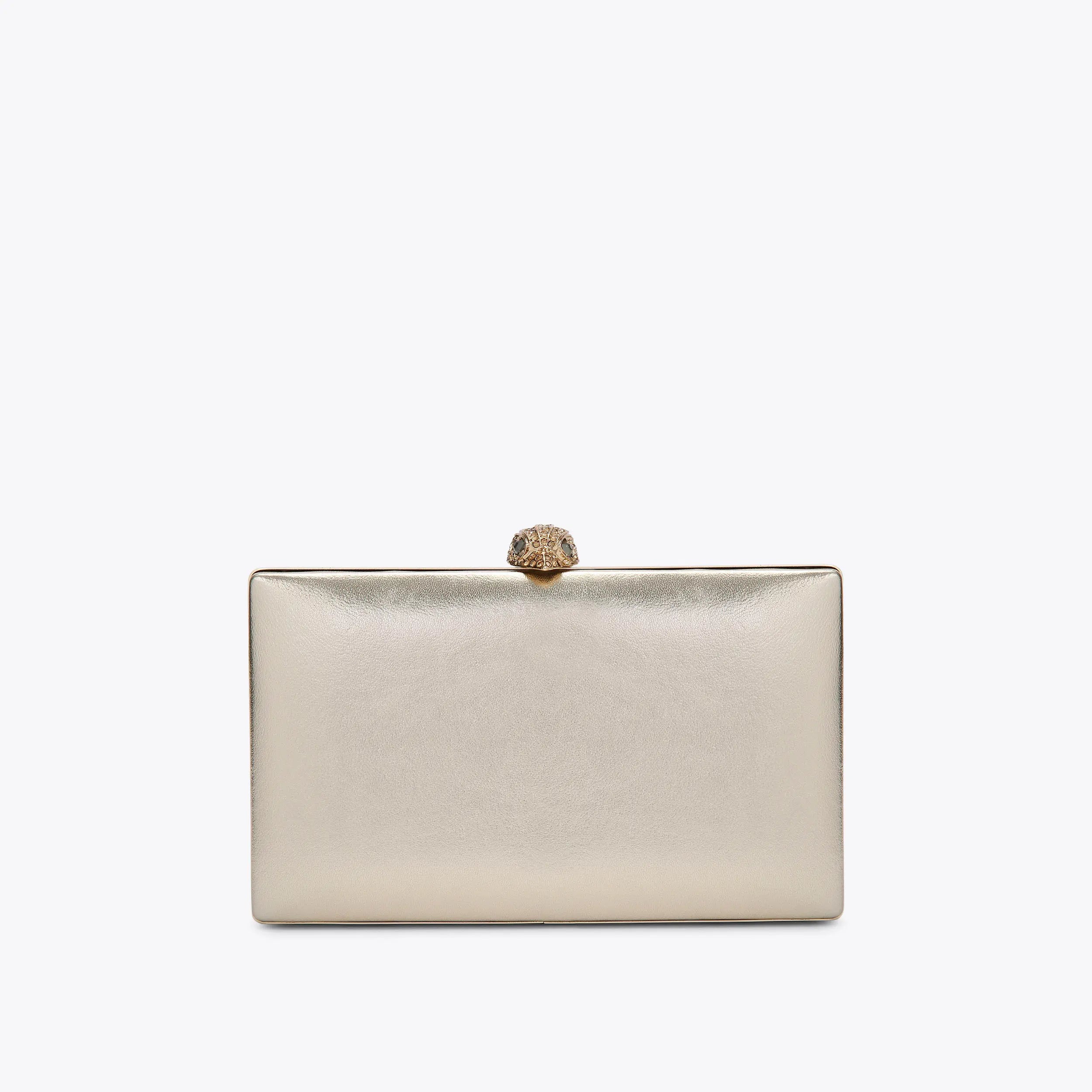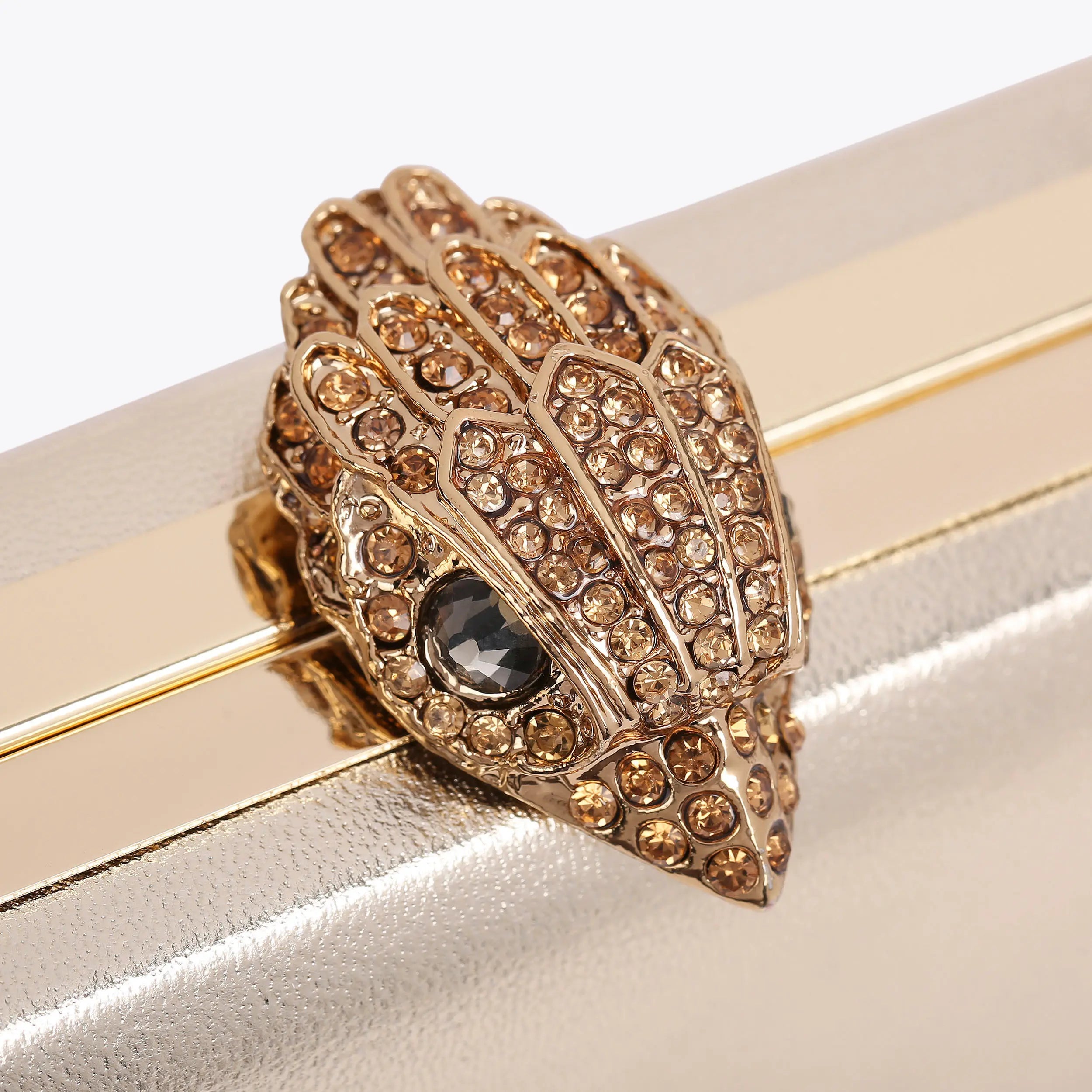 The Crystal Kensington Clutch is made from a gold leather. The gold Eagle head features crystals and clear bead eyes on the clasp.