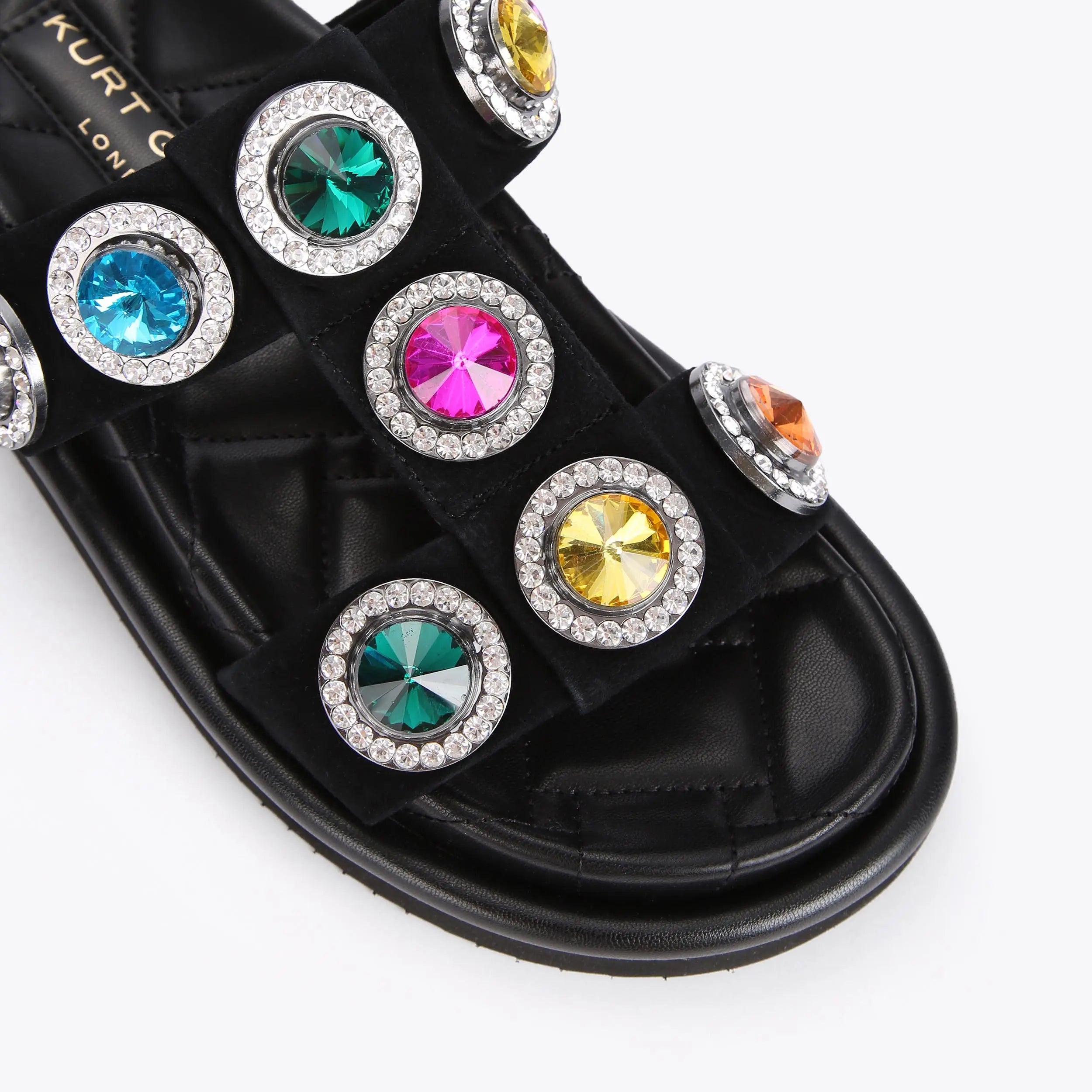 The Orson Crystal Sandal arrives in a black suede. The strap is topped with oversized multi-color crystals.