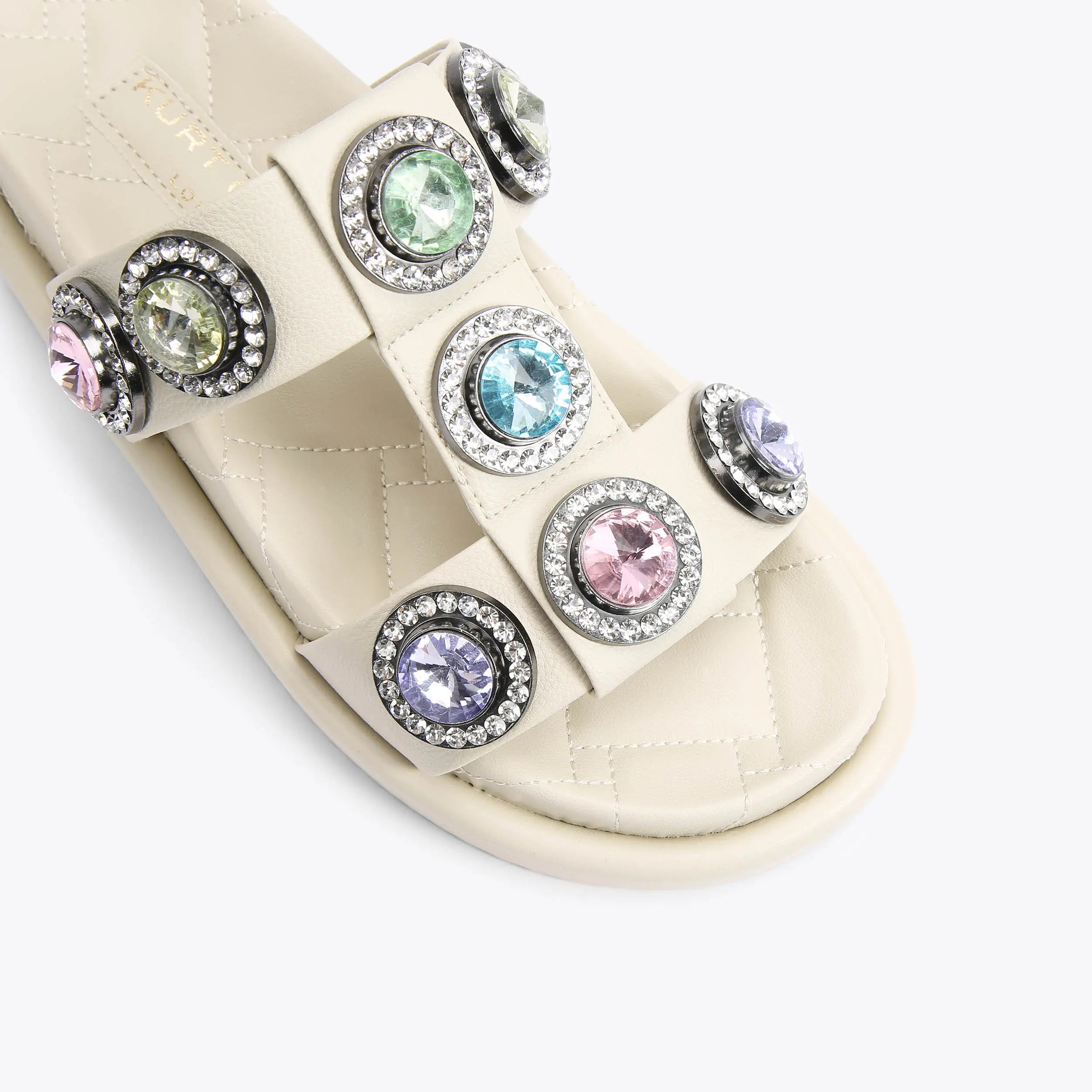 The Orson Crystal Sandal arrives in a sleek bone. The strap is topped with oversized multi-color crystals.