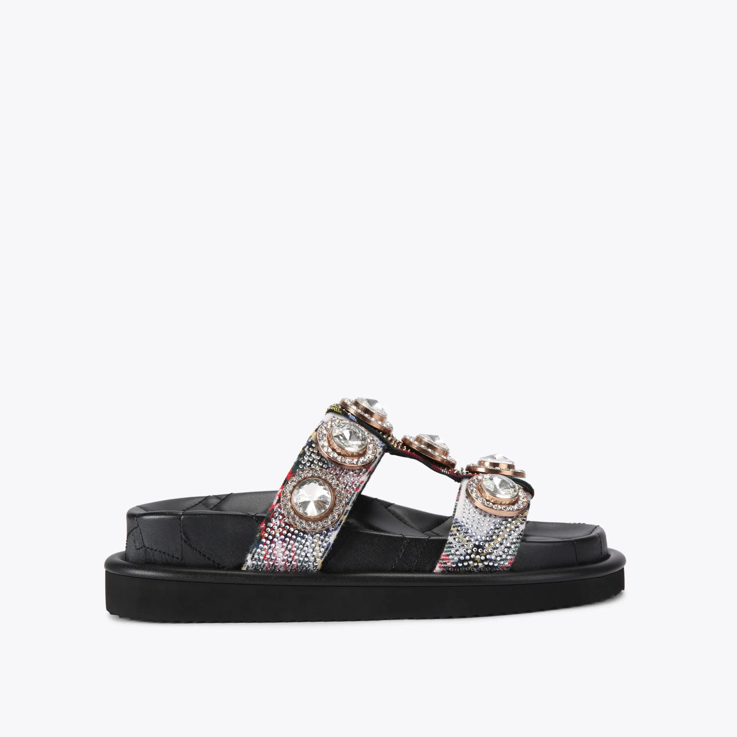 The Orson Crystal Sandal arrives in a tartan print fabric with embellishment. The strap is topped with large crystals.