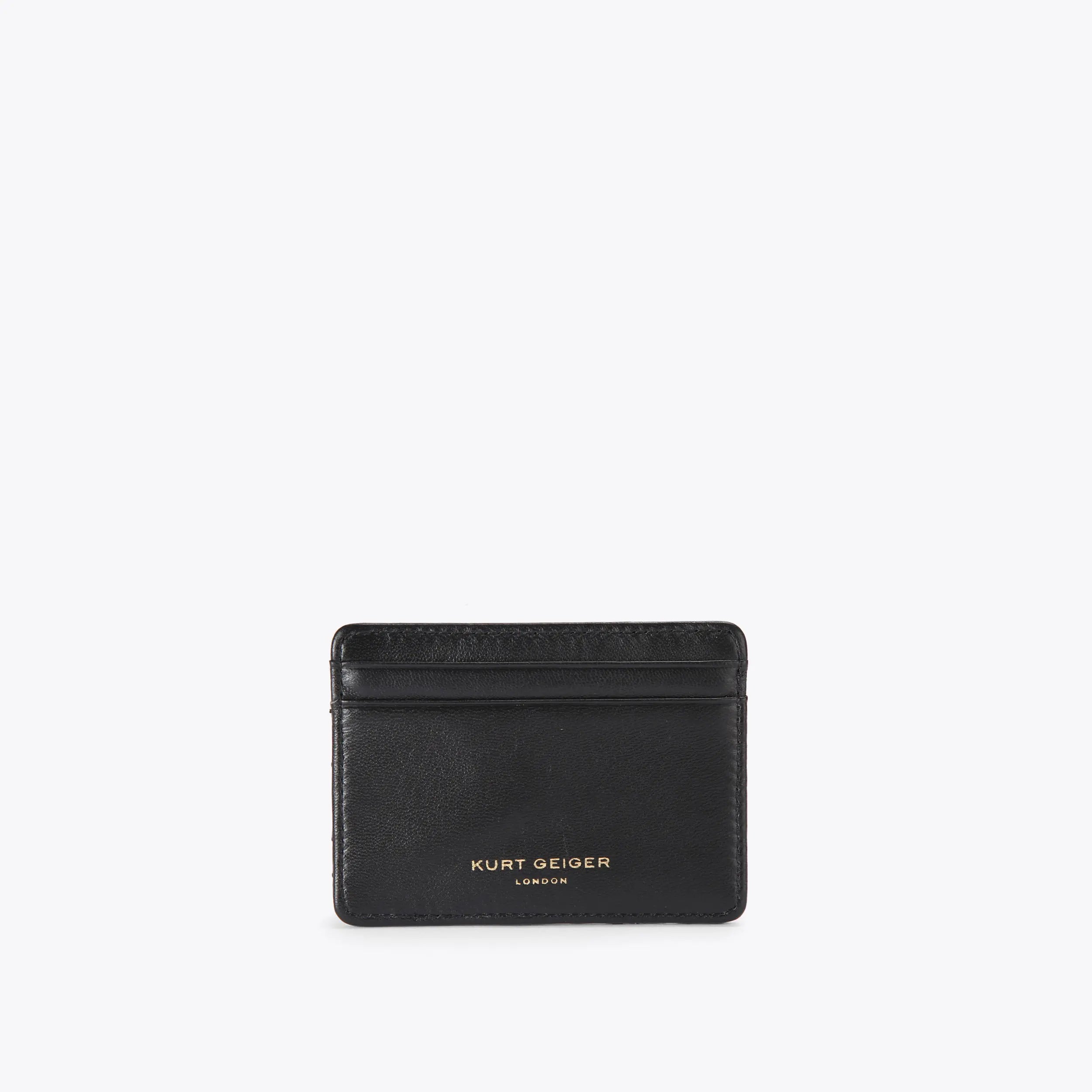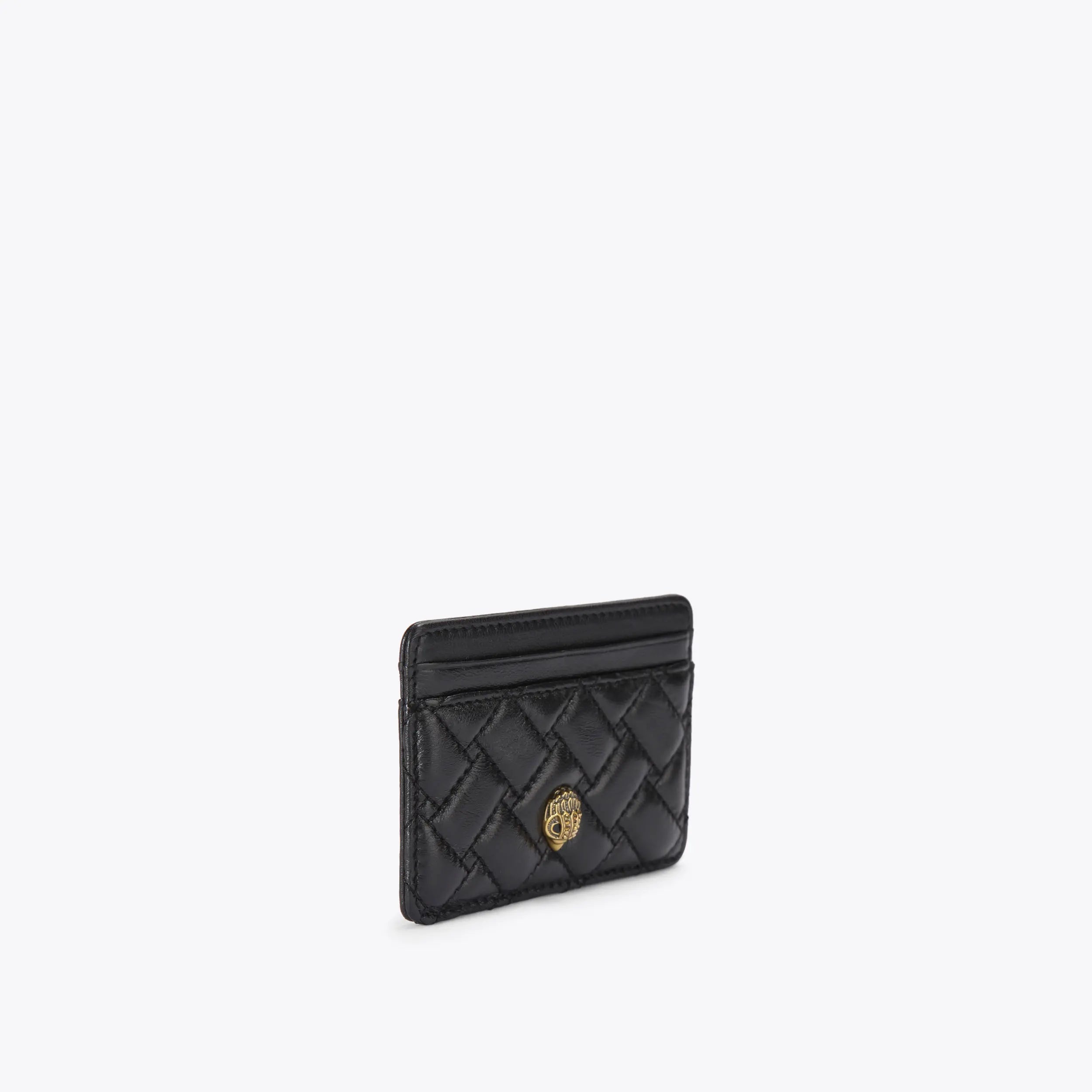 This Card Holder features a black leather exterior with overstitched weave design. The antiqued brass eagle head sits on the front with gold foil embossing on the back.