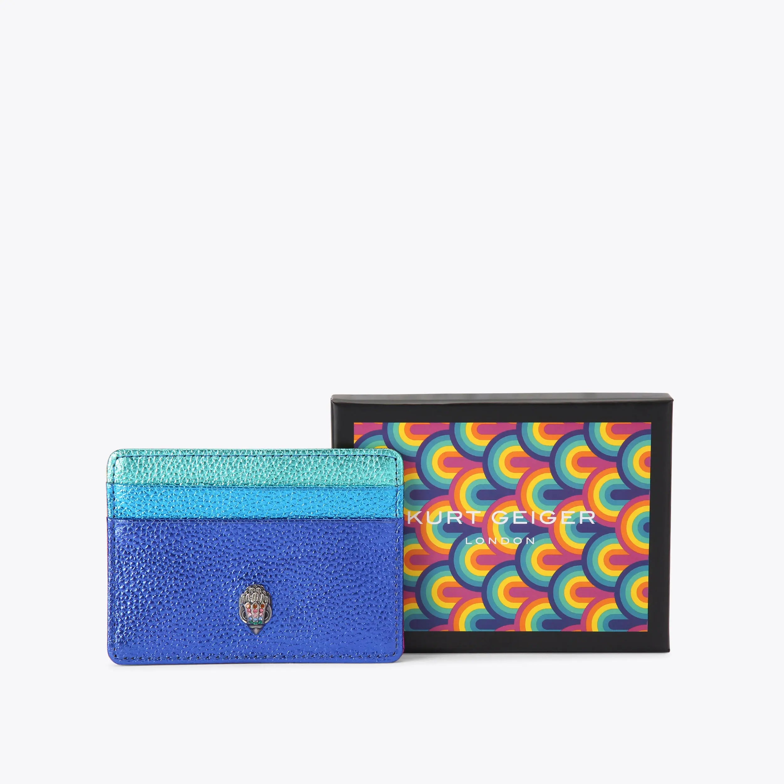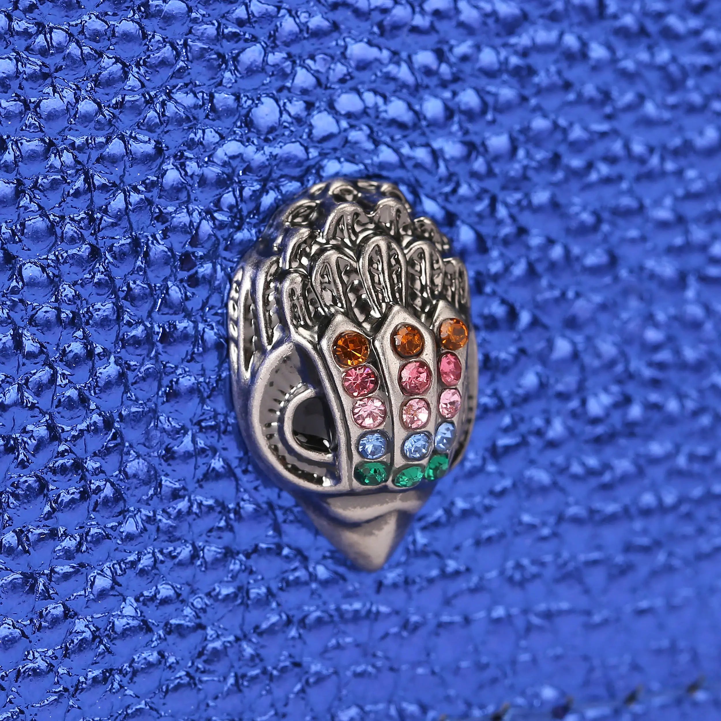 This Card Holder is crafted from a pebble grain blue leather. The antiqued brass eagle head features crystals on the front.