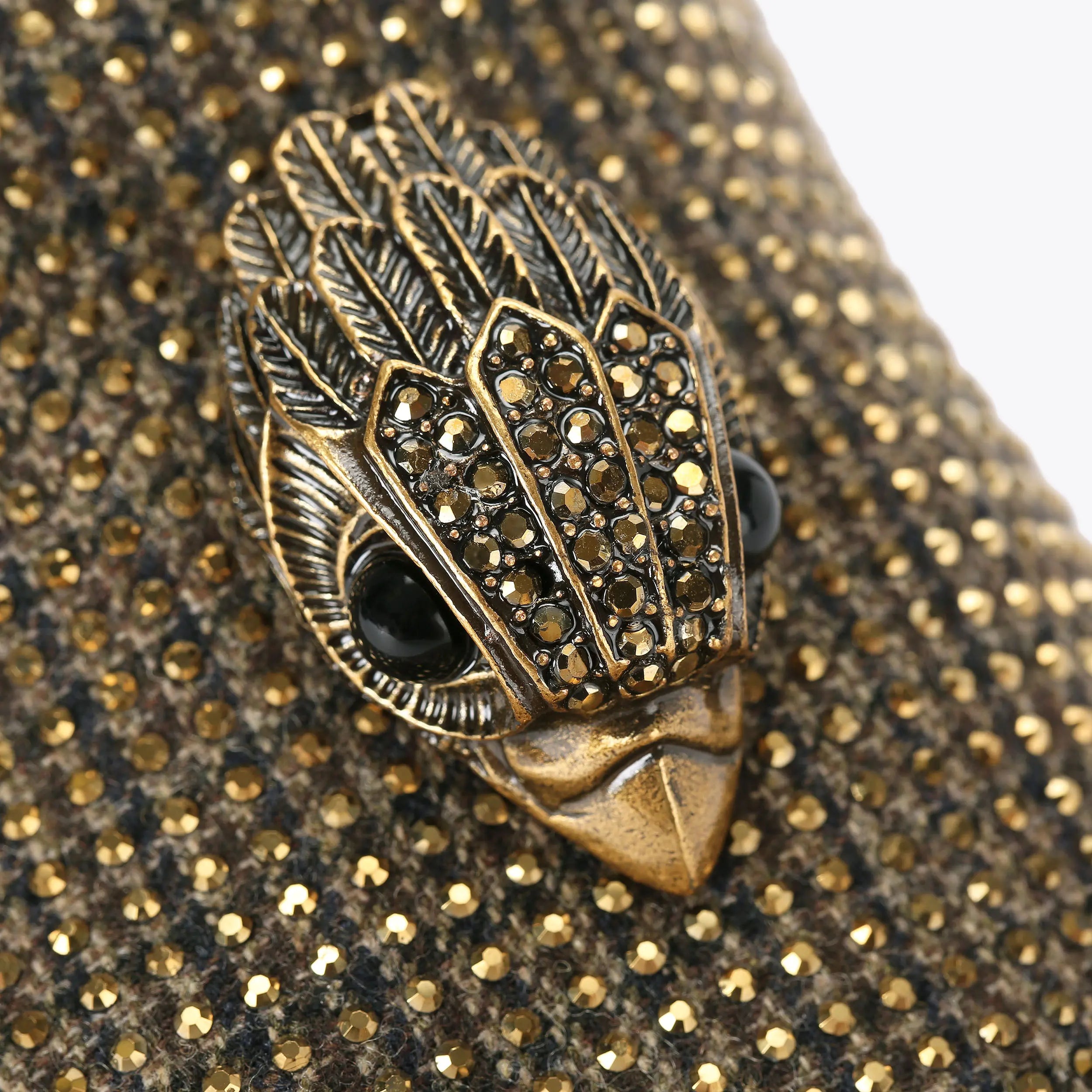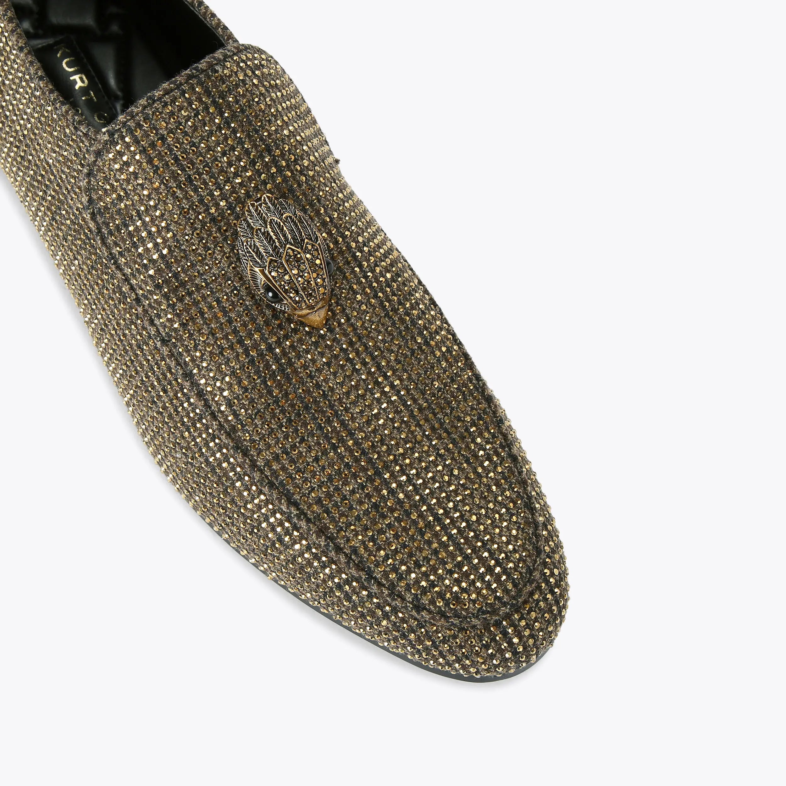 The Hugh Eagle is a slip on shoe with brown herringbone fabric upper that is embellished with gold crystals. The antiqued brass eagle head features crystals on the vamp.