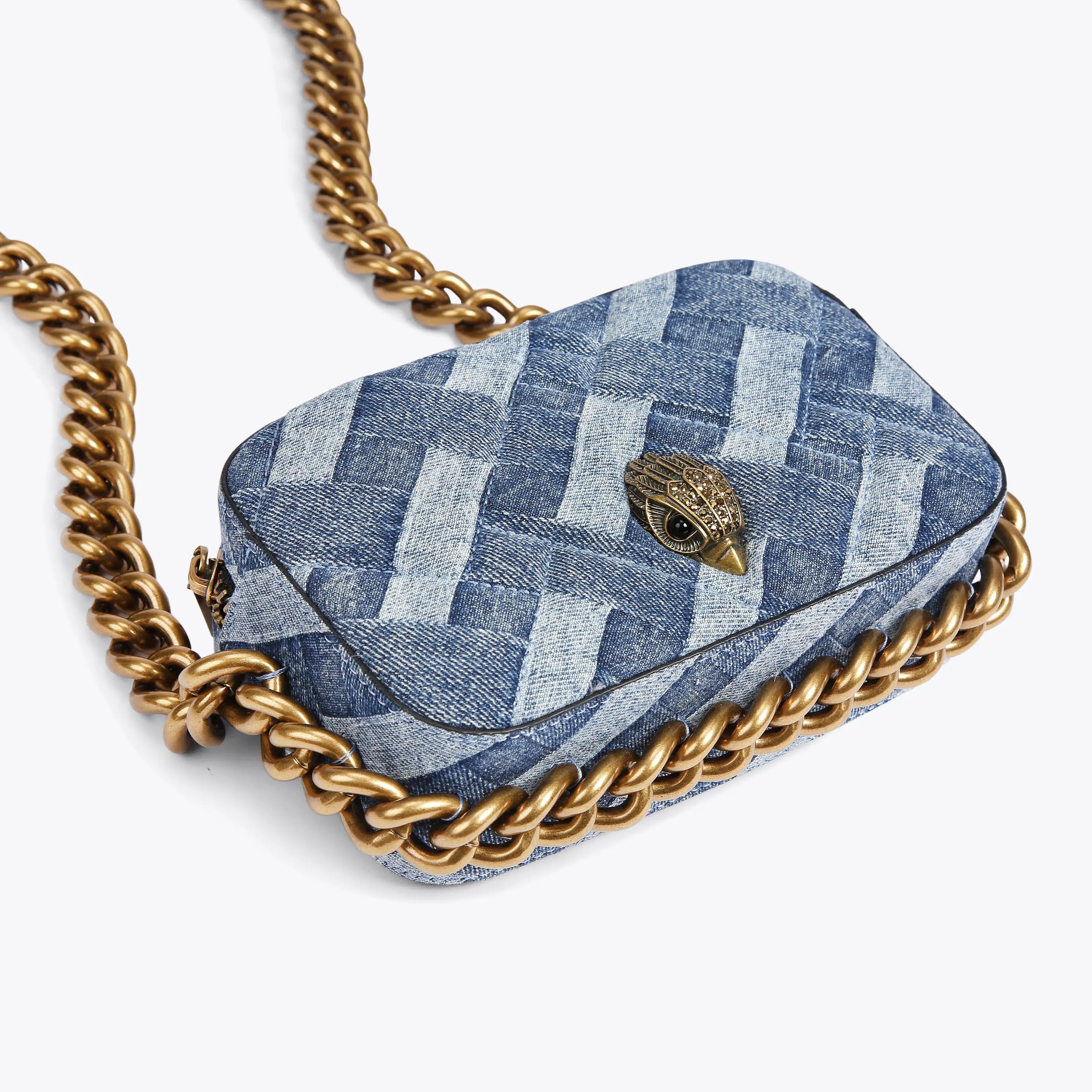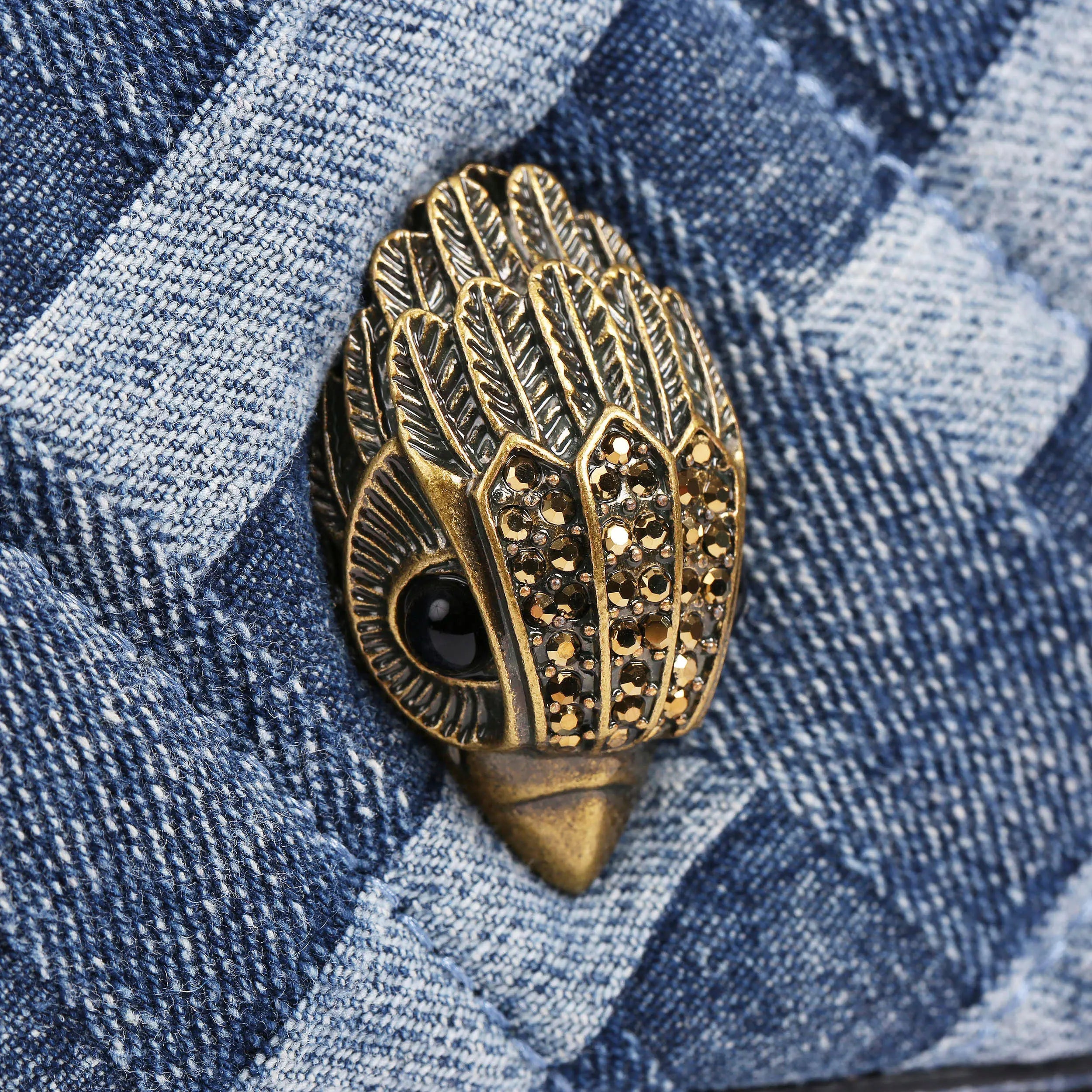 The Kensington Small Camera Chain is crafted from a blue denim with dyed weave pattern. The antiqued brass Eagle head features crystals and black bead eyes on the front flap.