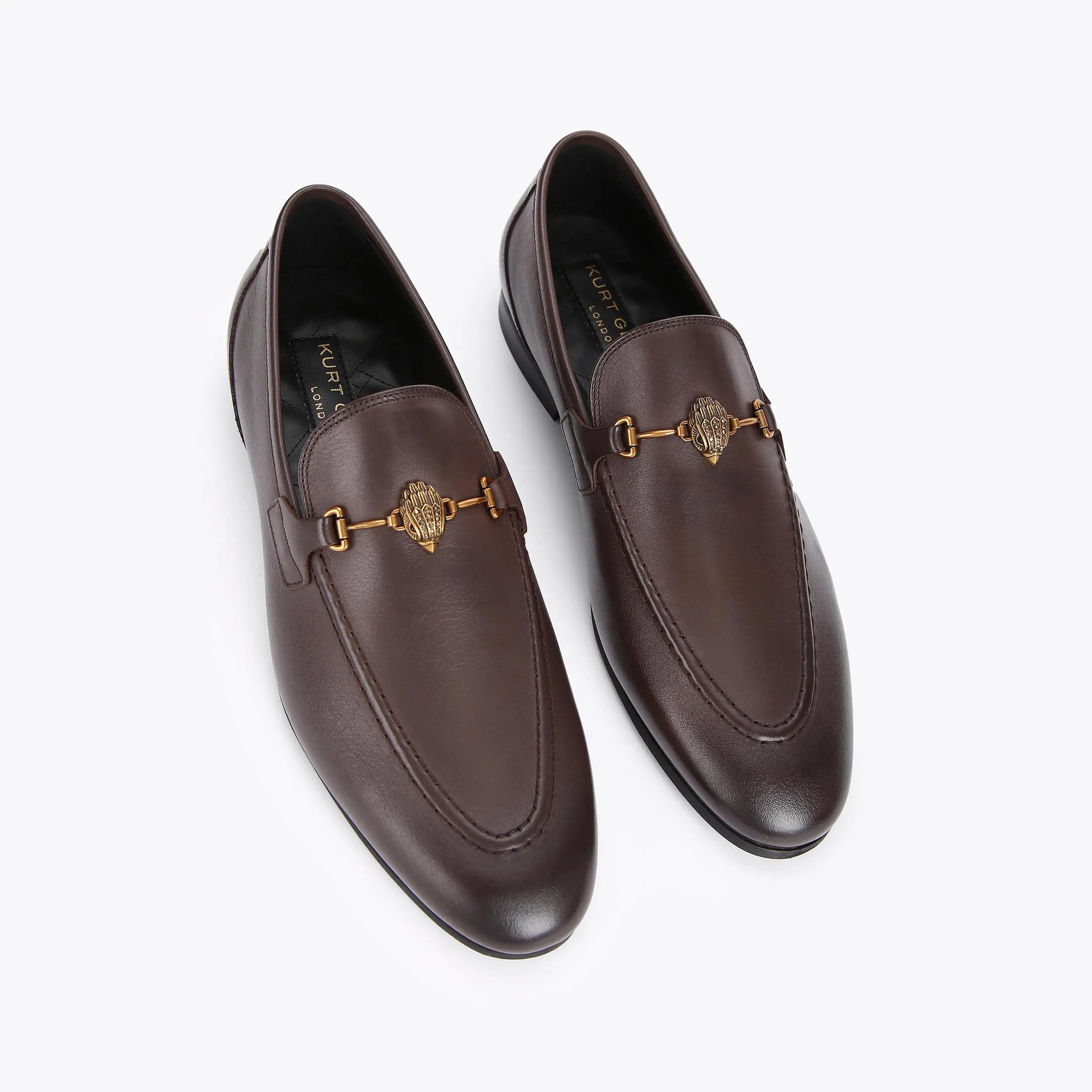 The Ali loafers feature a brown leather upper and classically rounded toe. The elongated vamp is adorned with black chain all sat on a black sole.