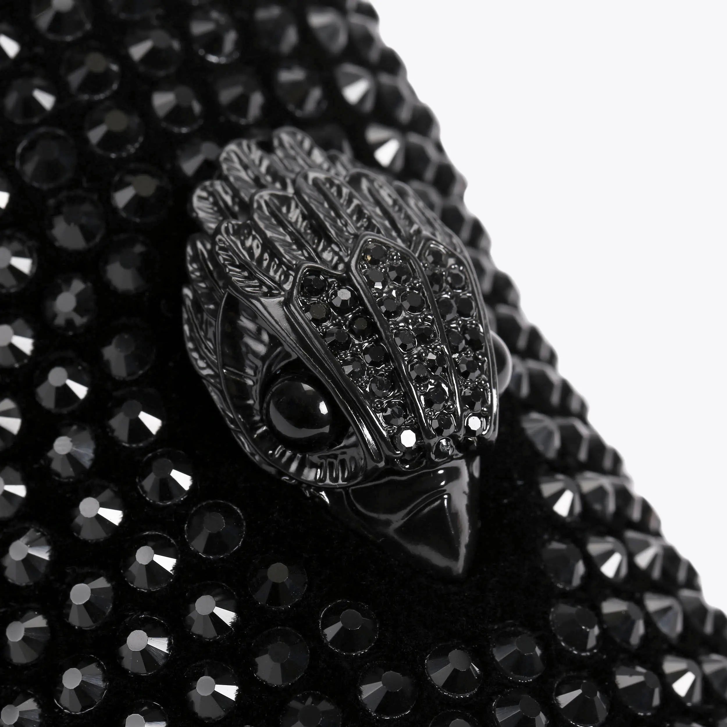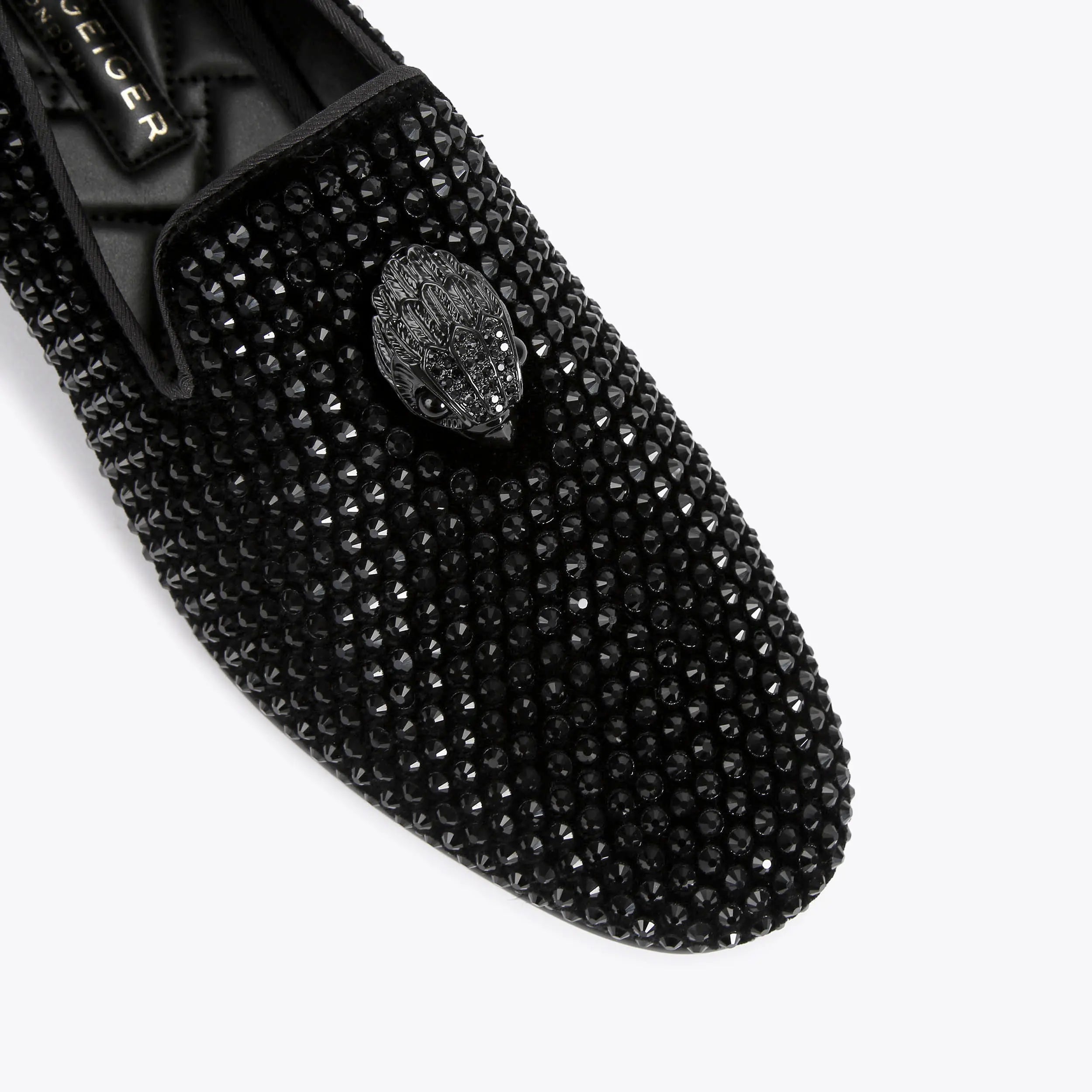 The Ace Stud are a velvet slip on loafer with black Eagle head with black crystals and bead eyes on the front vamp. There is also black crystal embellishments across the upper.