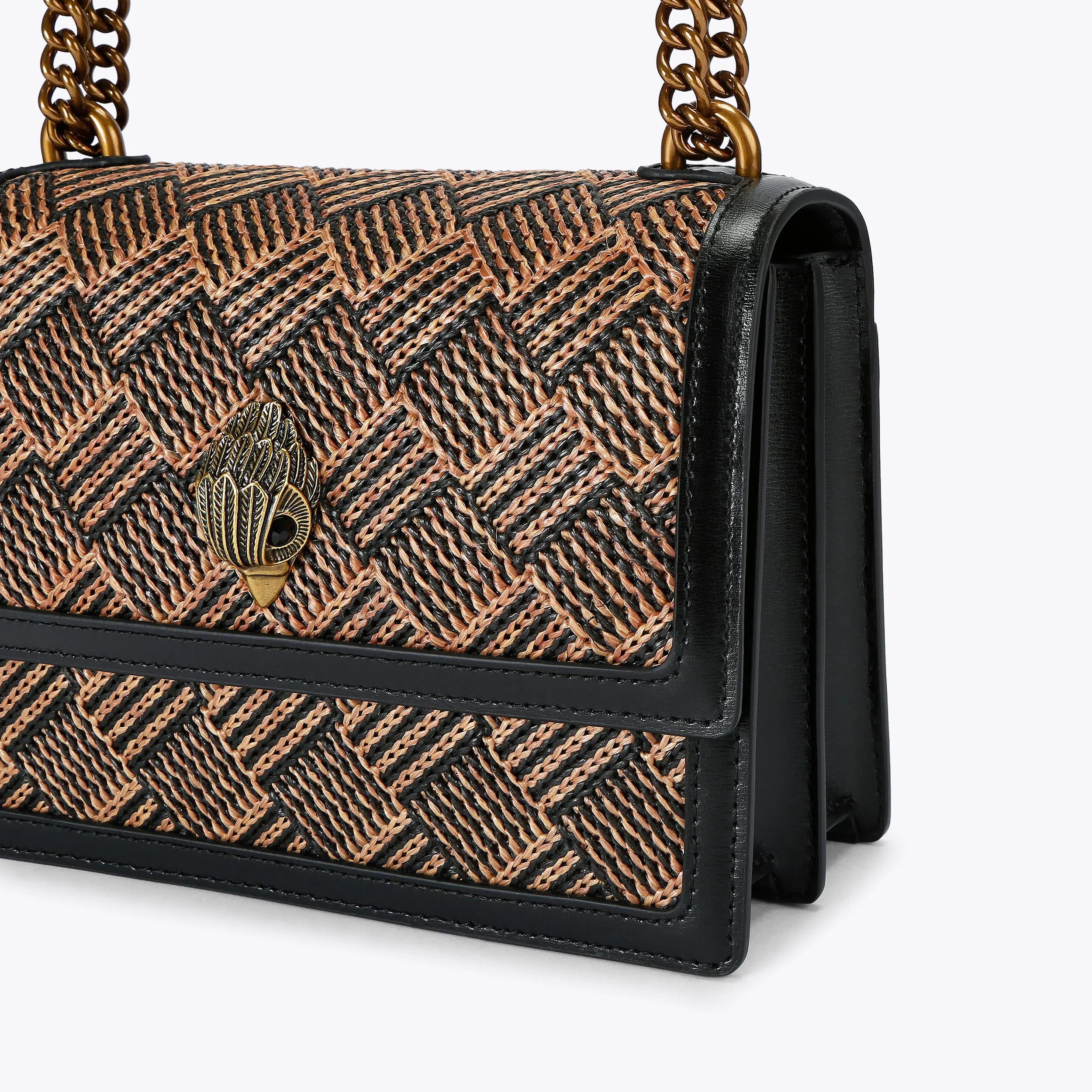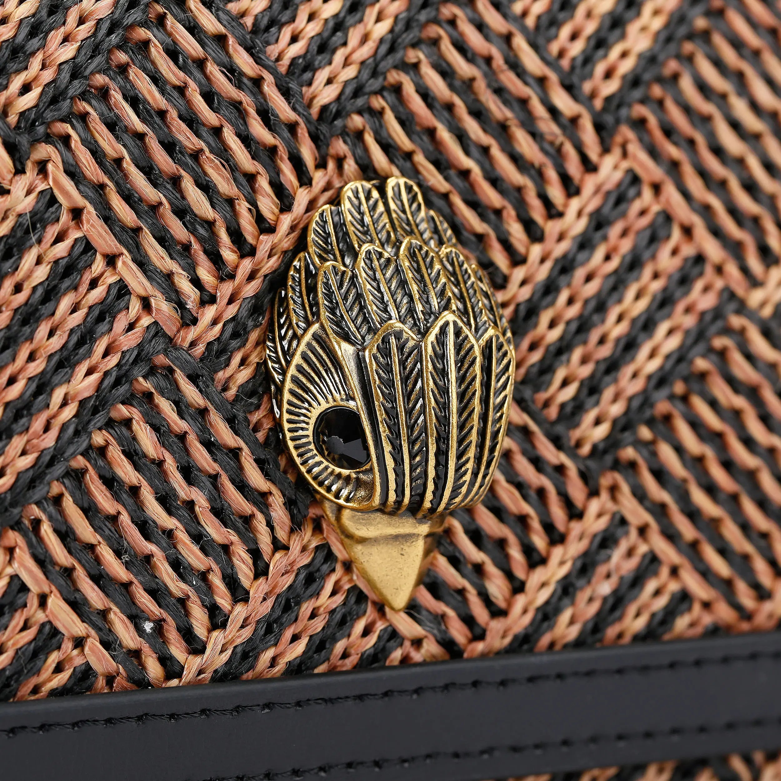 The Shoreditch Cross Body is crafted in a check woven style with black trims. The front flap is topped with an antiqued brass eagle head.