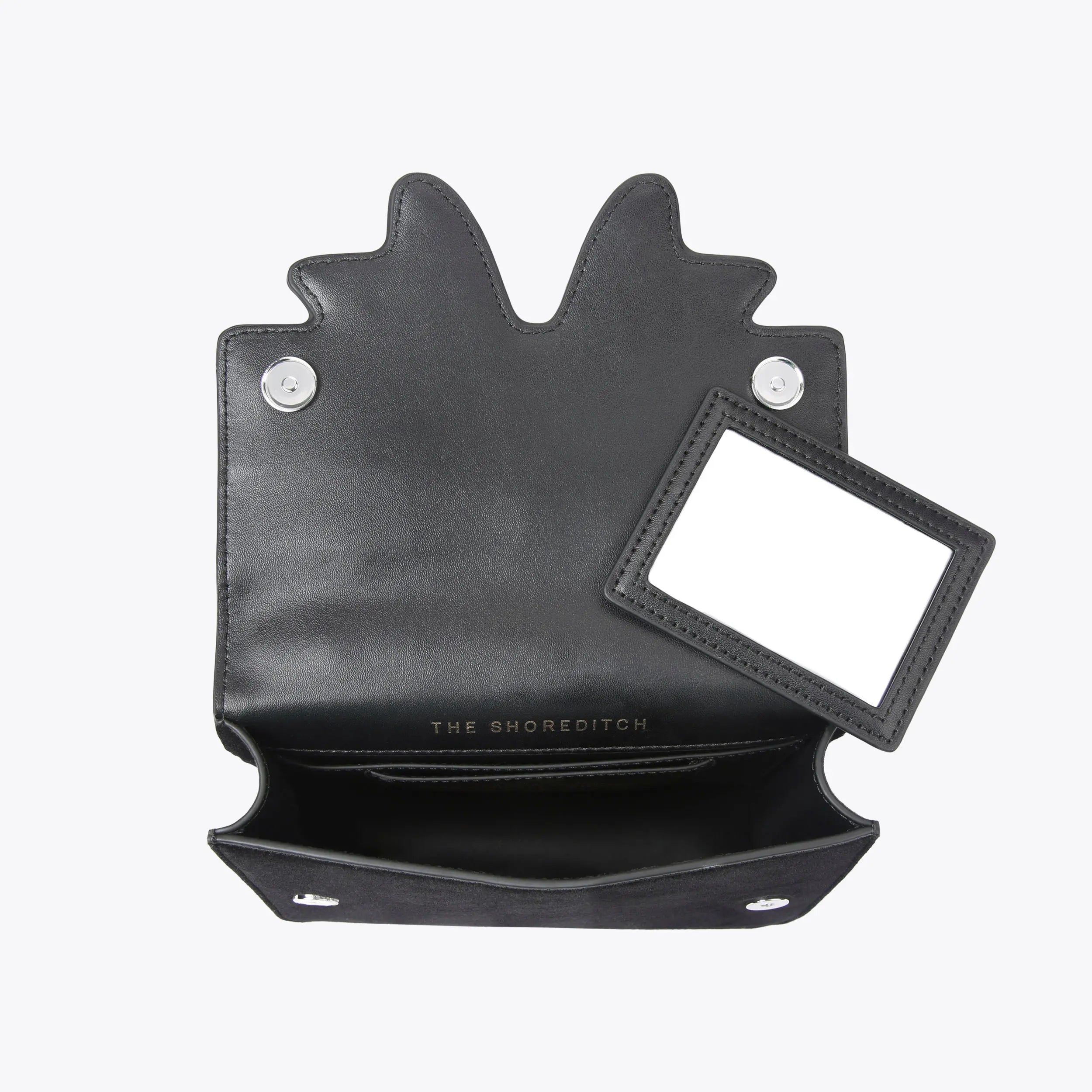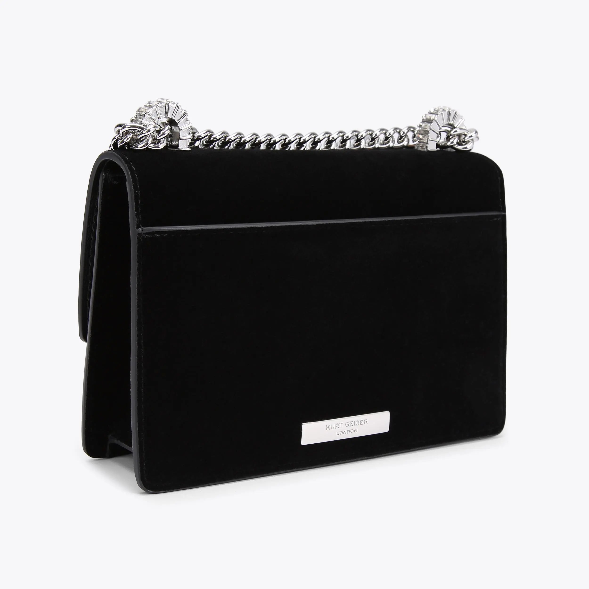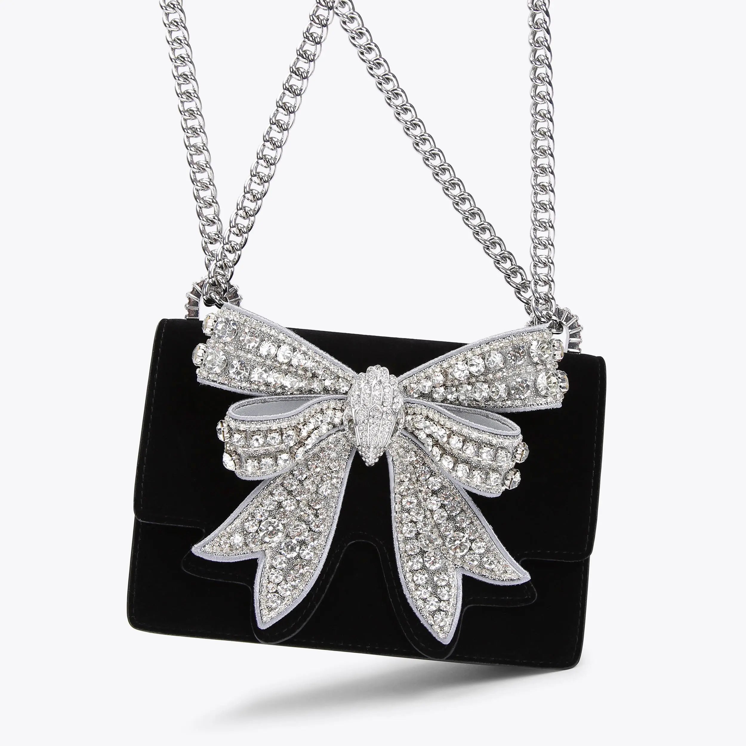 The Small Shoreditch Cross Body is crafted from a soft black velvet. The front flap is topped with crystal embellished bow with a silver Eagle head in the centre.
