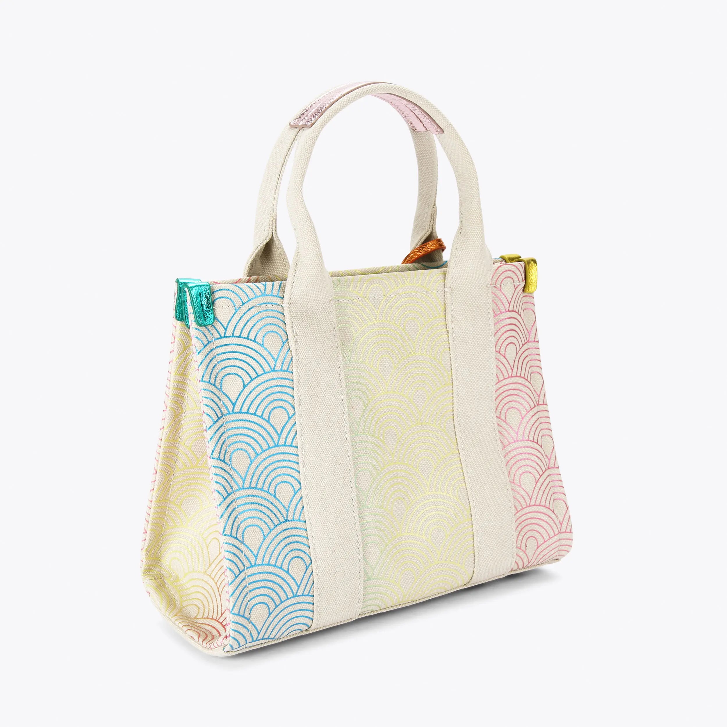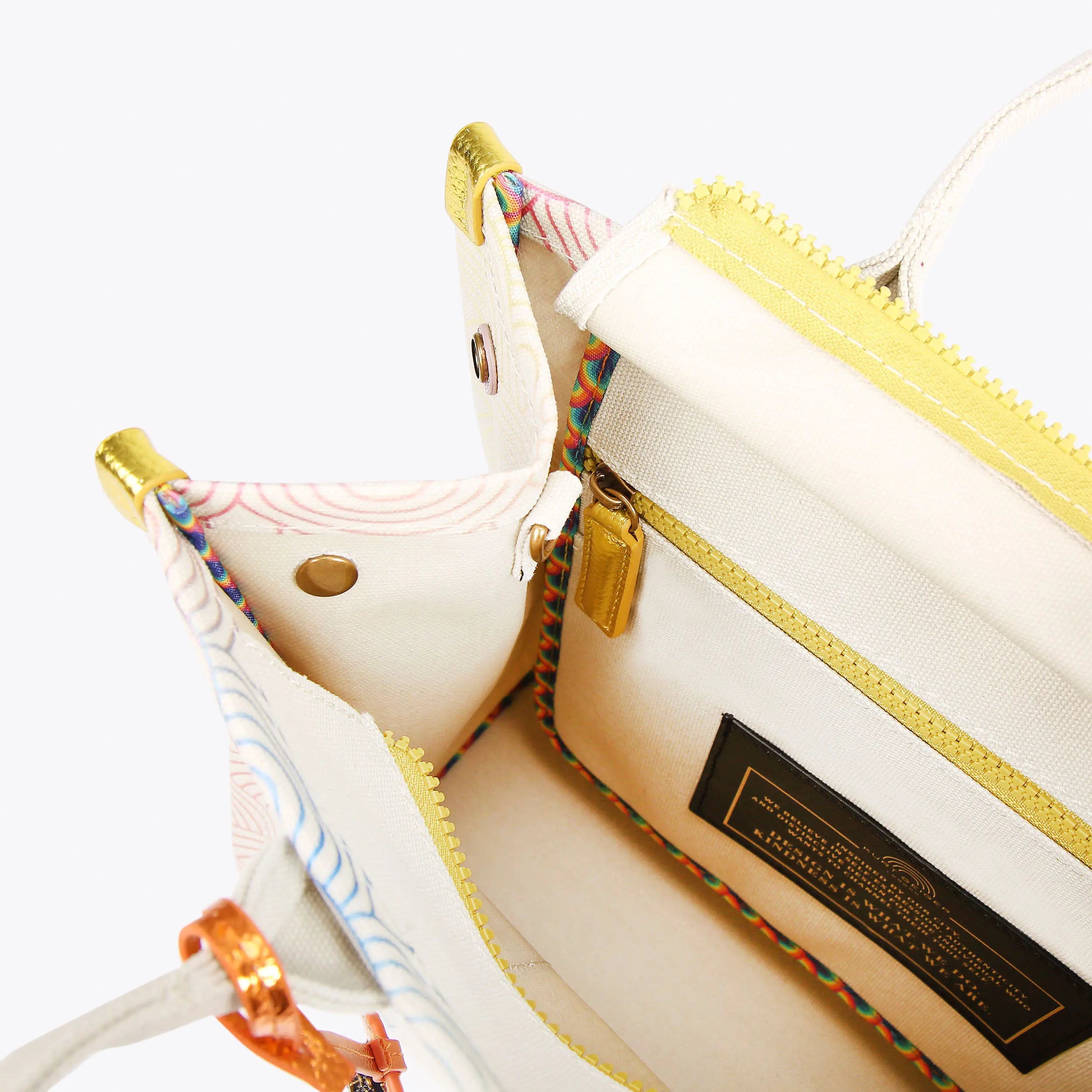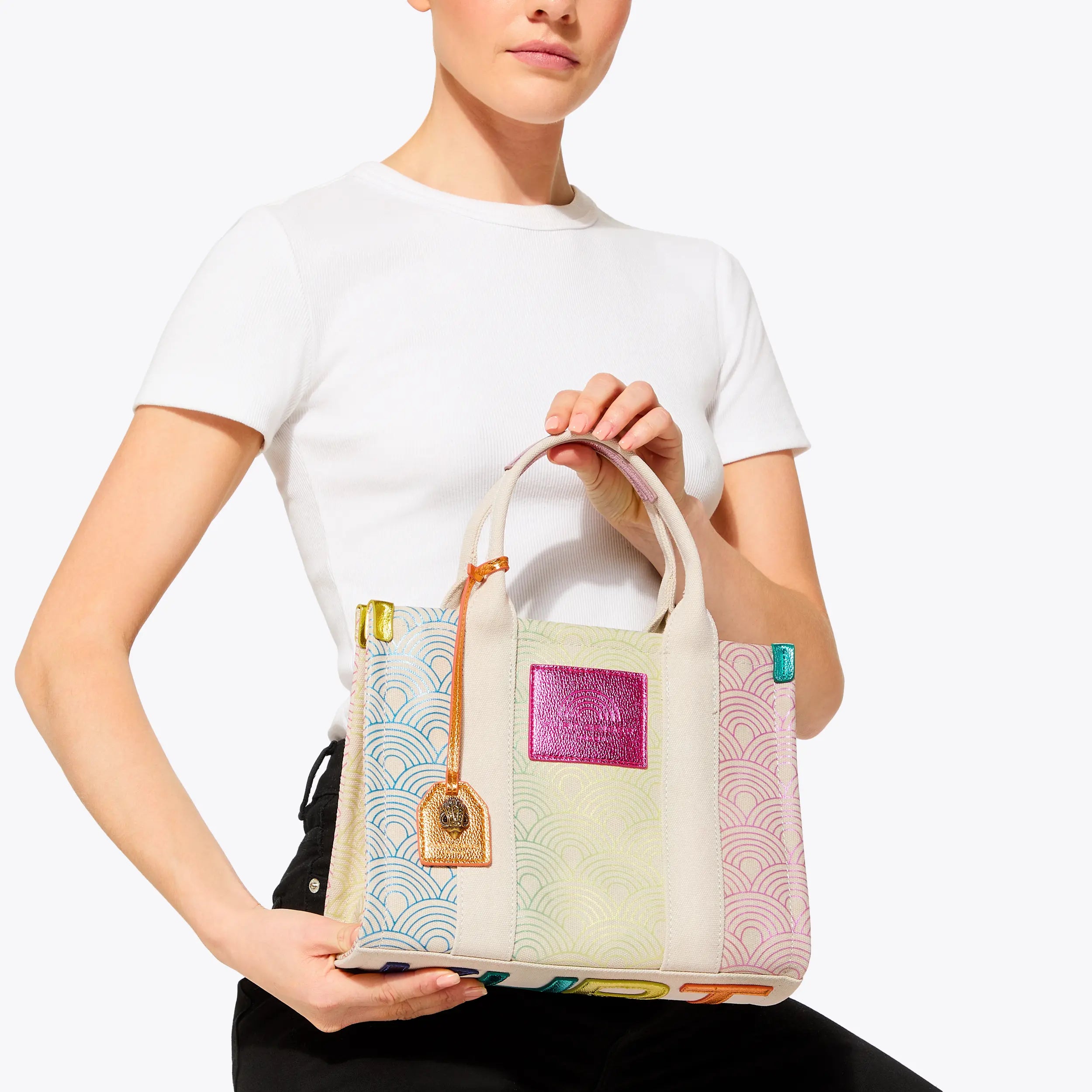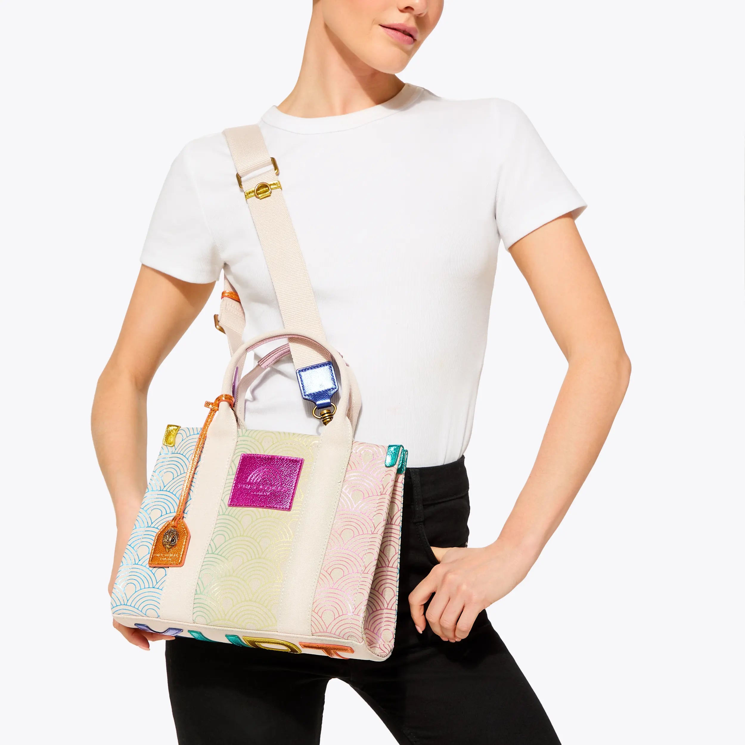 The Small Southbank Tote is crafted in a canvas with outline ombre rainbow print. There are metallic multi-color trims as well as antiqued brass Eagle head with crystals on the tab.