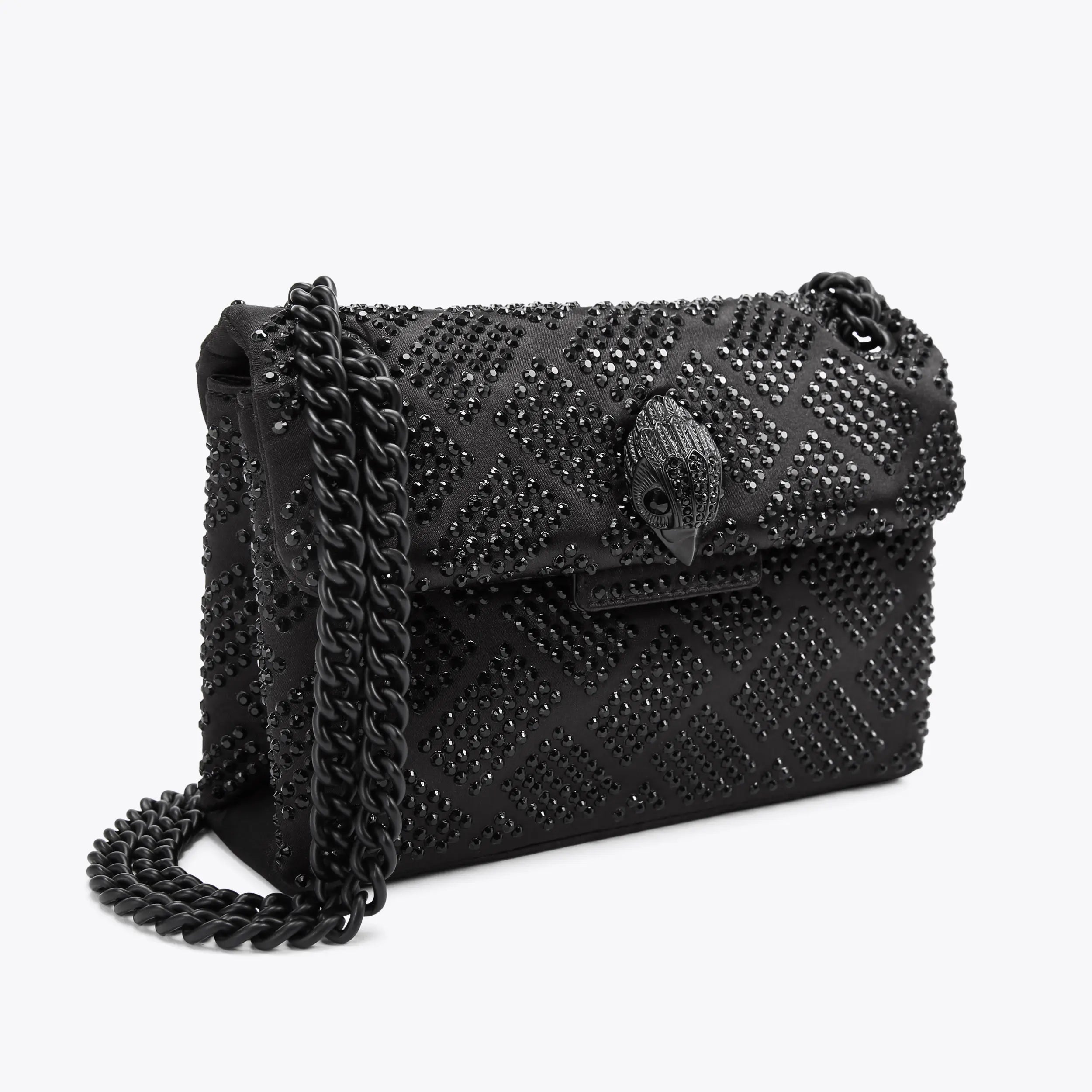 The Fabric Mini Kensington purse is crafted from a black fabric with crystal embellishment in the Kensington quilting pattern. The black Eagle head features crystals and black bead eyes on the front flap.