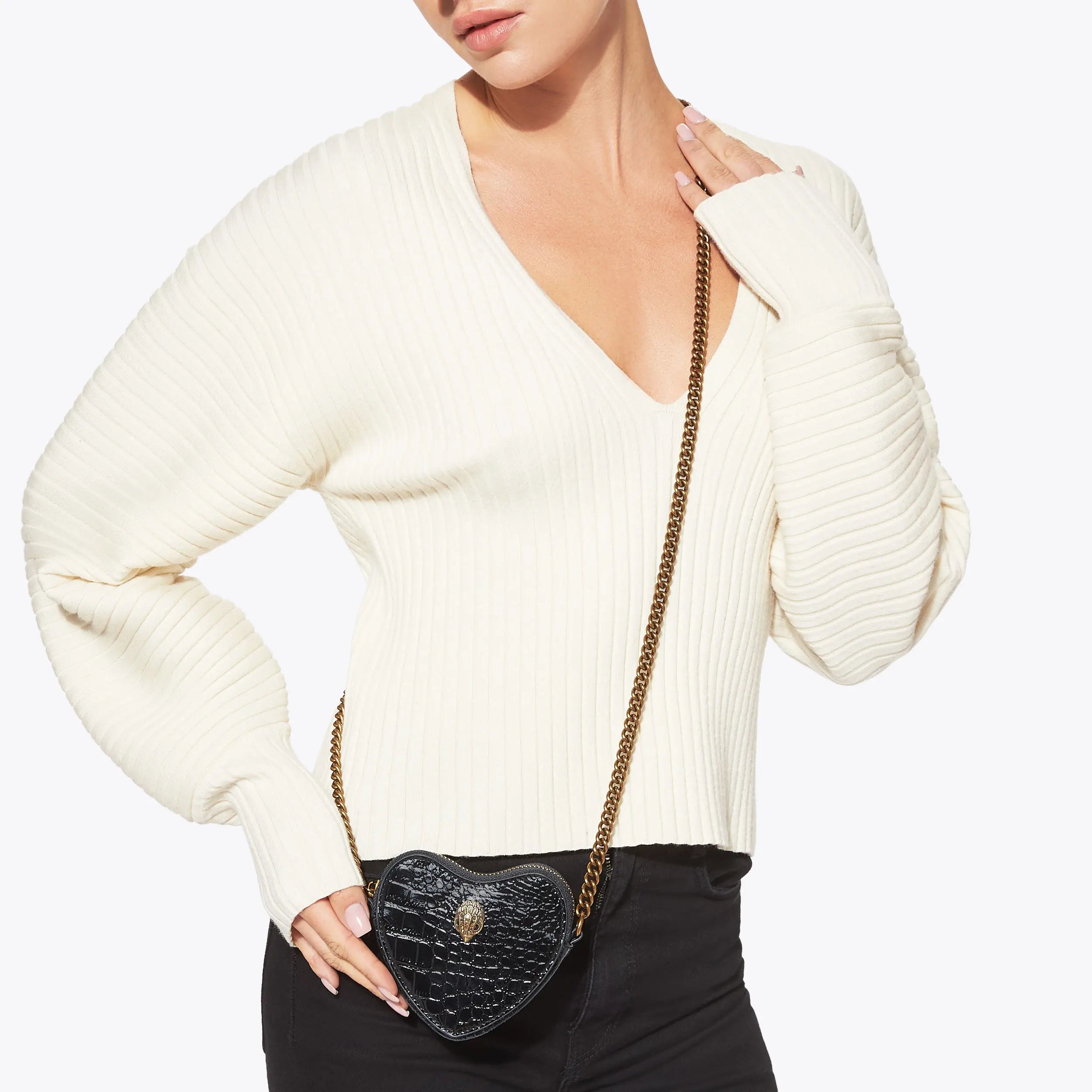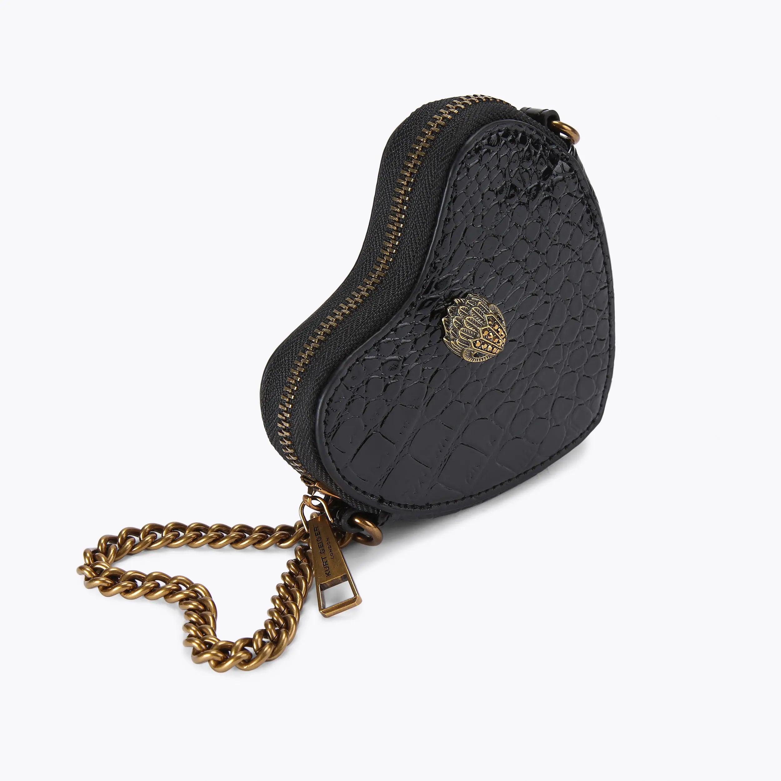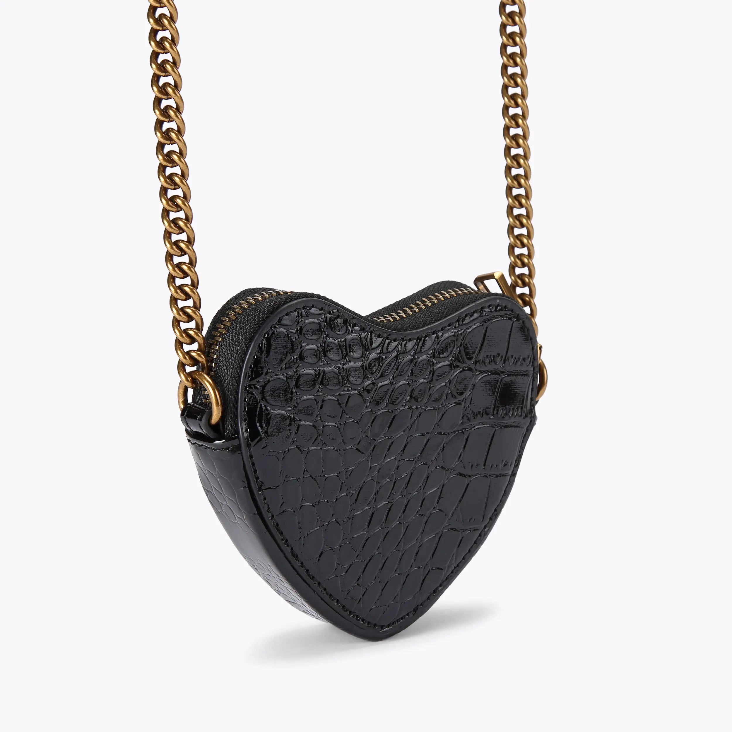 The Micro Heart Cross Body is crafted from a patent croc embossed leather. The antiqued brass Eagle head features opaque brass crystals and black bead eyes on the front. 4.3in (H), 4.7in (L), 1.1in (D). Strap drop cross body: 50.7in.