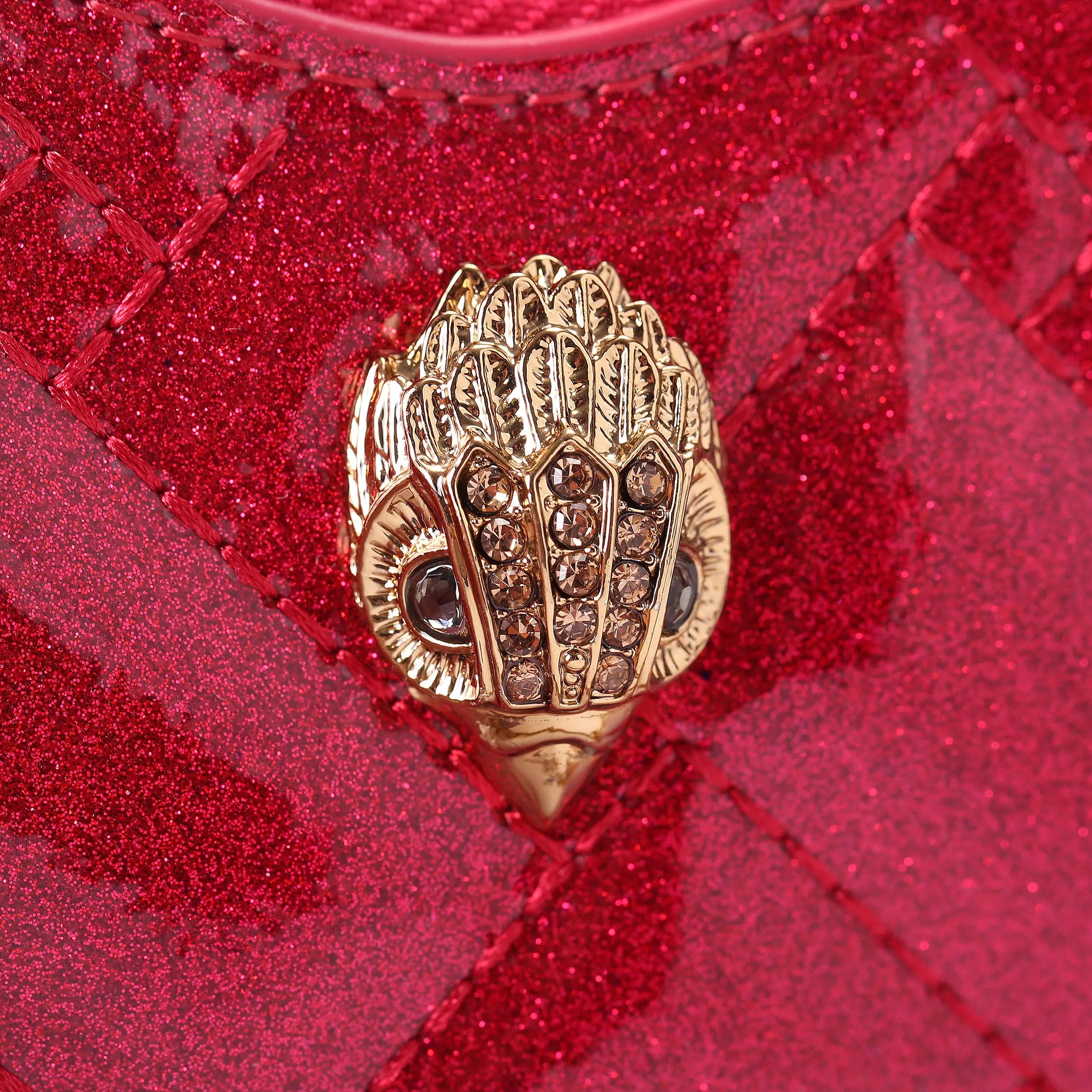 The Micro Heart Cross Body is crafted from a red glitter coated with vinyl. The shiny brass eagle head features crystals on the front.