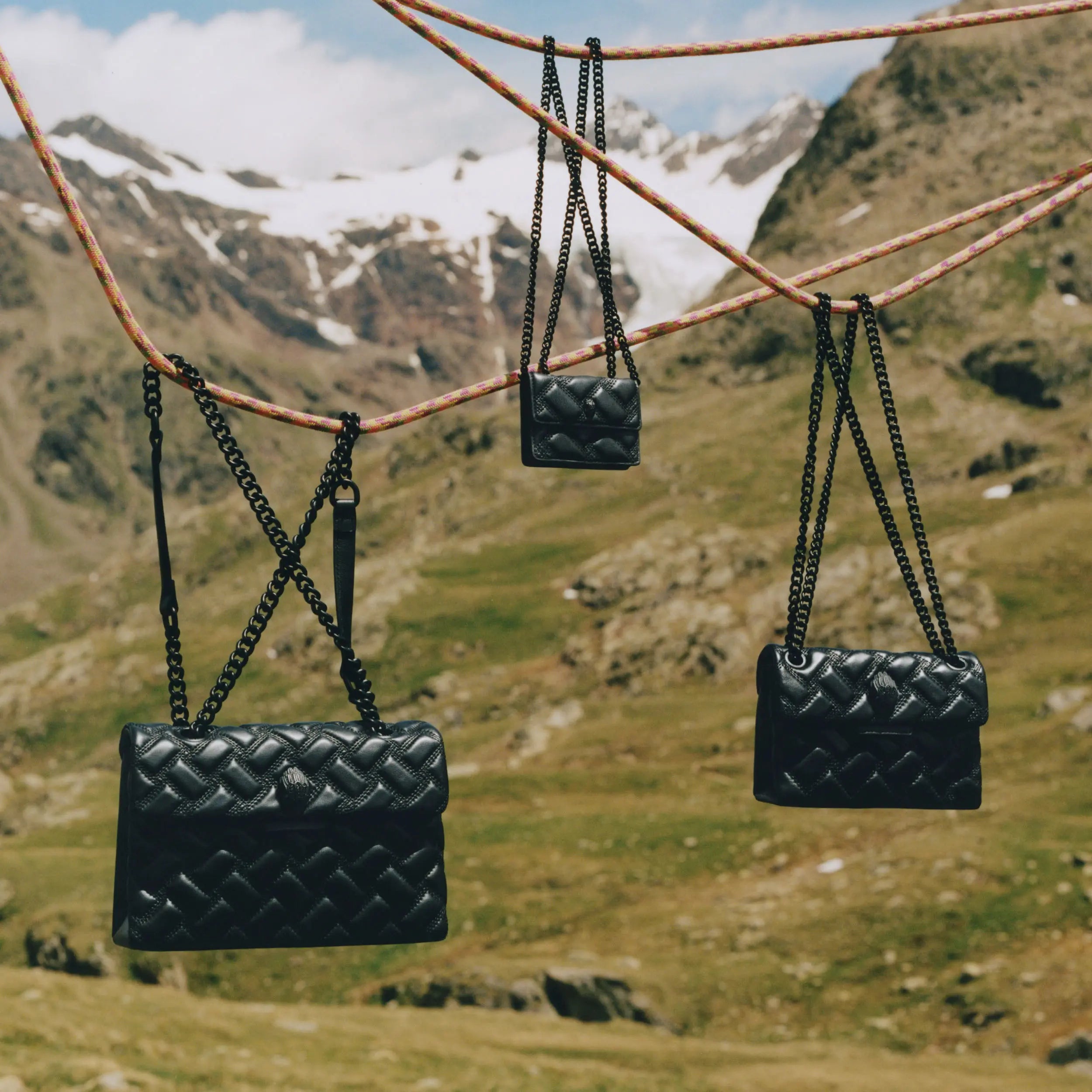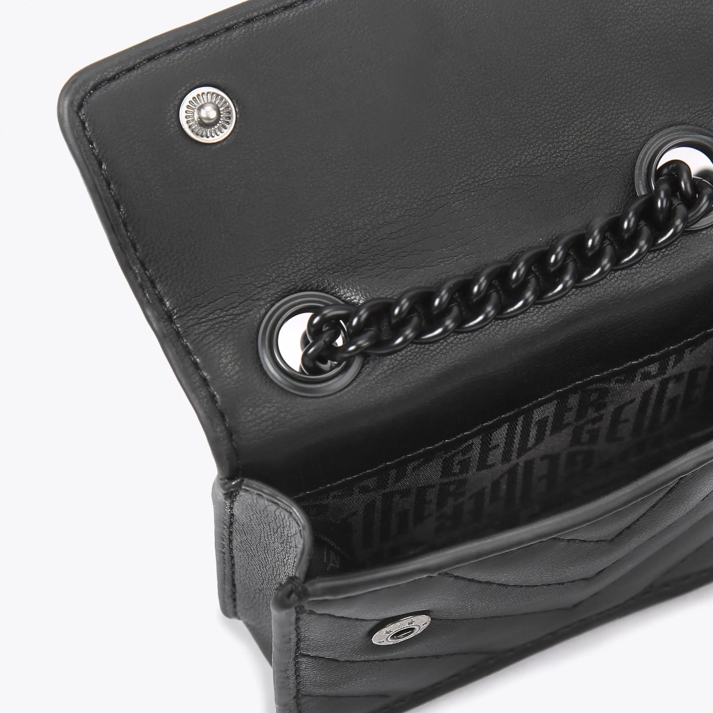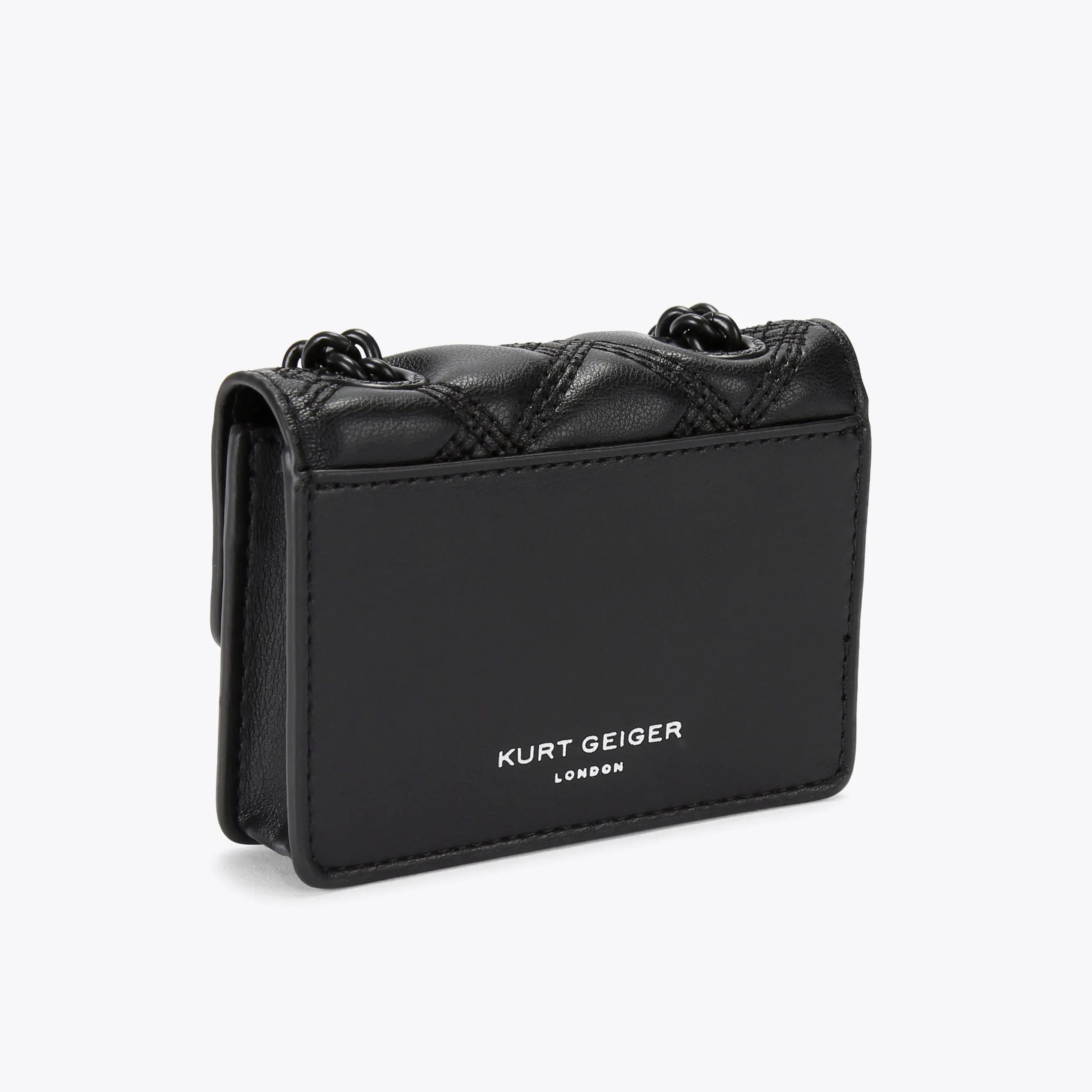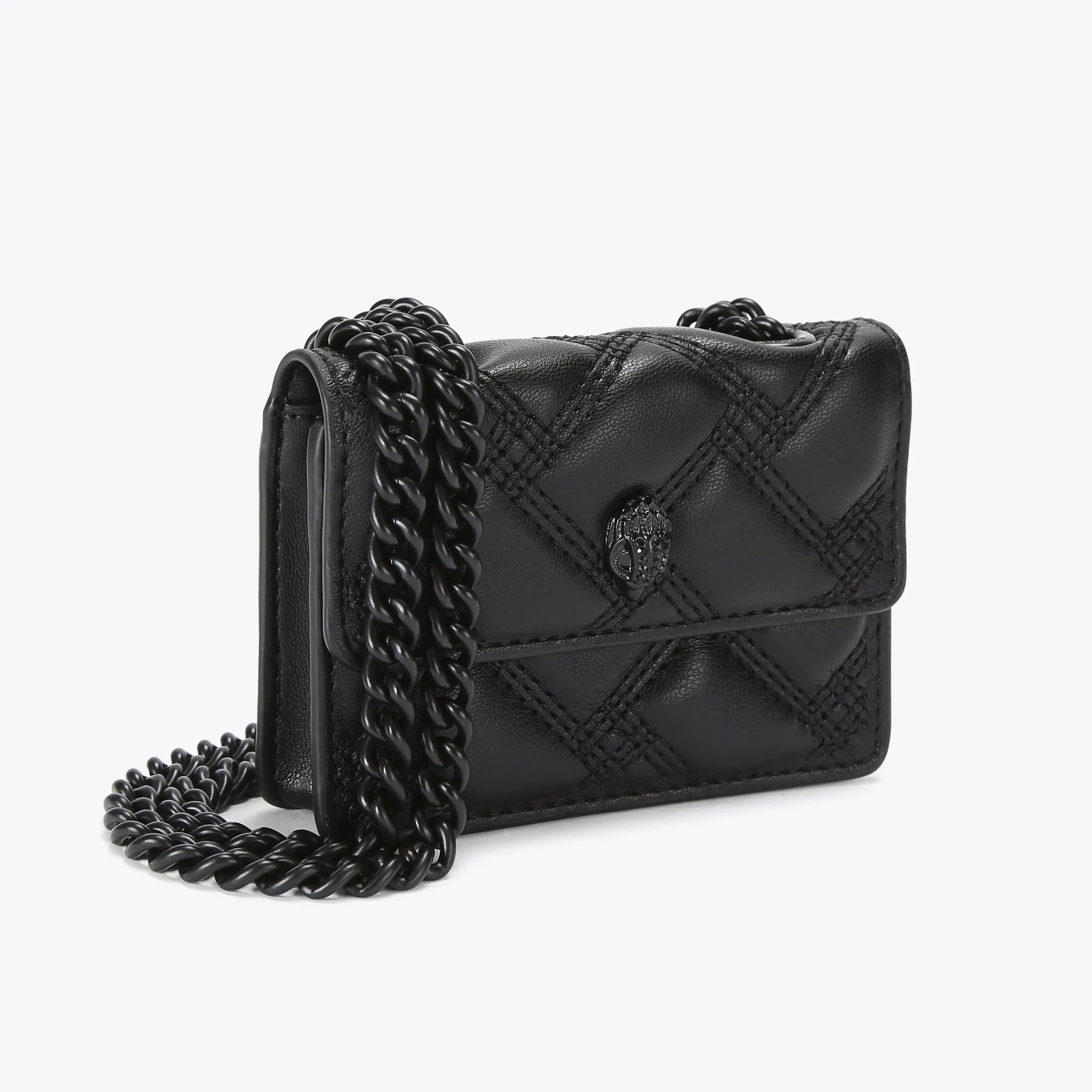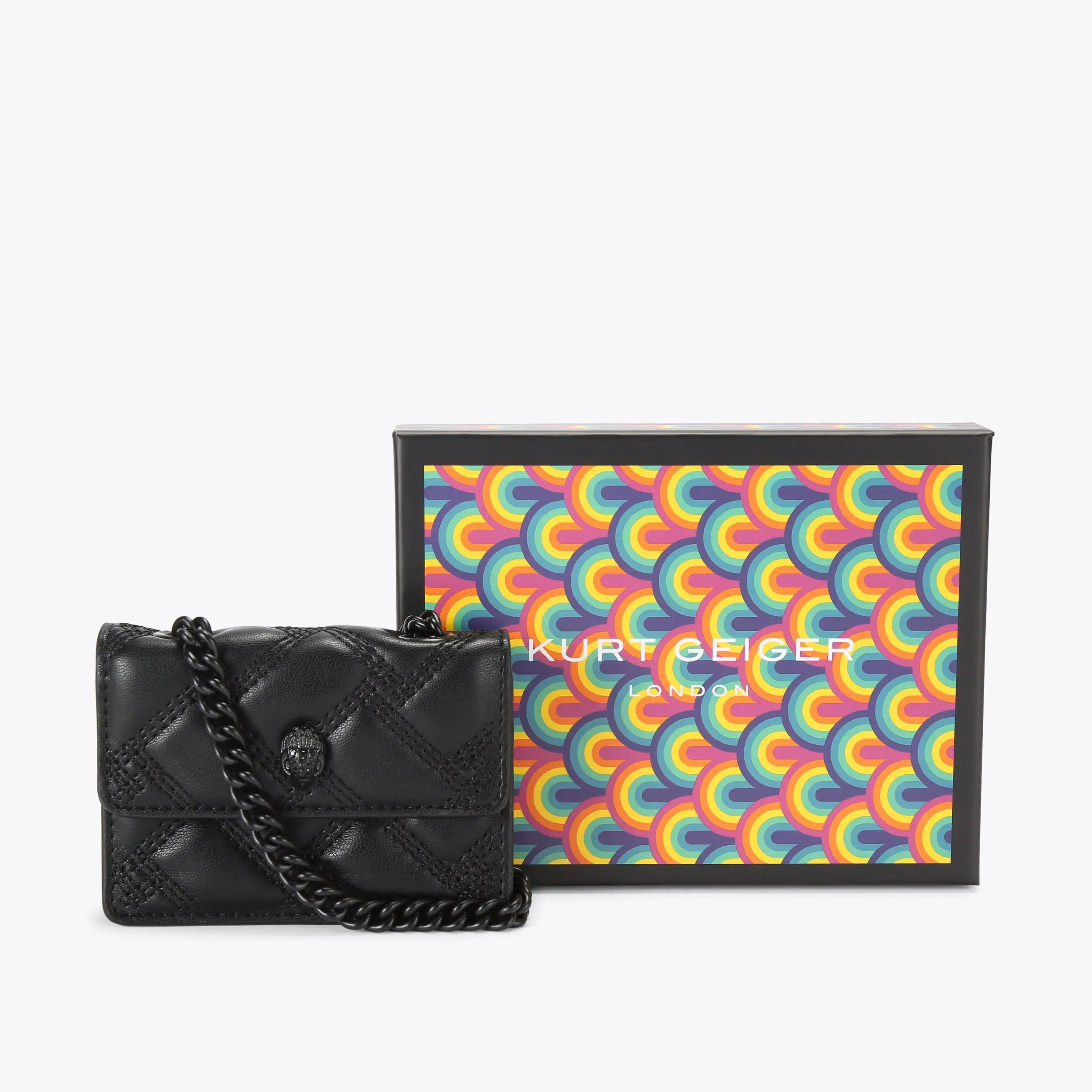 The Micro Kensington is crafted from a faux lambskin leather with signature parquet padded overstitch quilt with three rows of weave pattern. The black egle head features crystals and black bead eyes on the front flap.