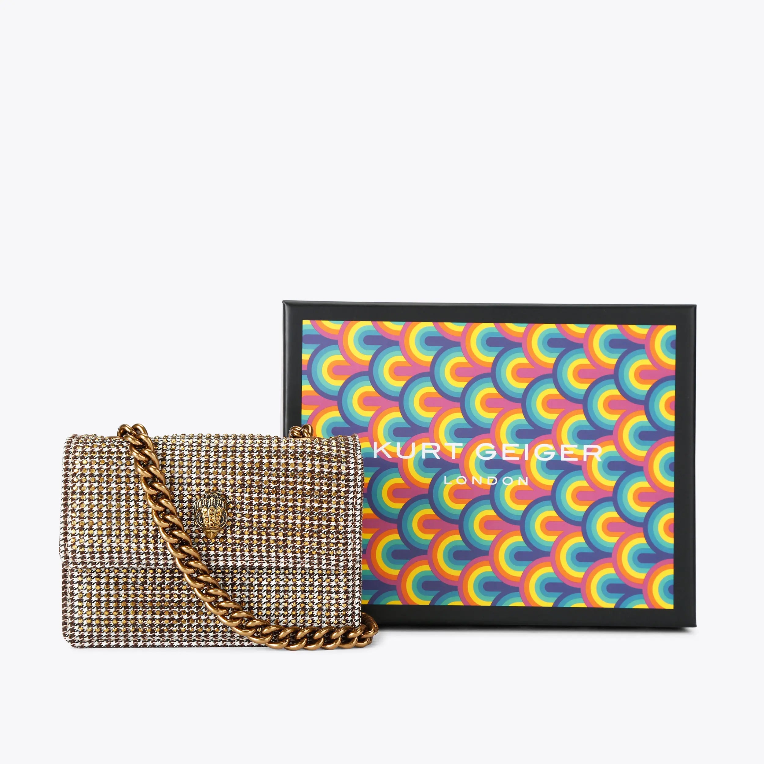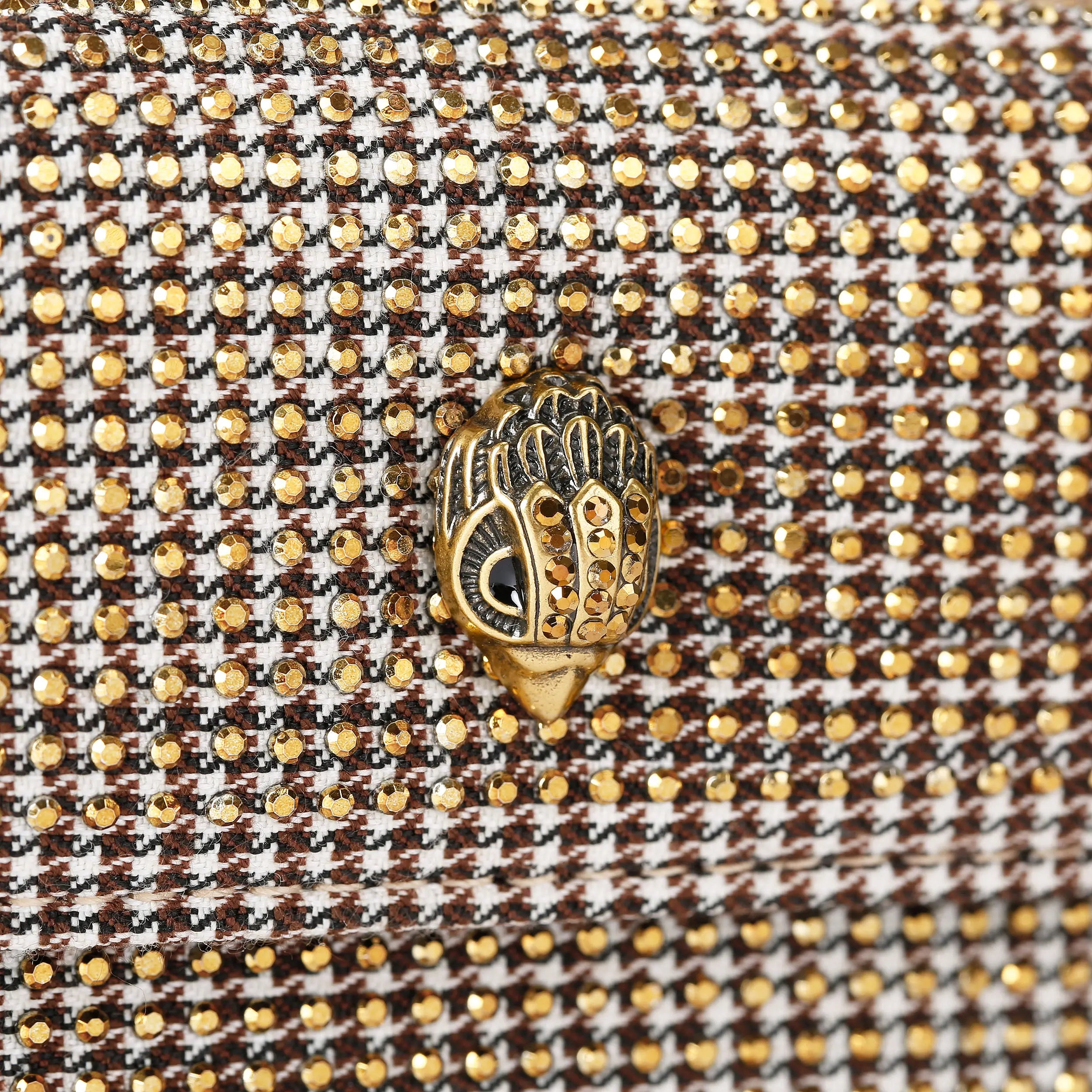 The Micro Kensington Purse is crafted from a beige houndstooth fabric embellished with gold crystals. The antiqued bass eagle head sits on the front flap.