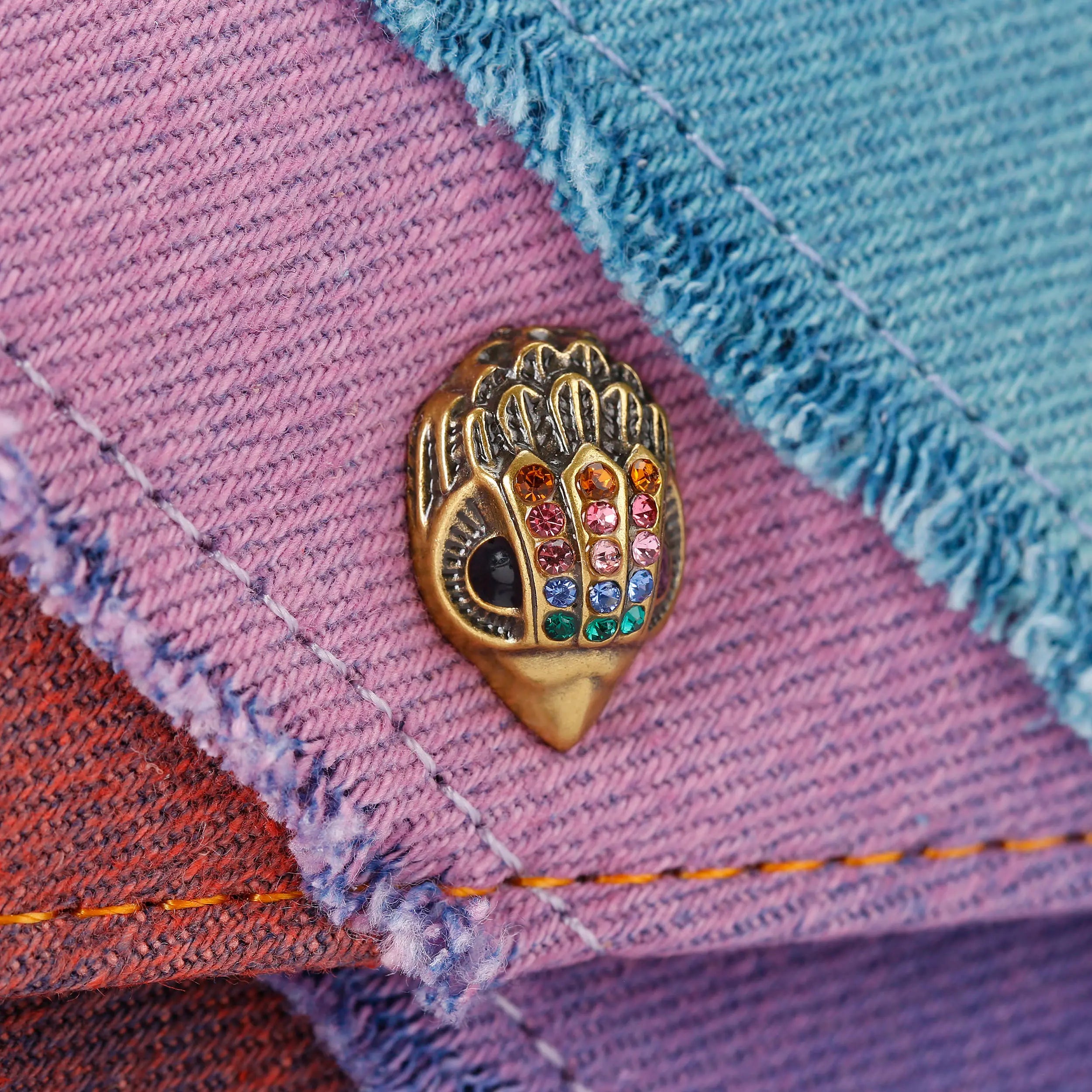 The Micro Kensington Purse is crafted from a rainbow striped denim with frayed edging detail. The antiqued bass eagle head sits on the front flap.