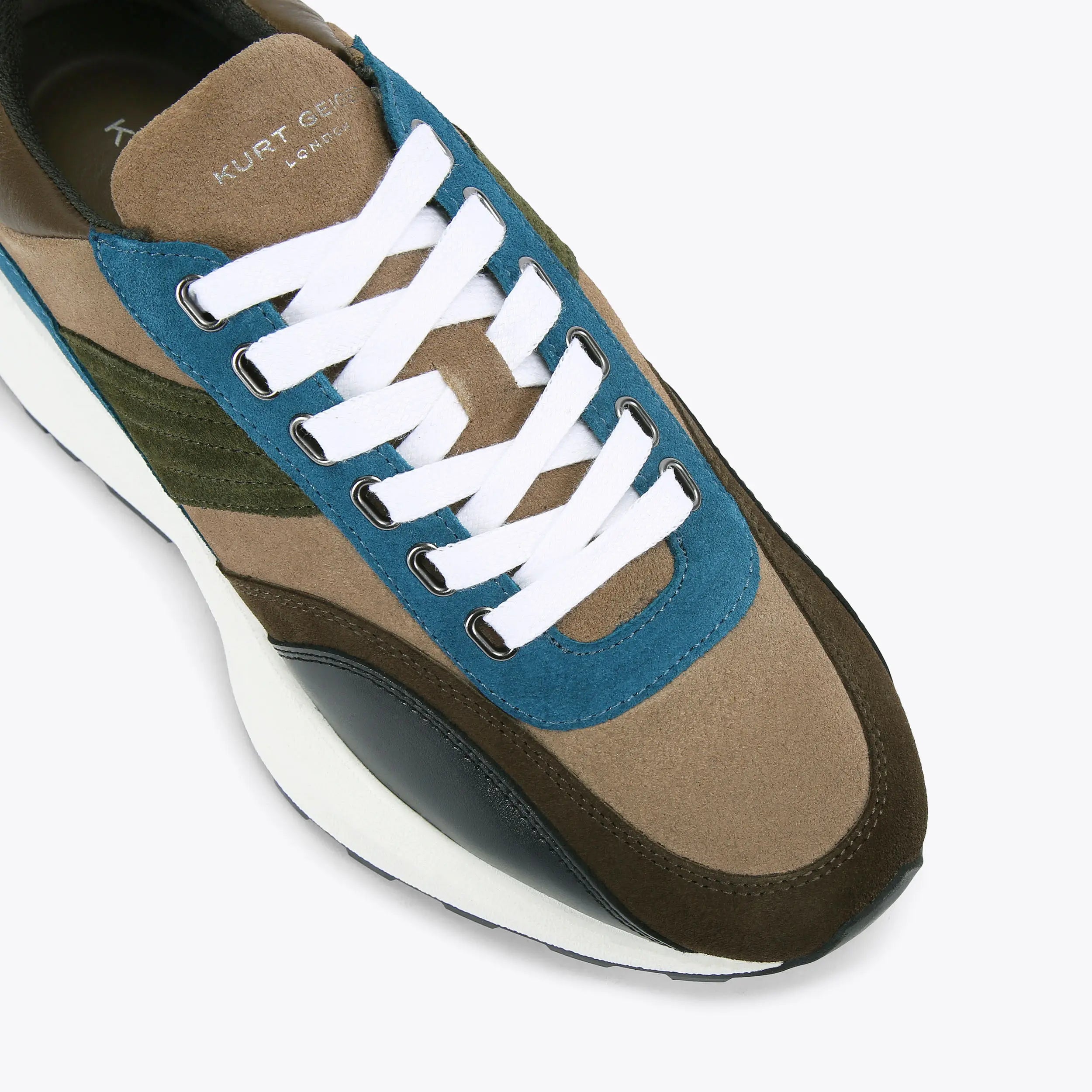 This Gaspar Sneaker is a sporty style with a neutral suede upper in different colours. The front laces up with a silver foil embossing on the heel.