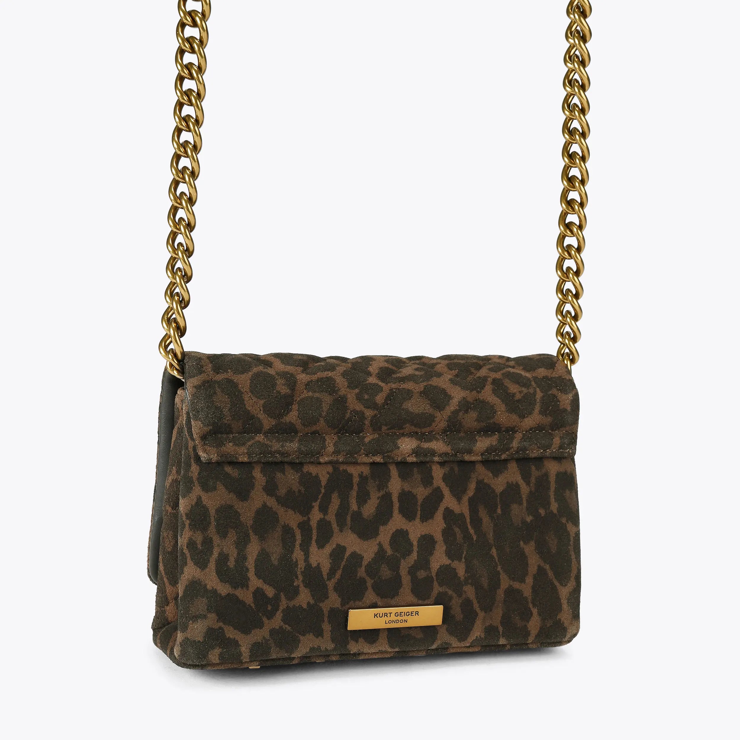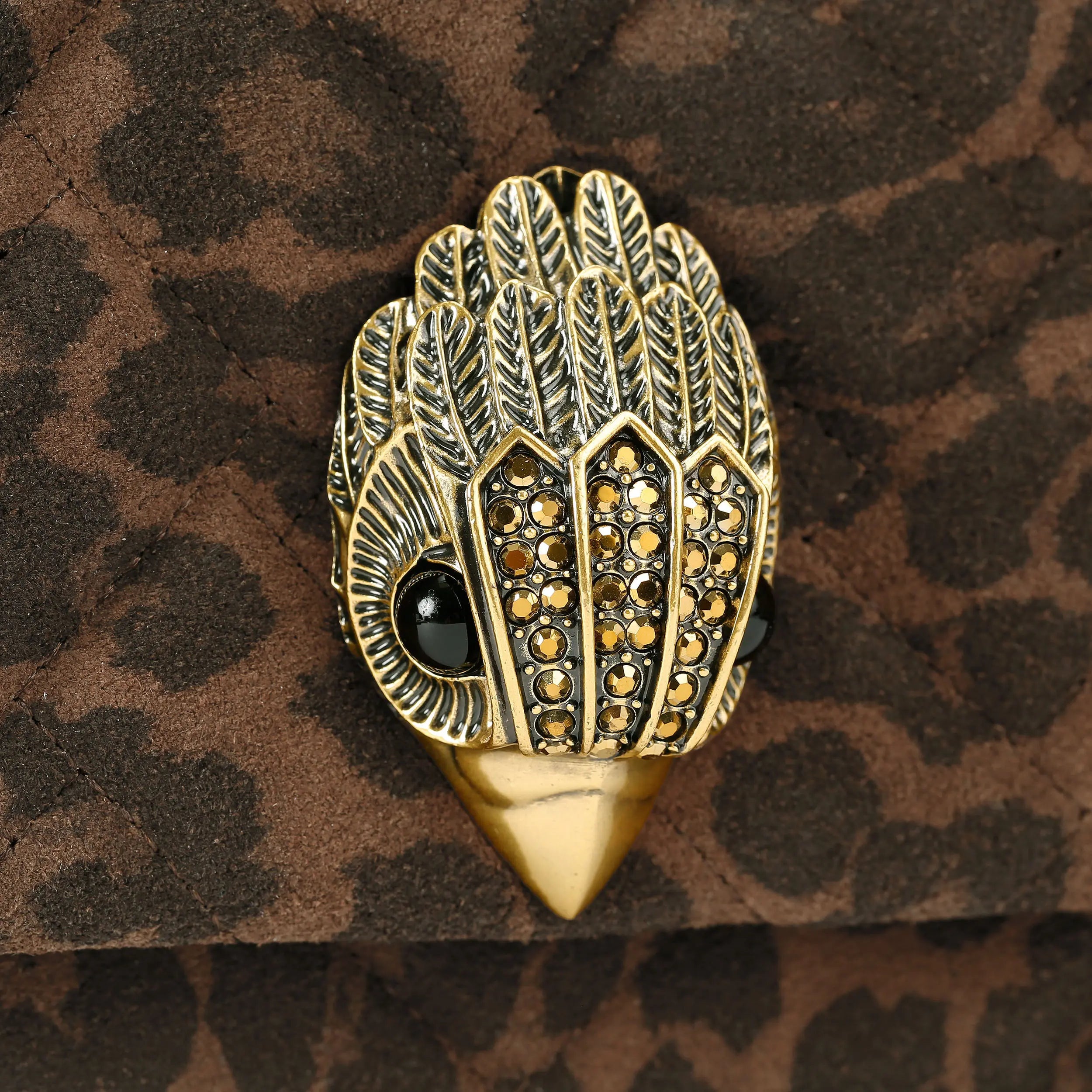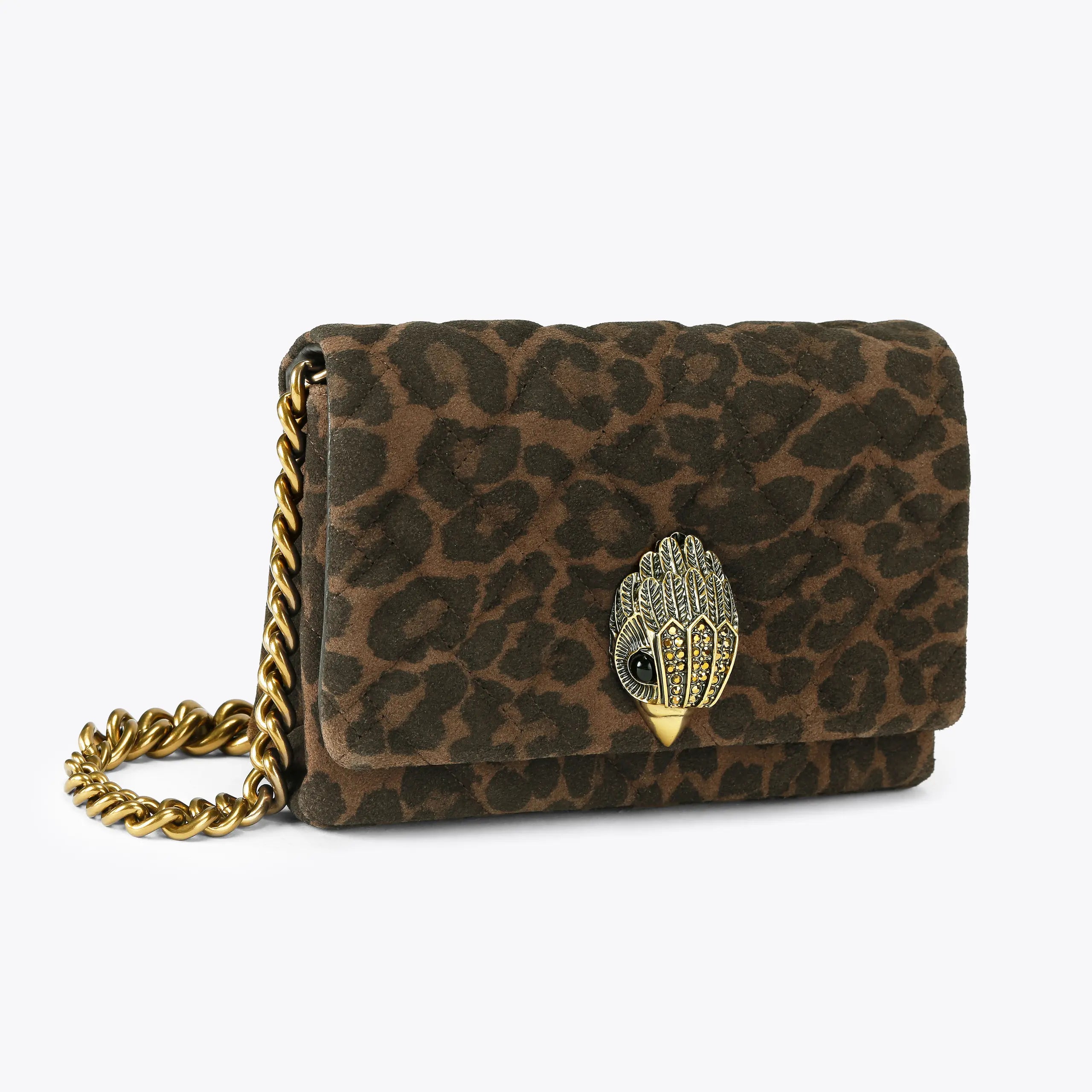 The Mini Kensington Kurt is crafted from a leopard printed suede leather with overstitch quilt pattern. The antique brass eagle head features crystals on the front flap. The bottom of the bag features an antiqued brass 'KURT'.
