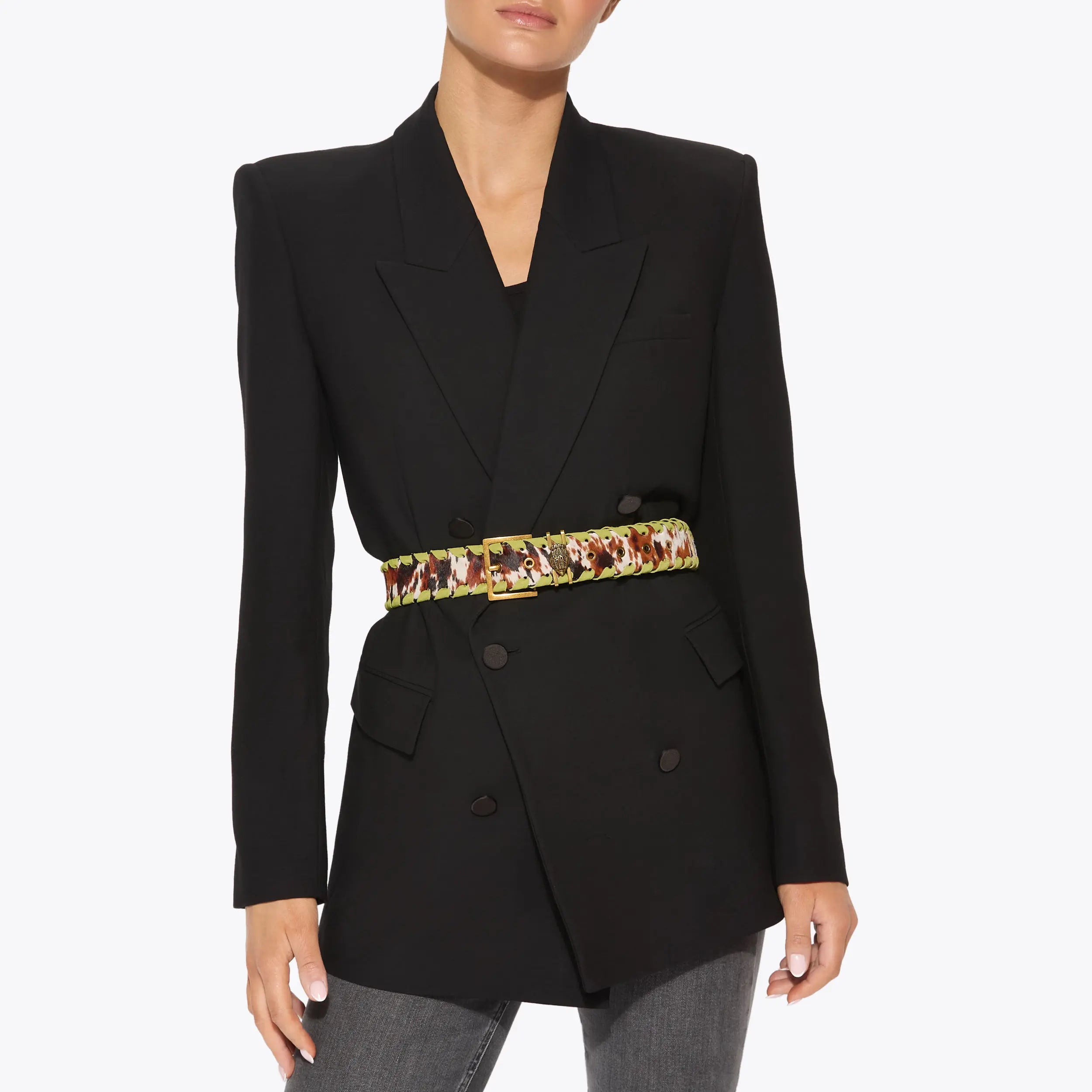 This Shoreditch 40 Belt is crafted from a brown cow printed leather with green trim. The antiqued brass buckle is branded whilst the belt loop features an antiqued brass Eagle head with all over feather detail.