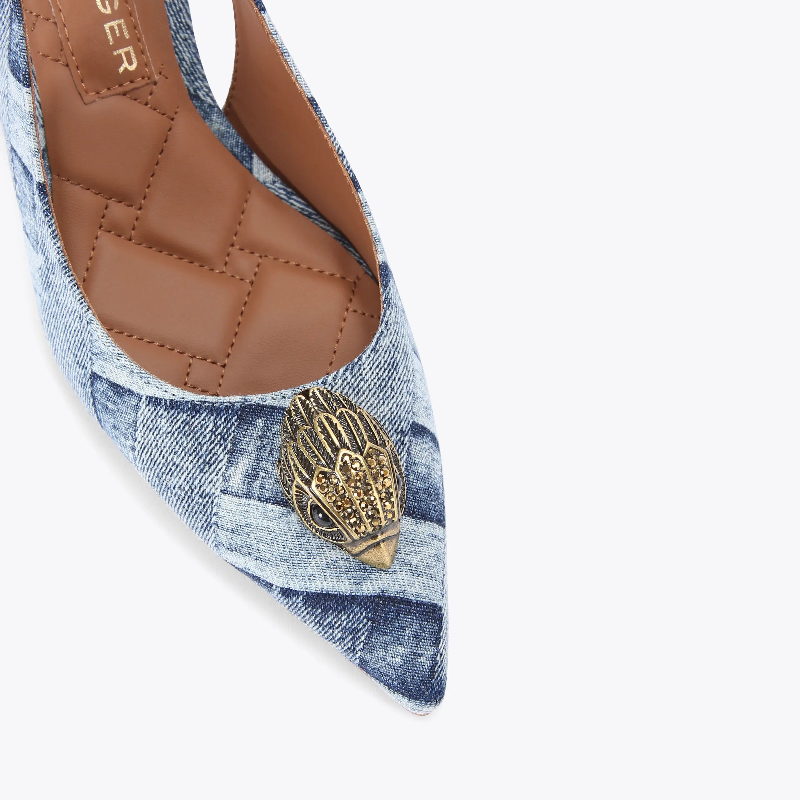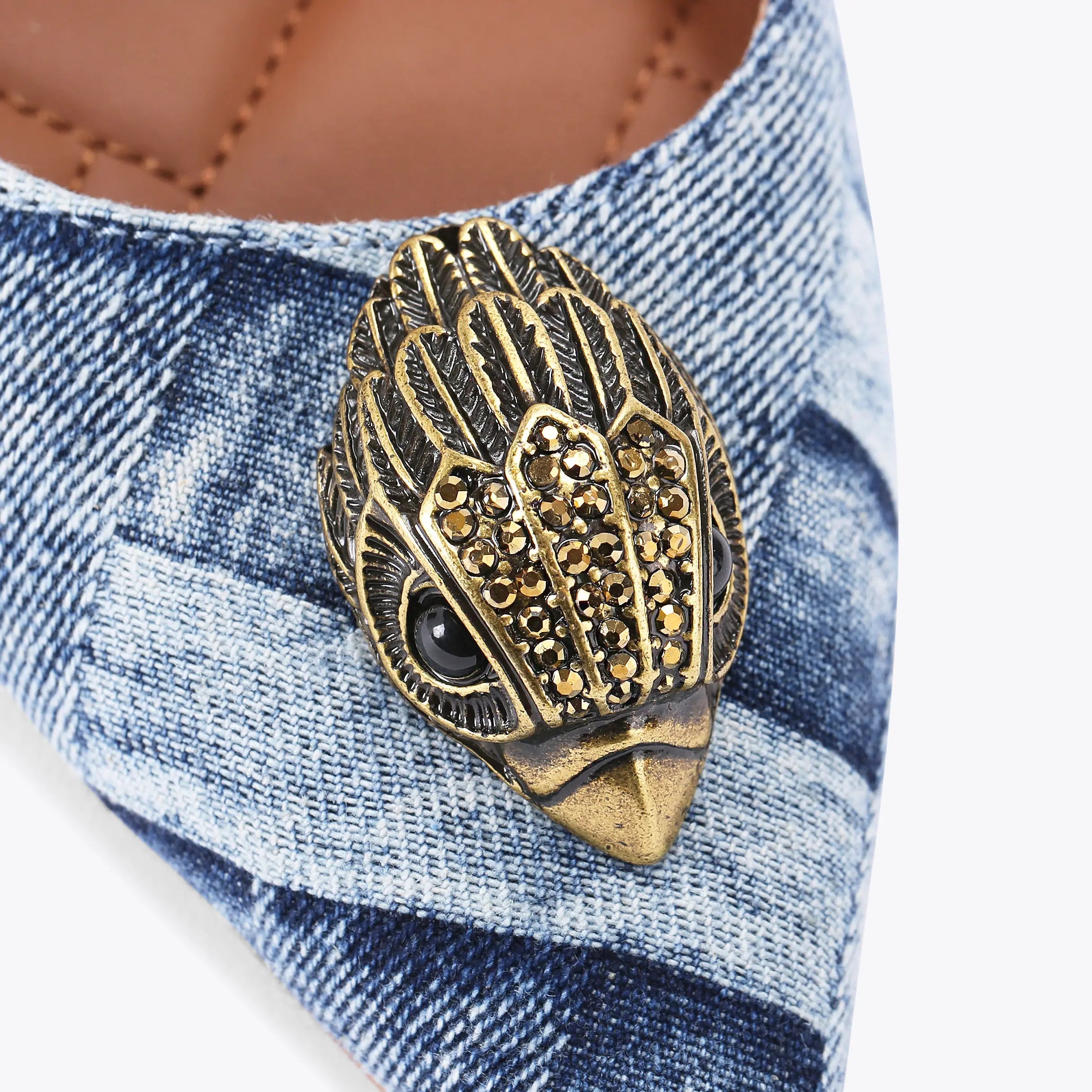 The Belgravia Sling Back heel features a denim upper with bleached weave print and pointed toe. The antiqued brass eagle head features crystals sat on the toe.