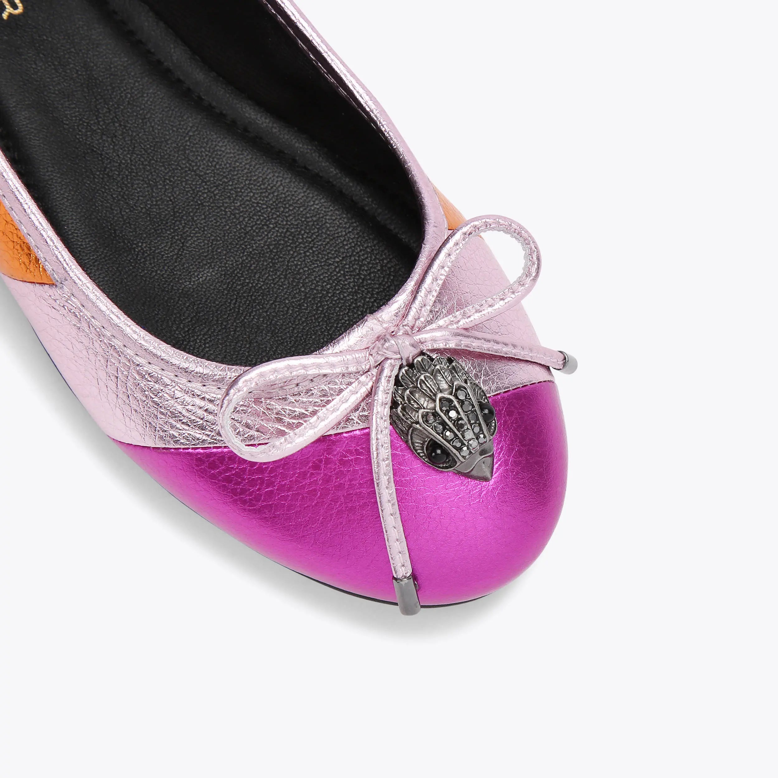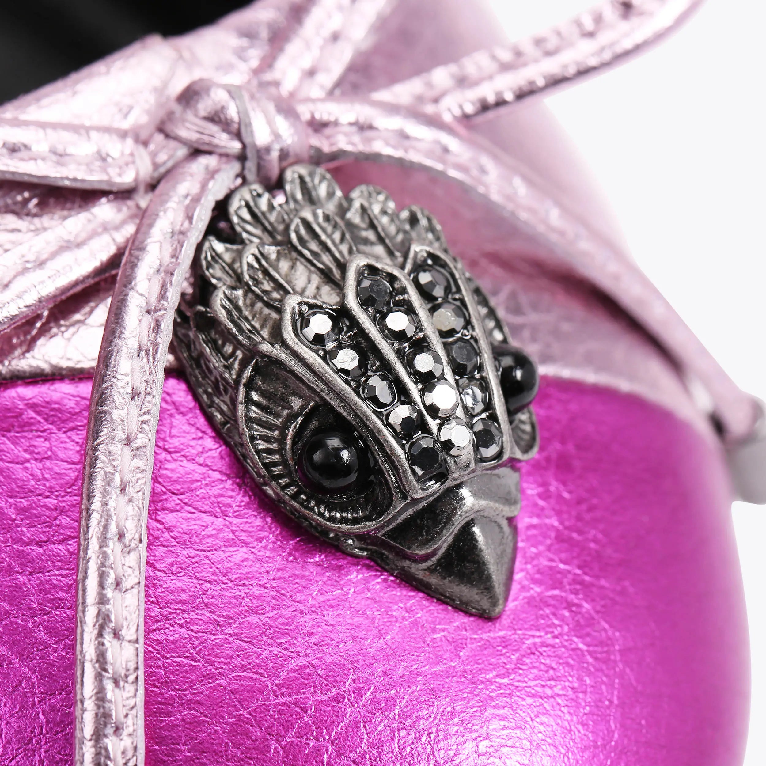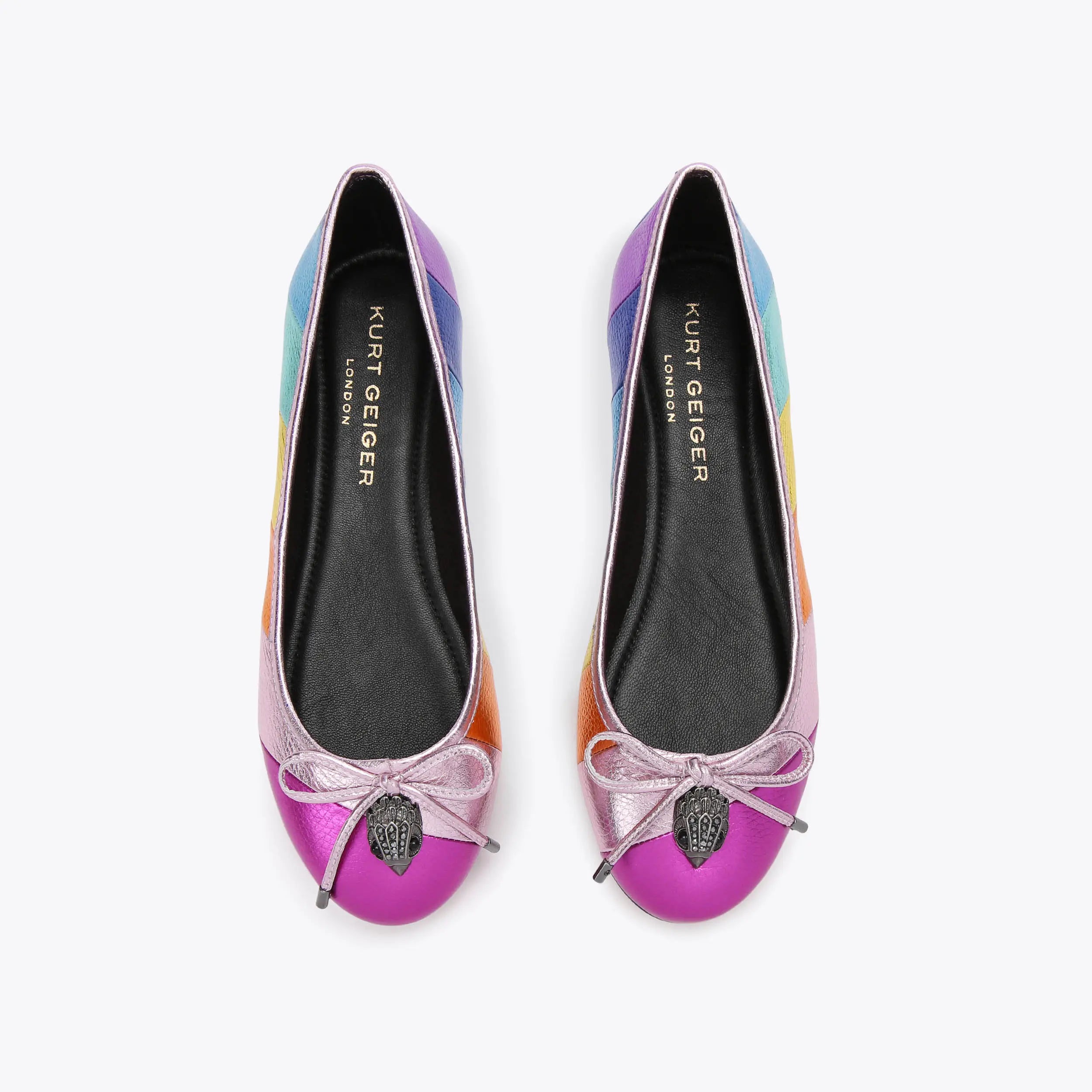 The Eagle Ballerina is a slip-on flat with a metallic laminated pebble grain cow leather in the iconic diagonal rainbow sewn stripe pattern. The toe features a bow and antiqued silver Eagle head with crystals.