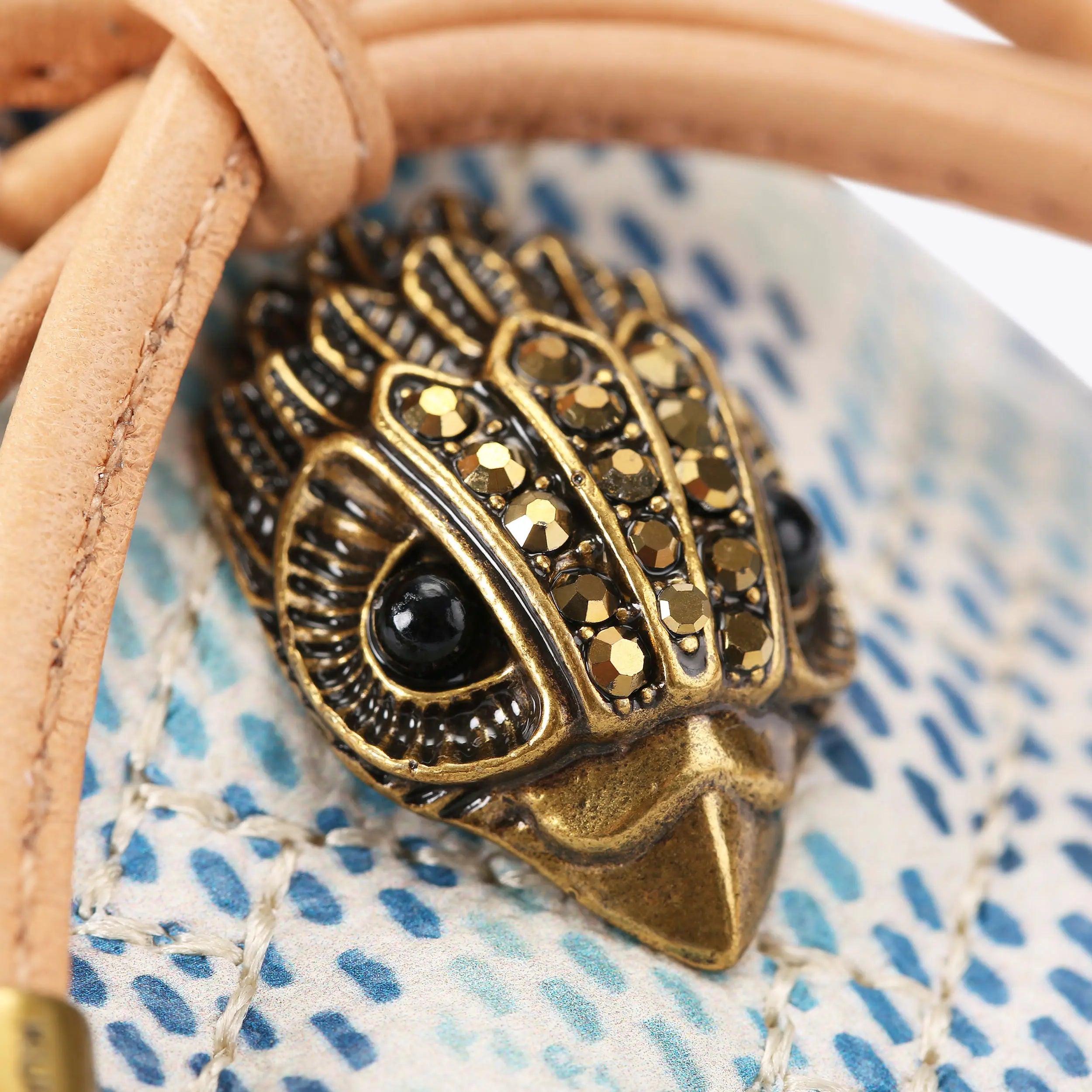 The Eagle Moccasin is a slip on loafer. The upper is crafted from a pebble grain leather panels with monogrammed Kensington weave design. There is a bow with antiqued brass eagle on each toe.