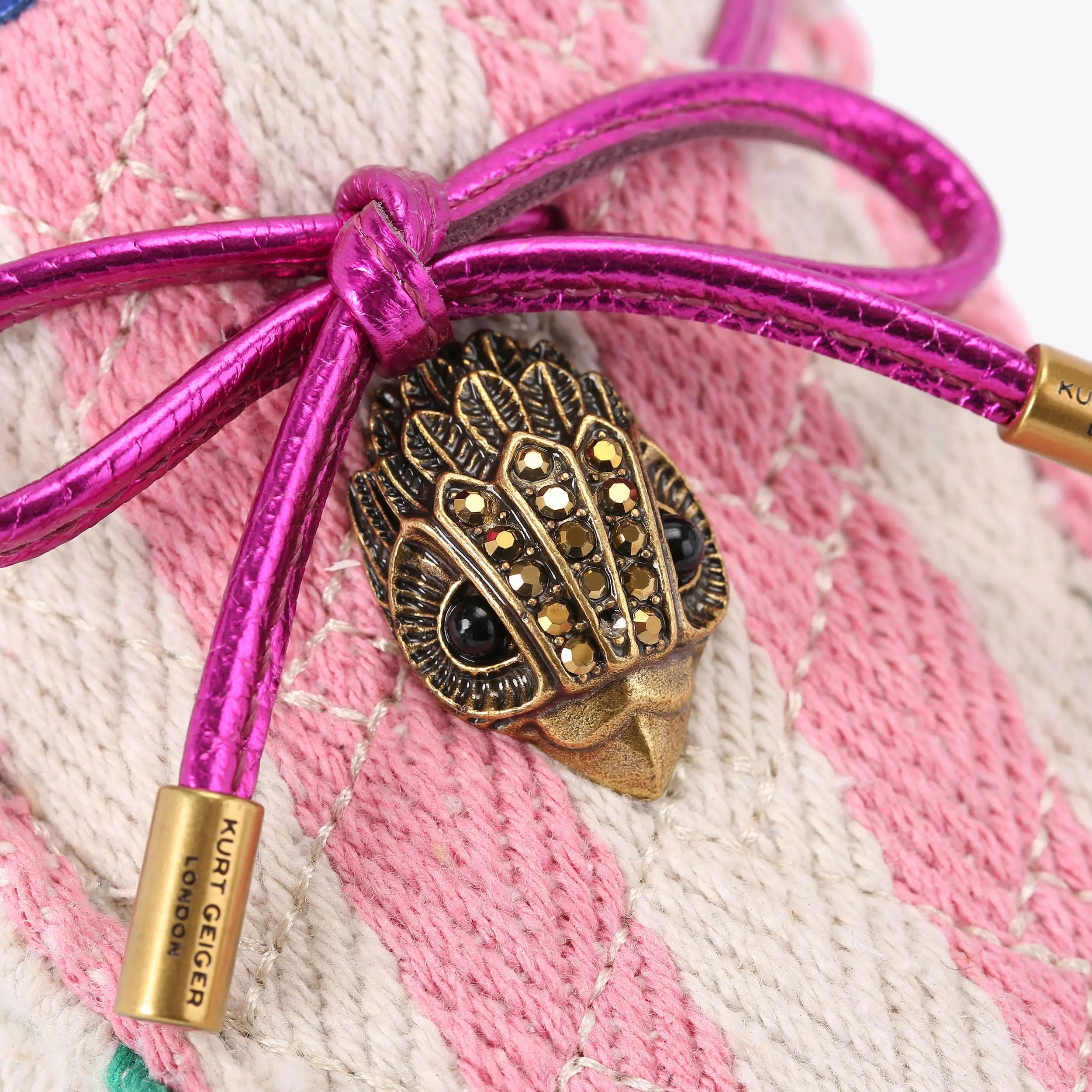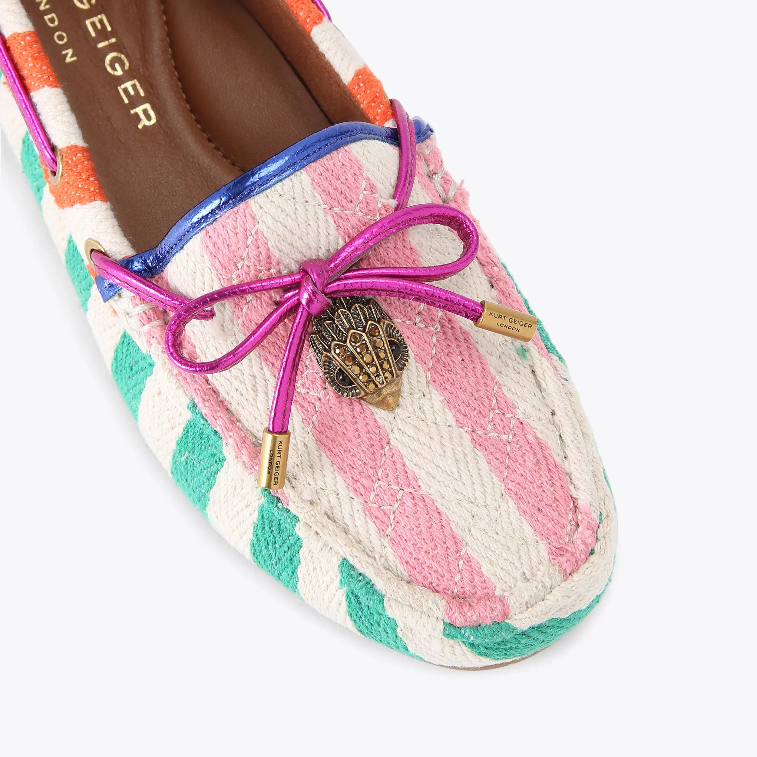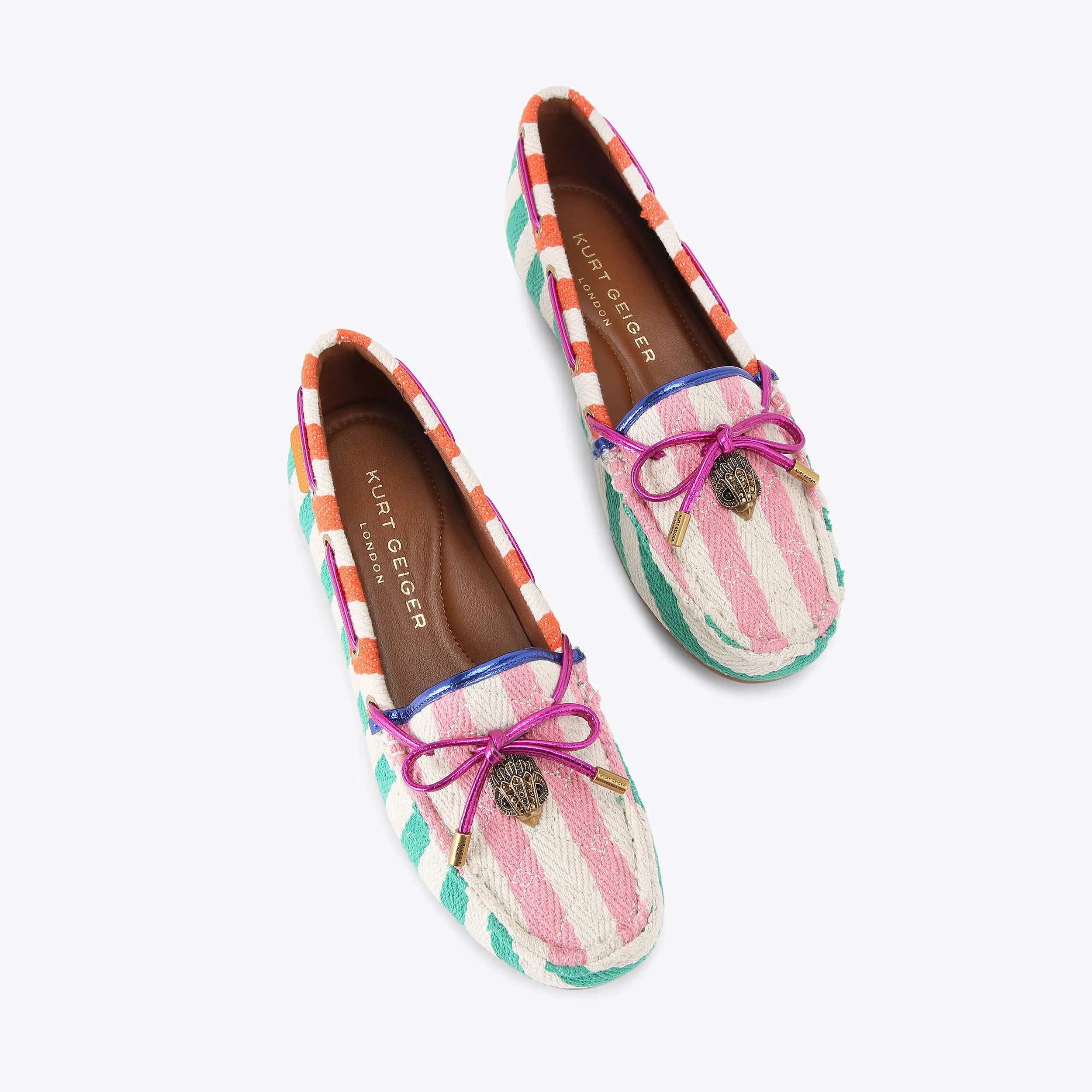 The Eagle Moccasin is a slip on loafer. The upper is crafted from a striped canvas with multiple colours. There is a bow with antiqued brass eagle on each toe.