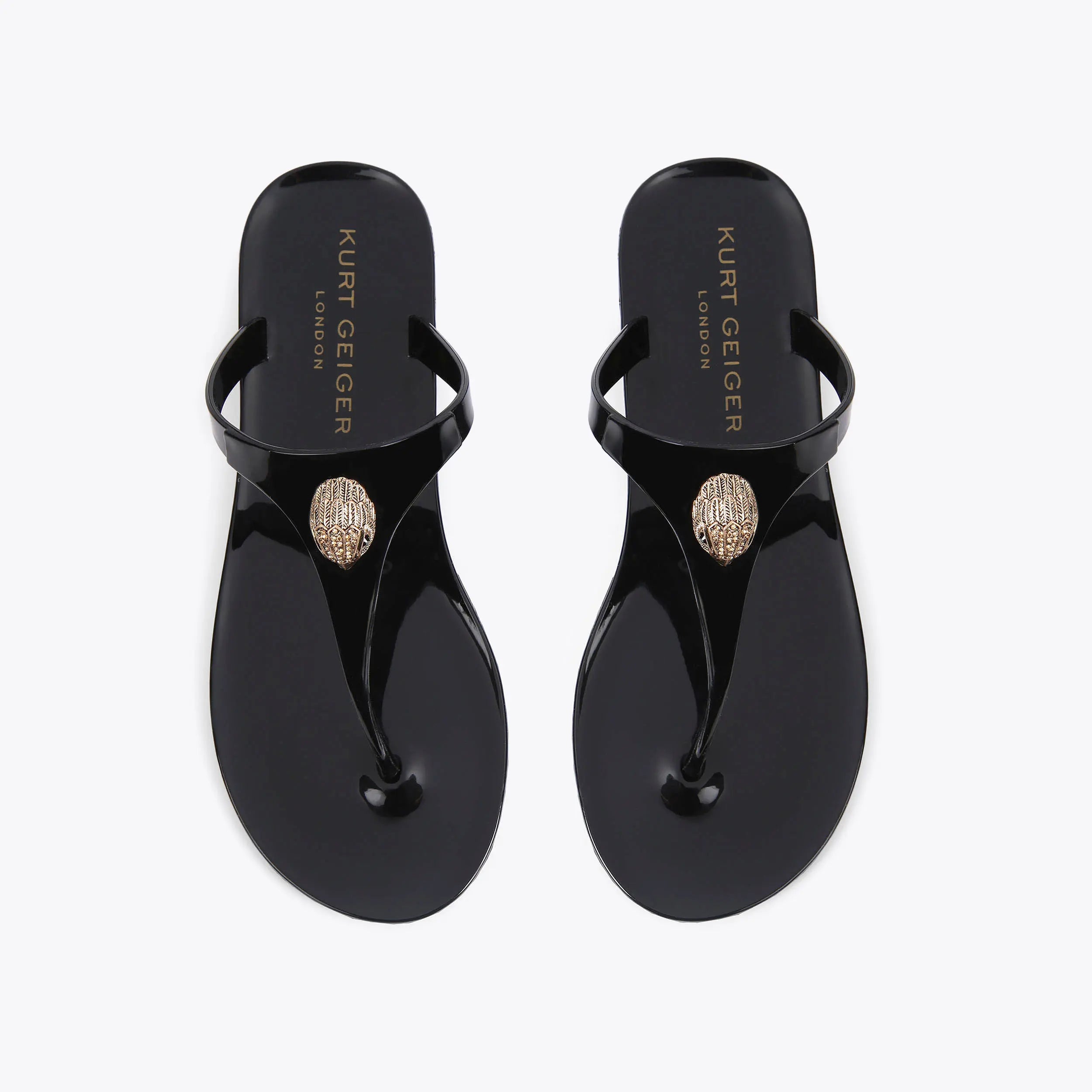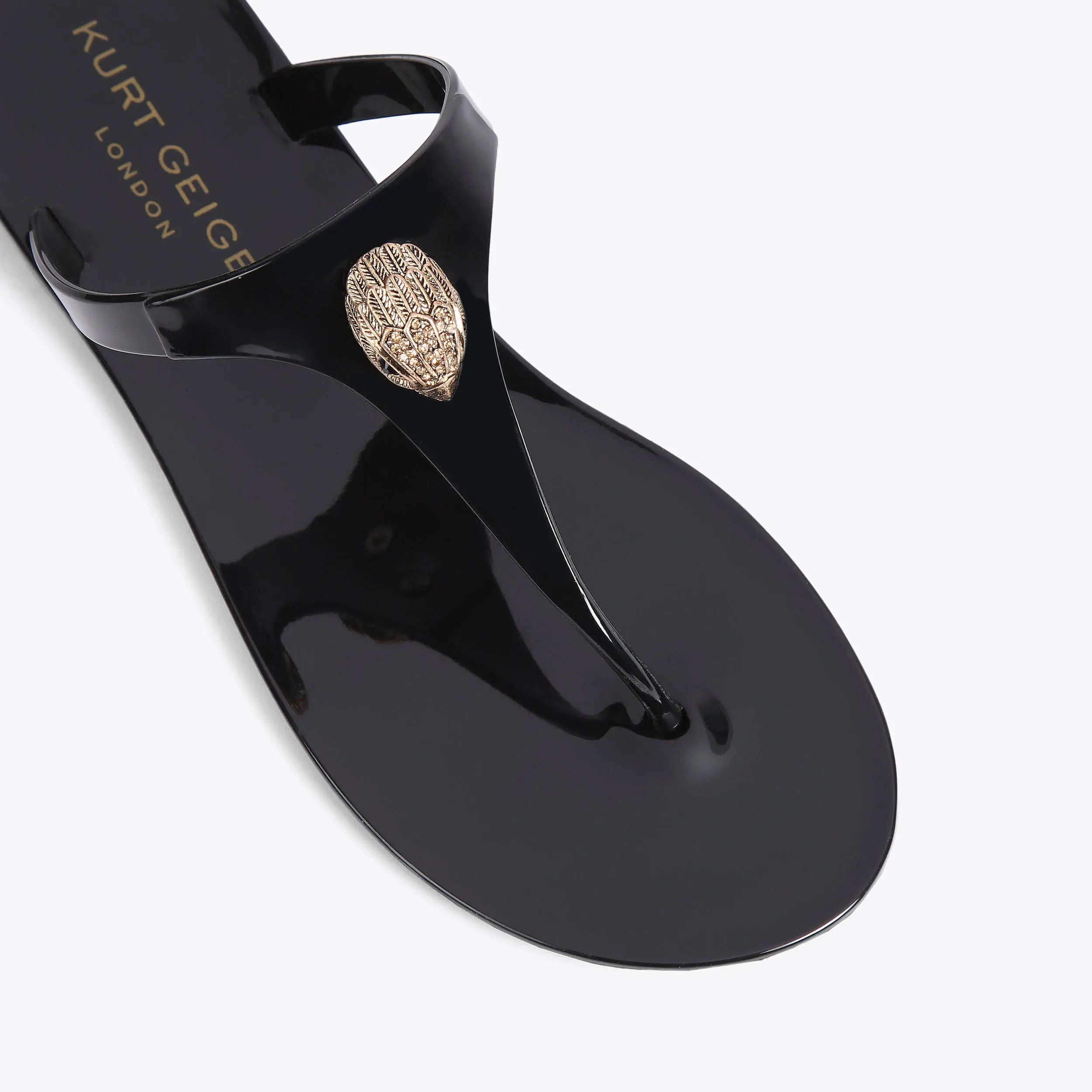 The Maddison T-Bar sandal features a simple black upper. The antiqued brass Eagle head features crystals on the T-Bar strap.