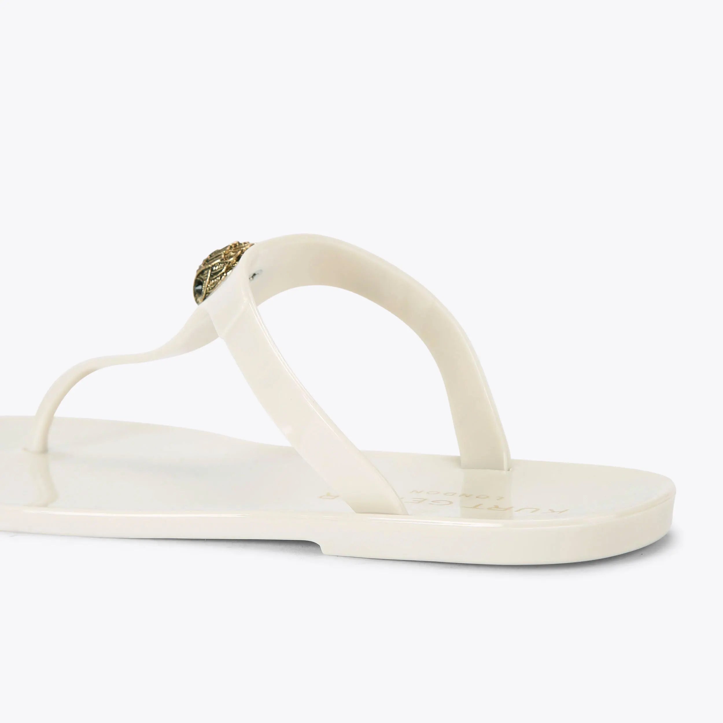 The Maddison T-Bar sandal features a bone upper. The antiqued brass eagle head features crystals on the T-Bar strap.