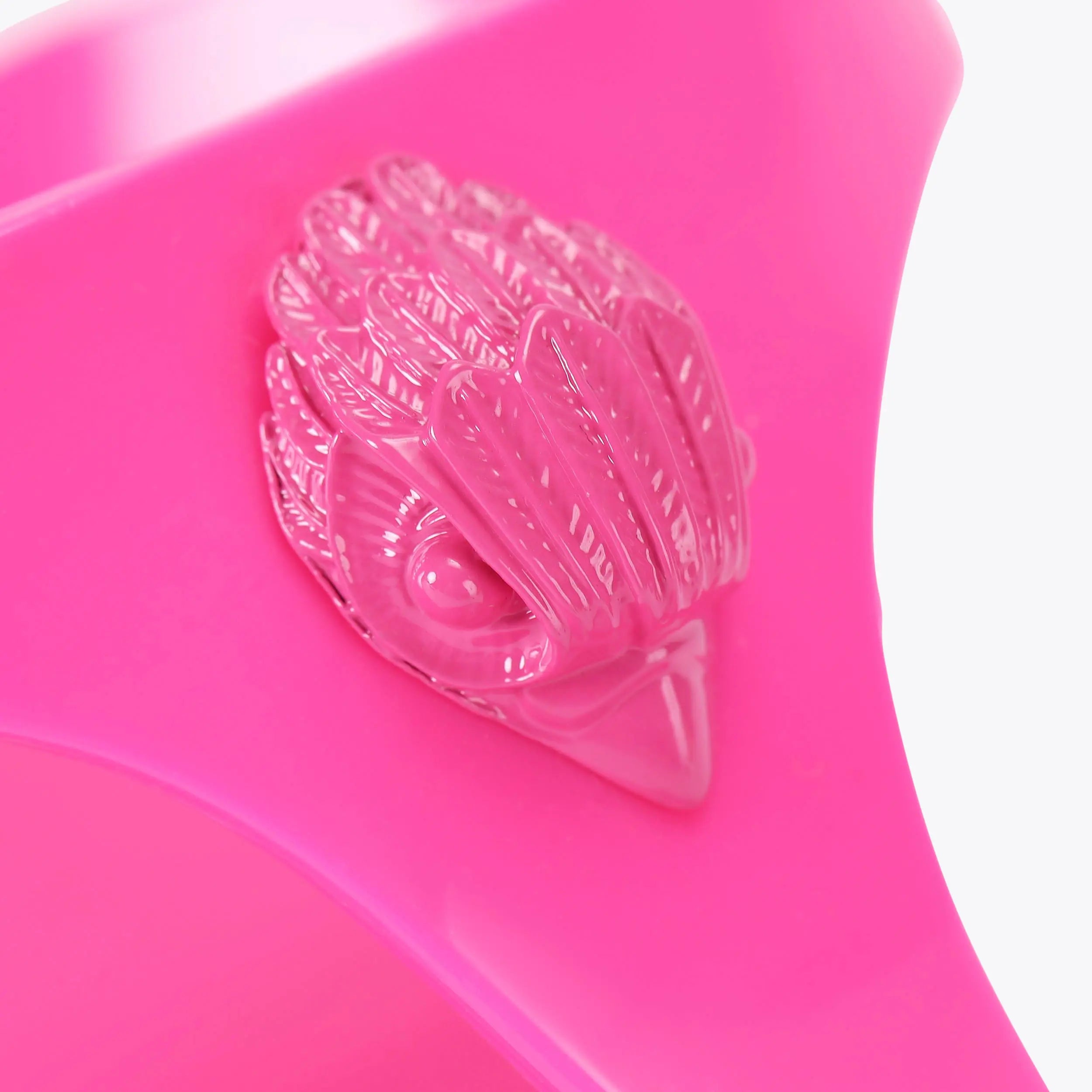 The Maddison T-Bar sandal features a fuchsia pink upper. There is a pink metal eagle head on the T-Bar strap.