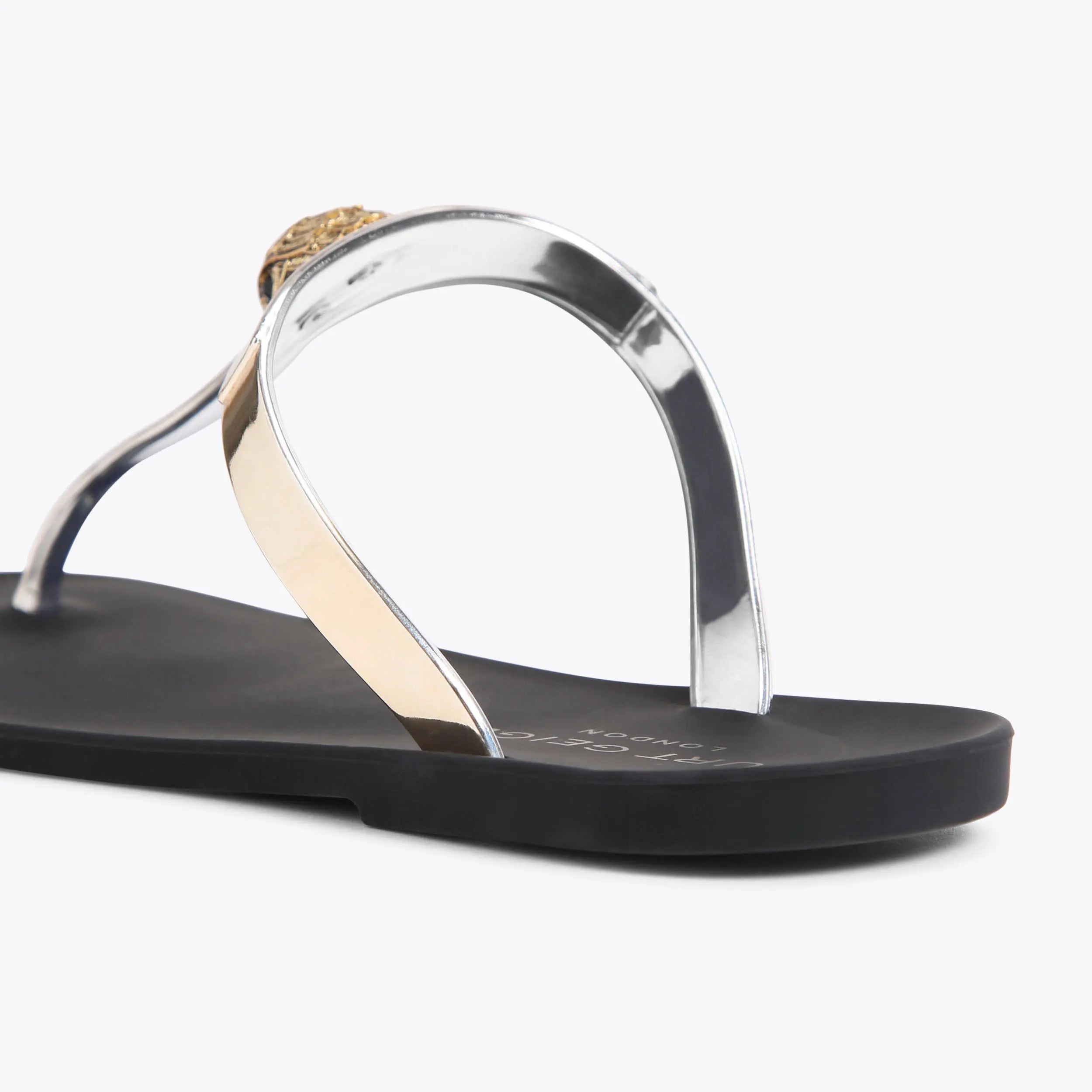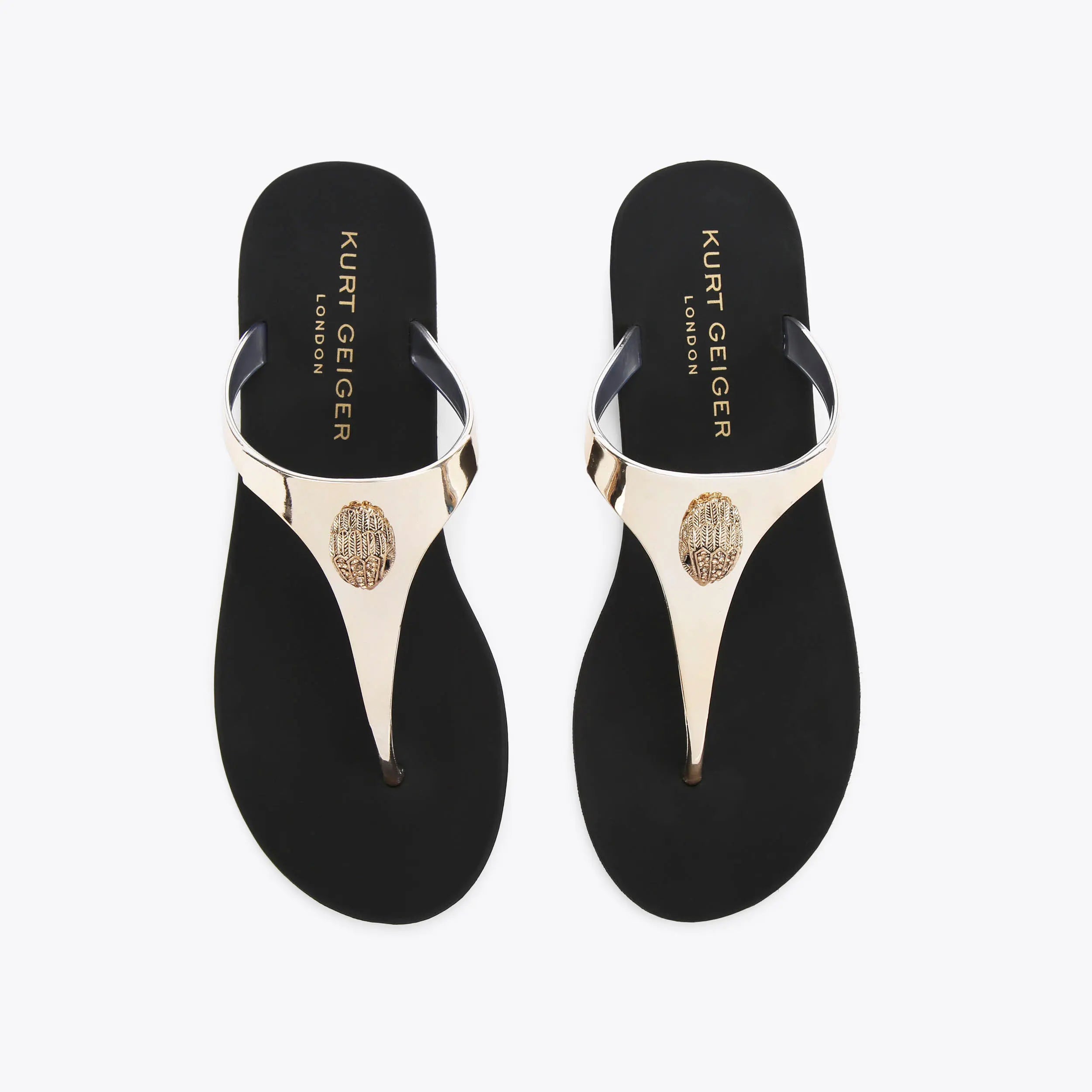 The Maddison T-Bar sandal features a gold metallic upper. The antiqued brass Eagle head features crystals on the T-Bar strap.