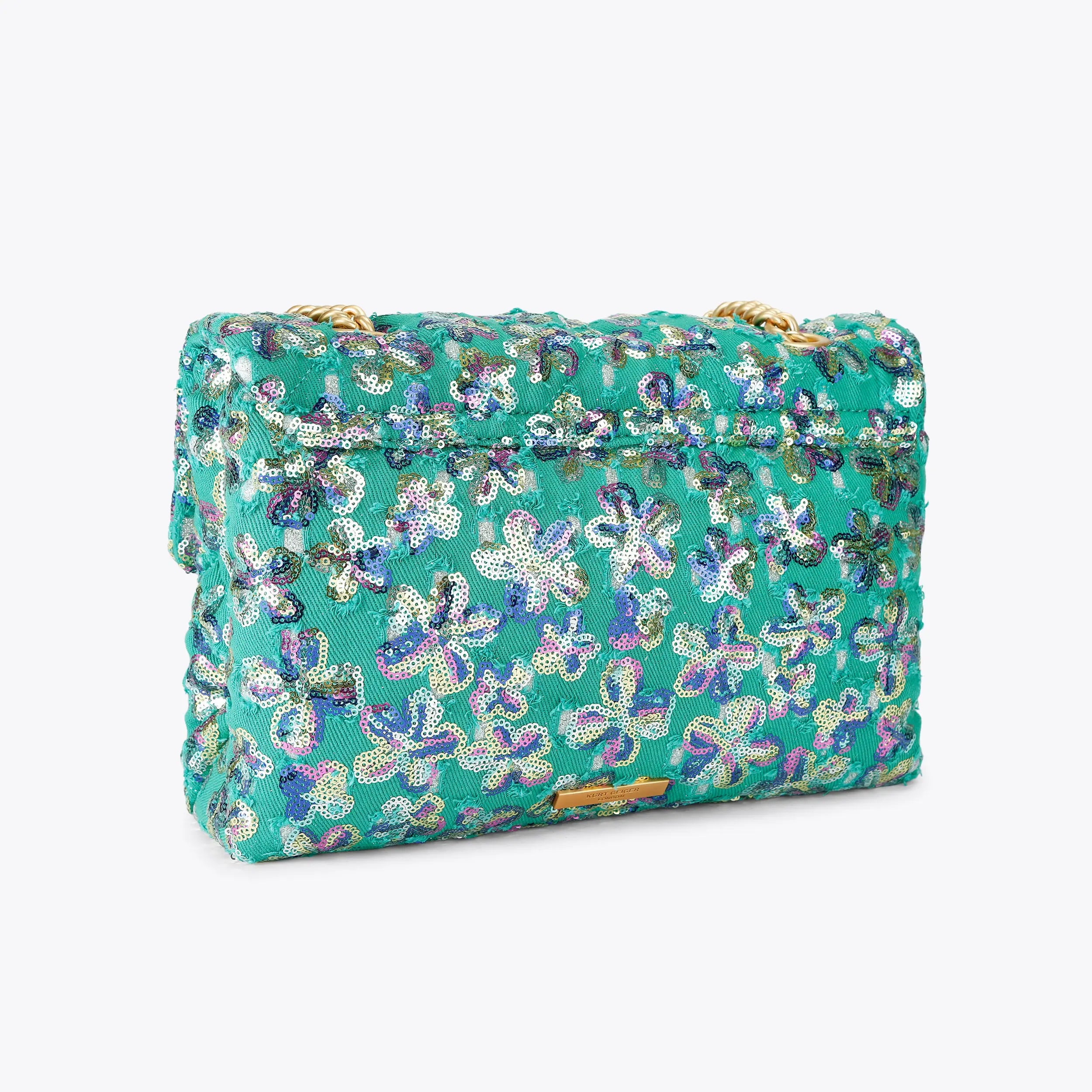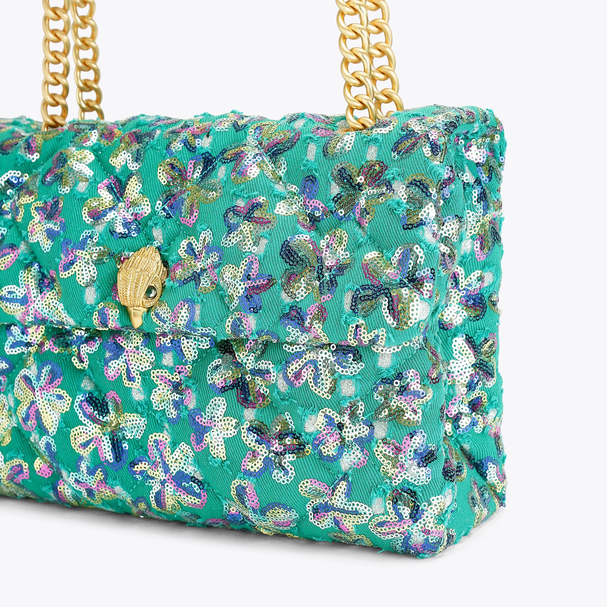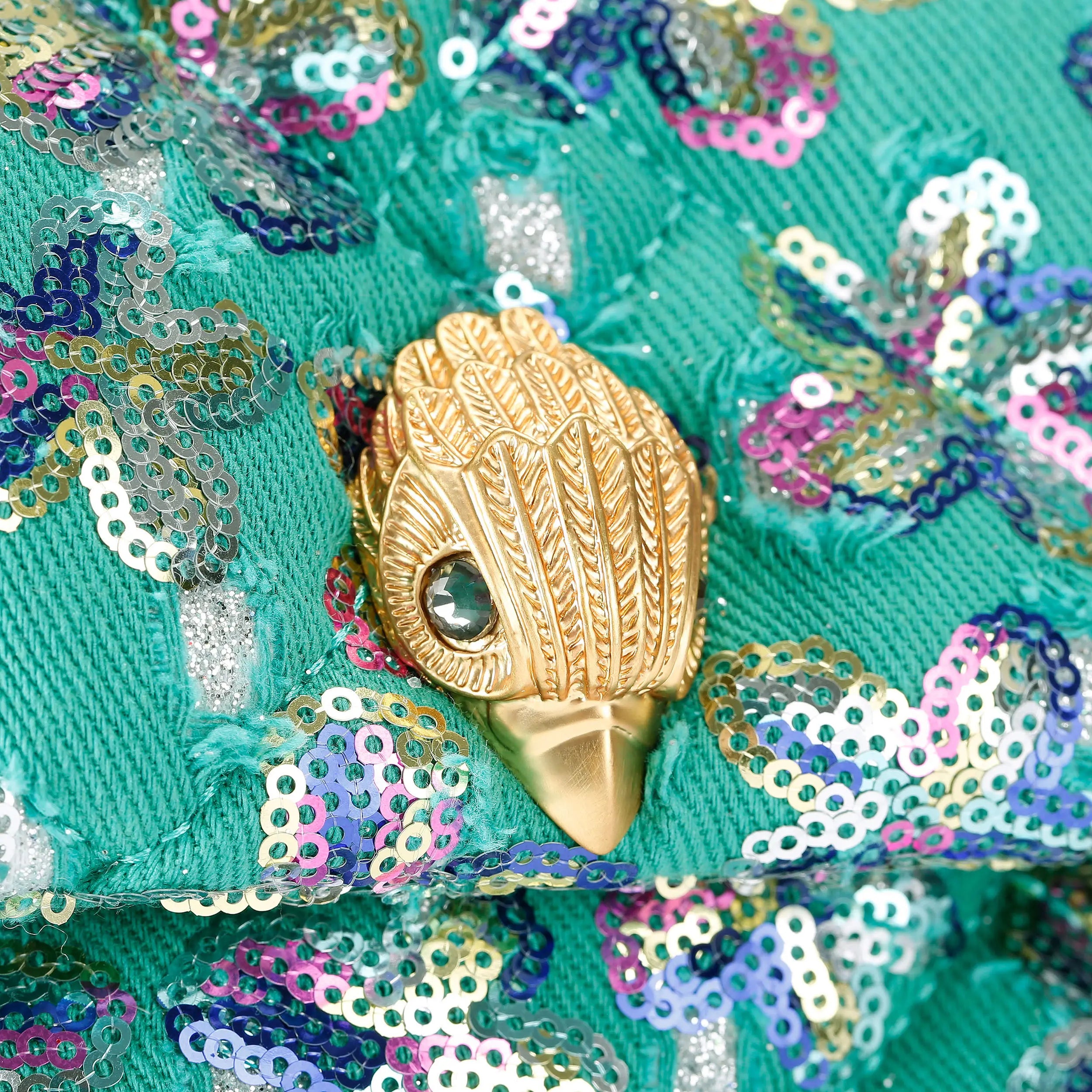 The Large Kensington Soft purse is crafted from a green fabric that is embellished with sequin flowers. The brushed gold eagle head features crystals and black bead eyes on the front flap.