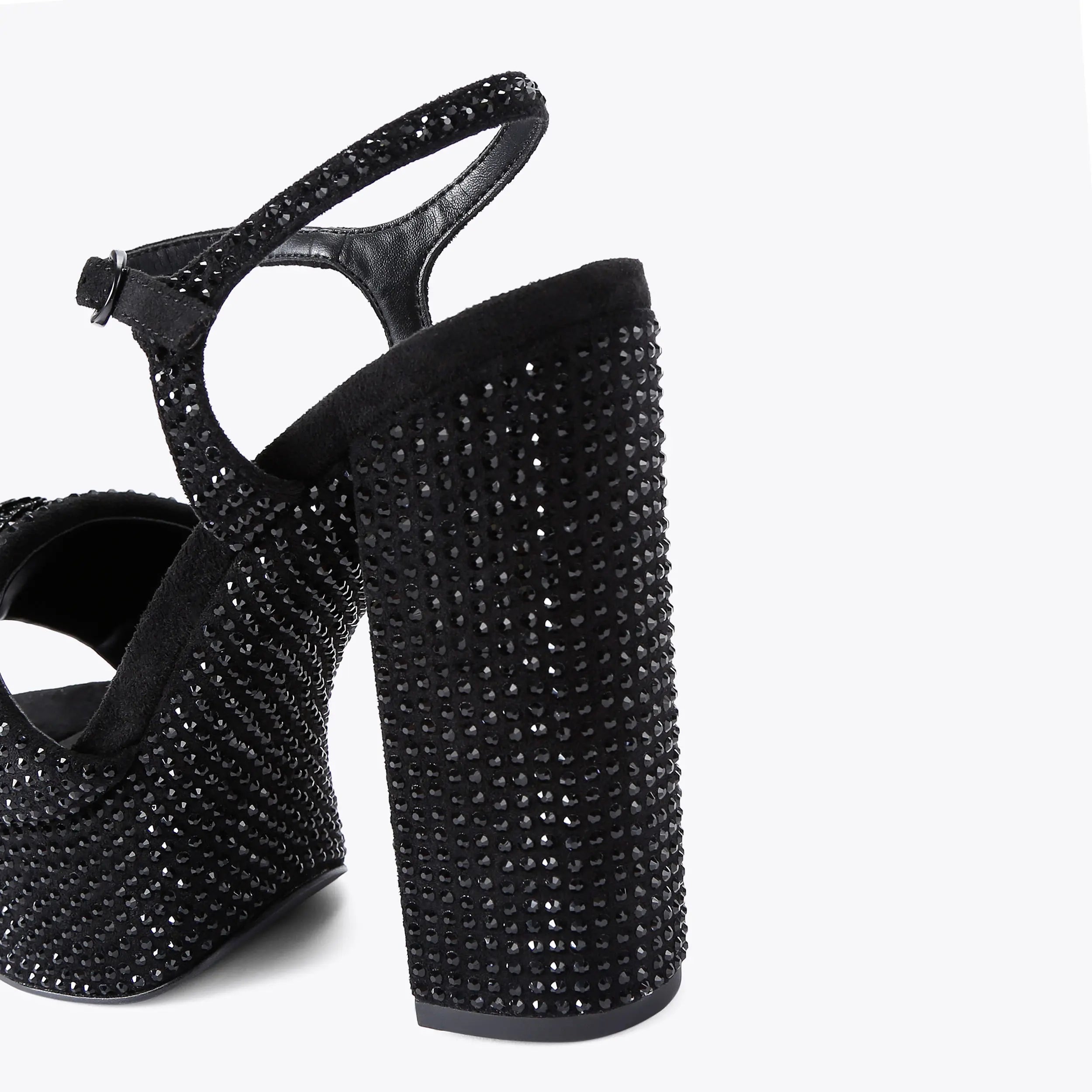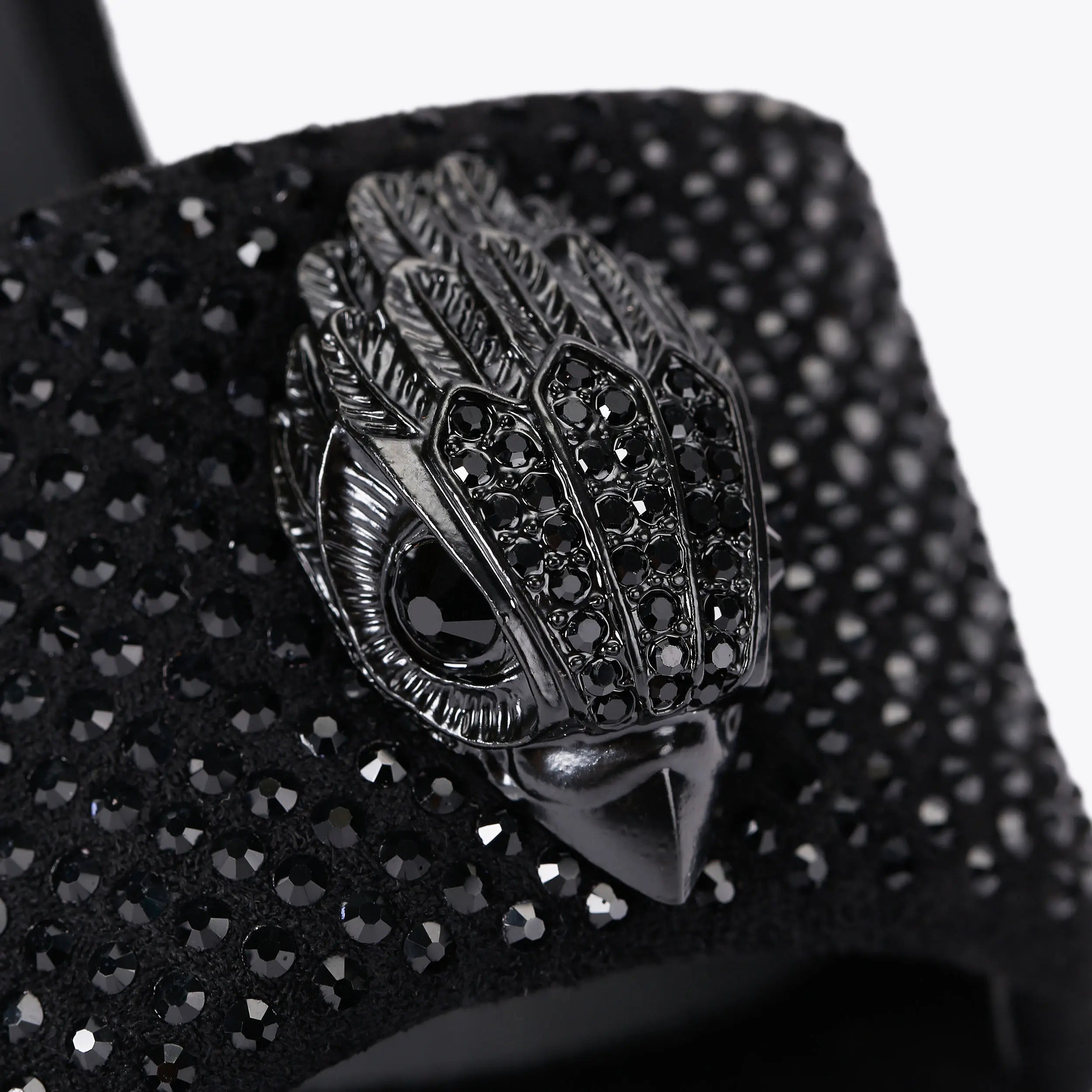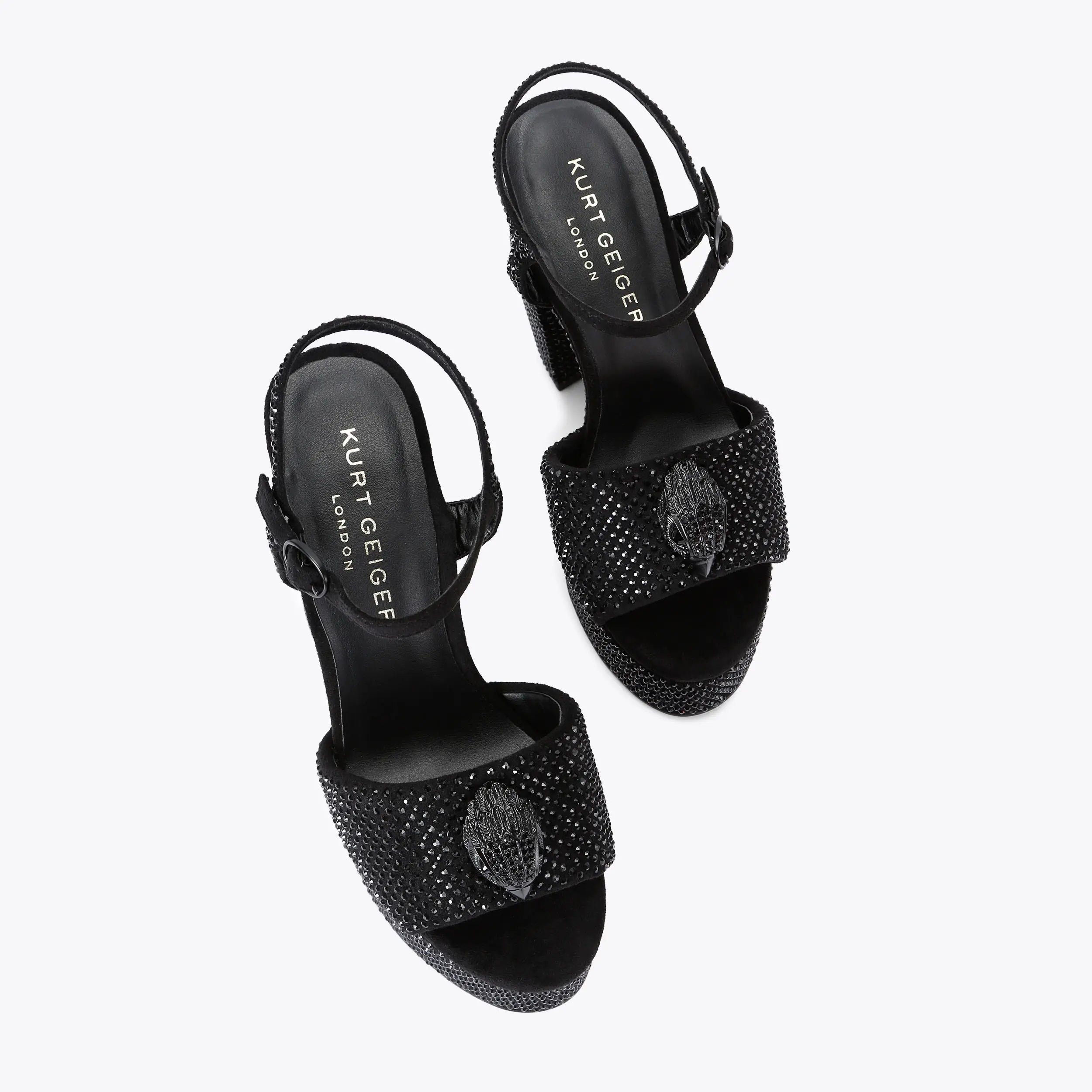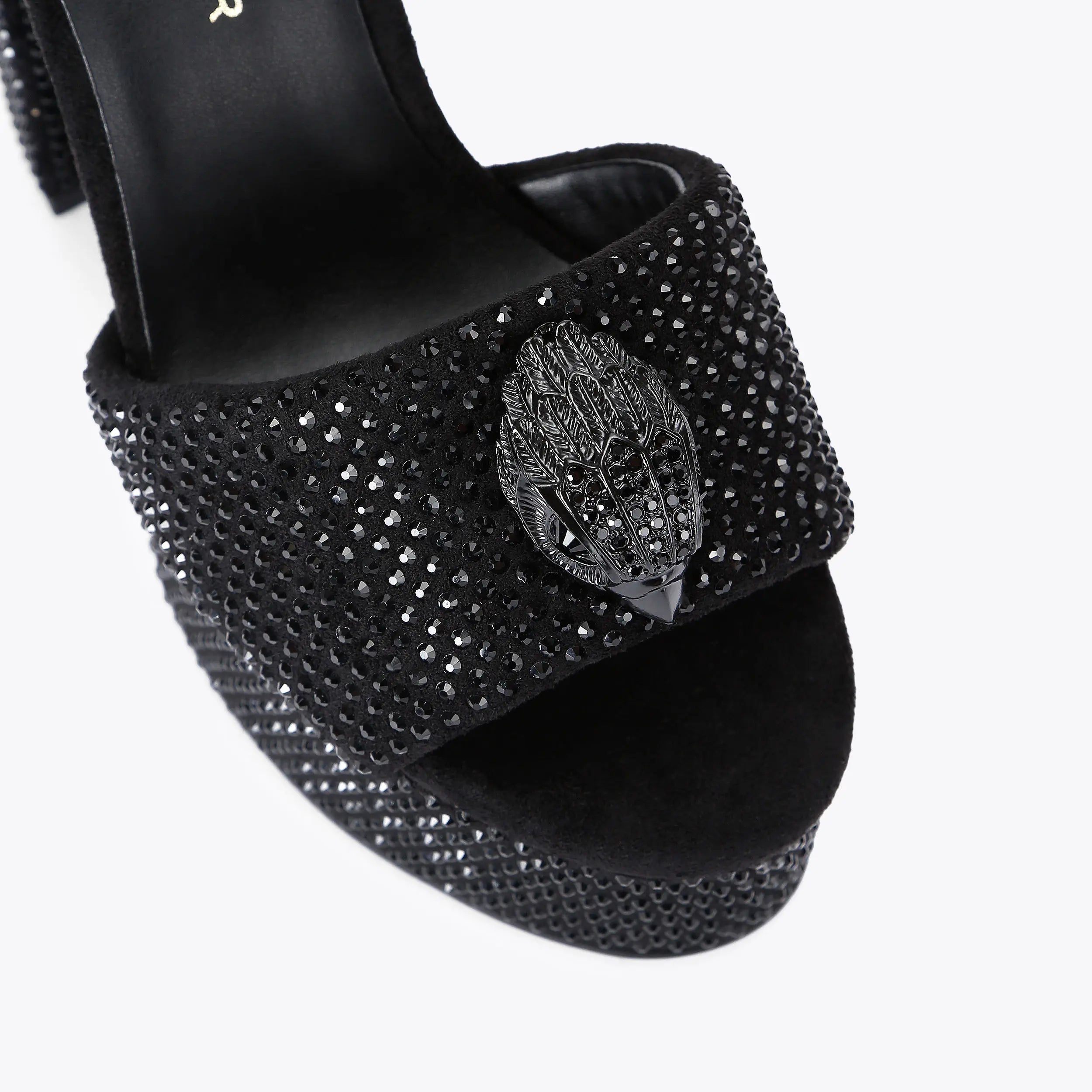 The Kensington Platform Sandal features a black velvet upper completely embellished in black crystals. There is a black eagle head with all over crystals sat on the toe strap.