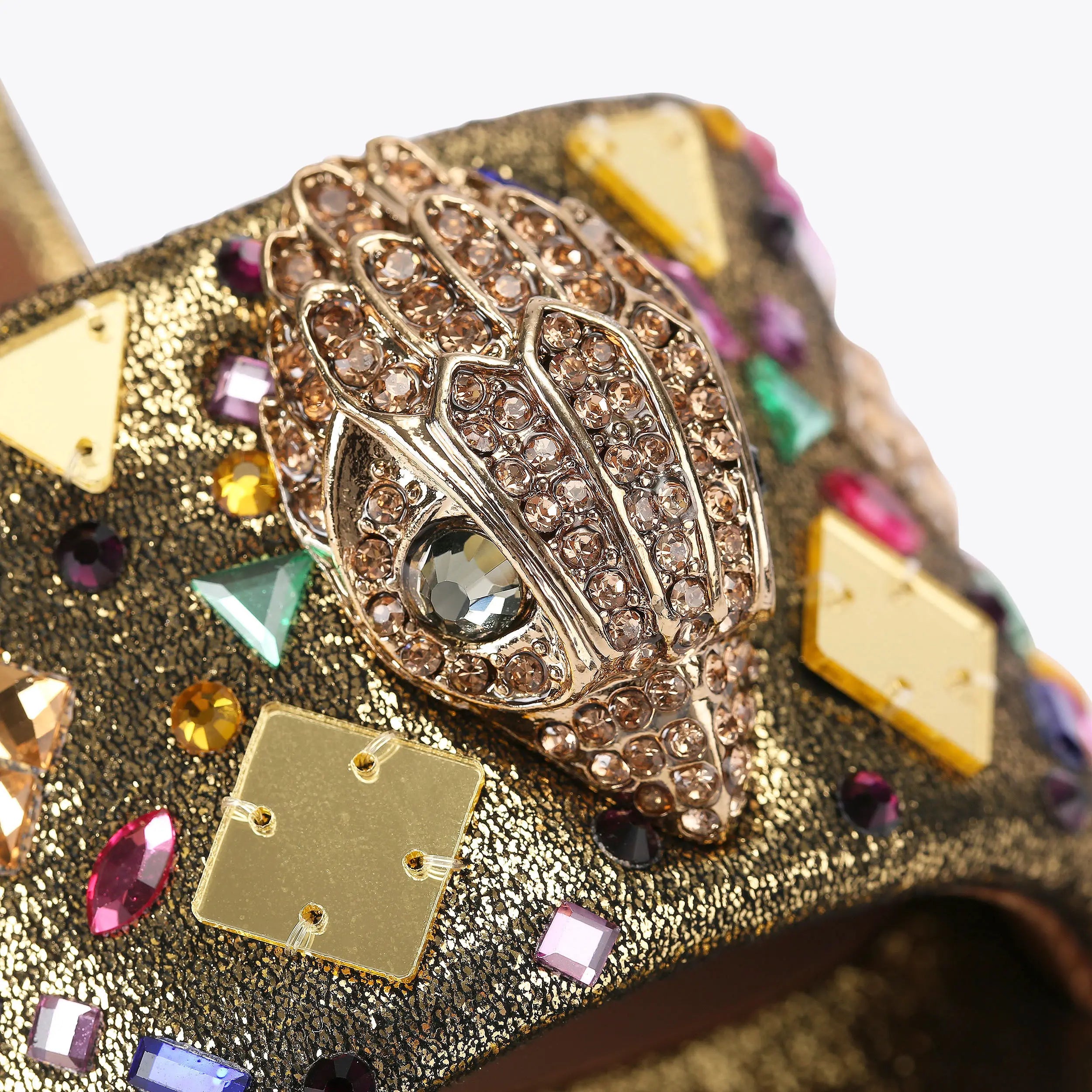 The Kensington Platform Sandal features a gold metallic upper with multi-color gems across the upper. There is a gold eagle head with all over crystals sat on the toe strap.