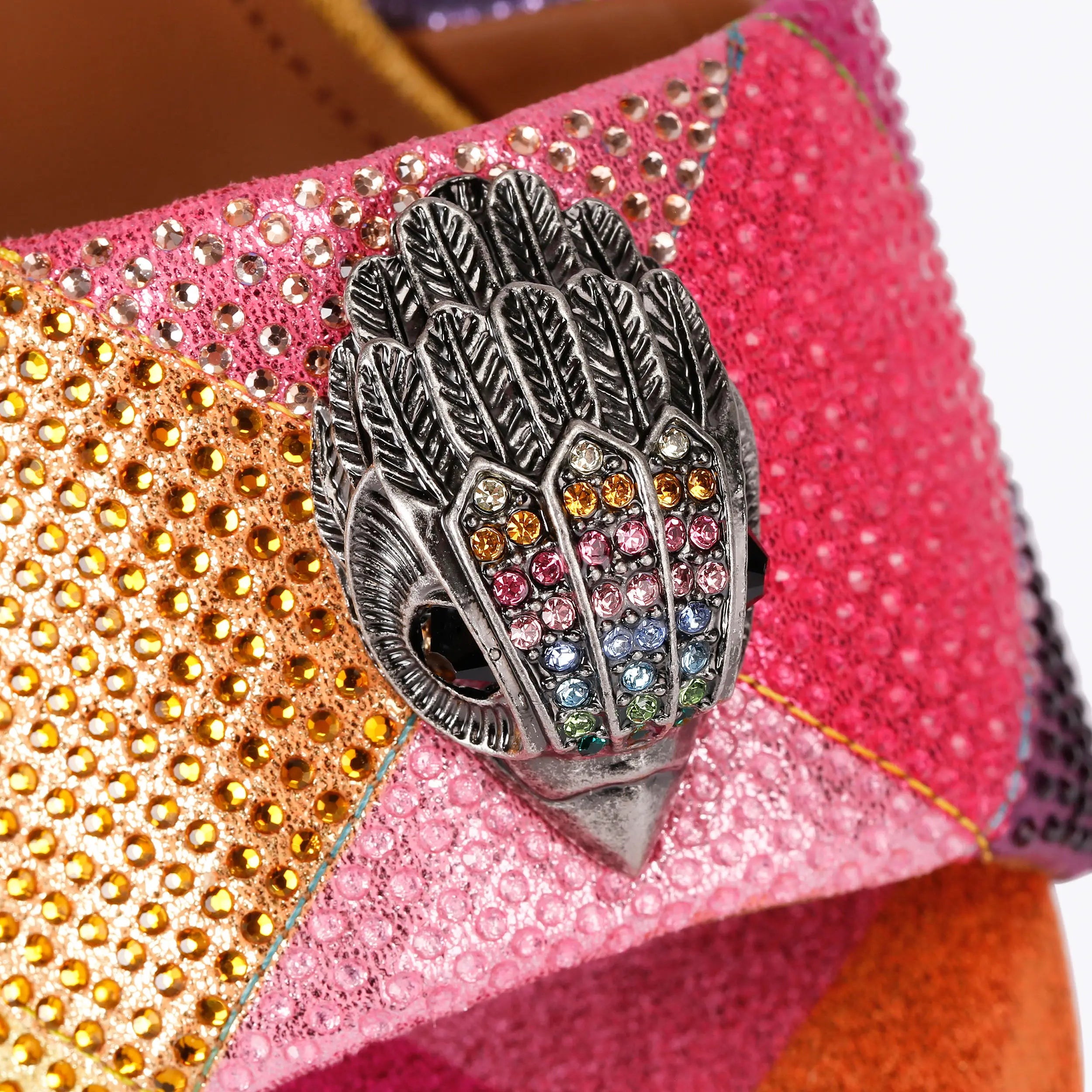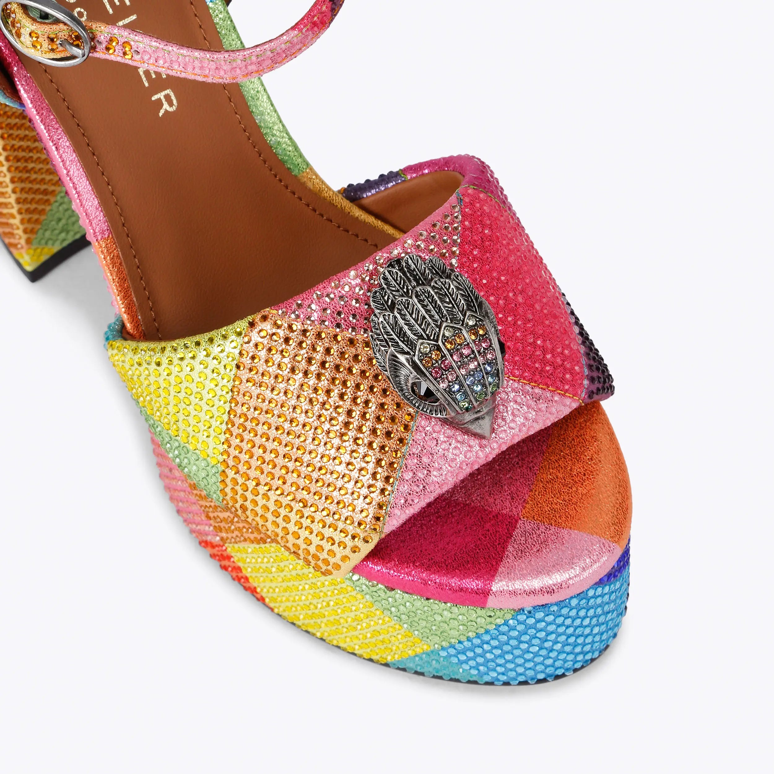 The Kensington Platform Sandal features a rainbow stained glass upper which is embellished completely with crystals. There is an antiqued silver eagle head with rainbow crystals sat on the toe strap.
