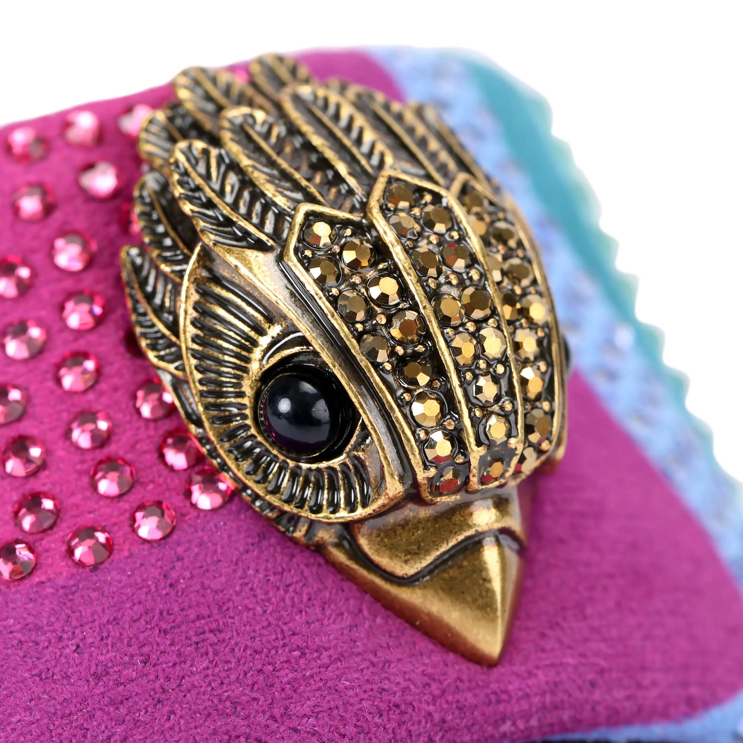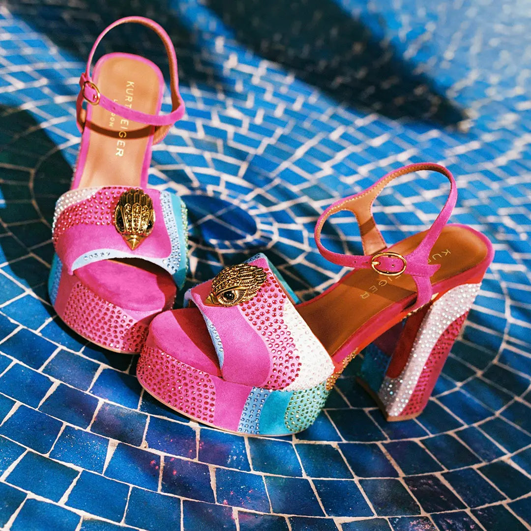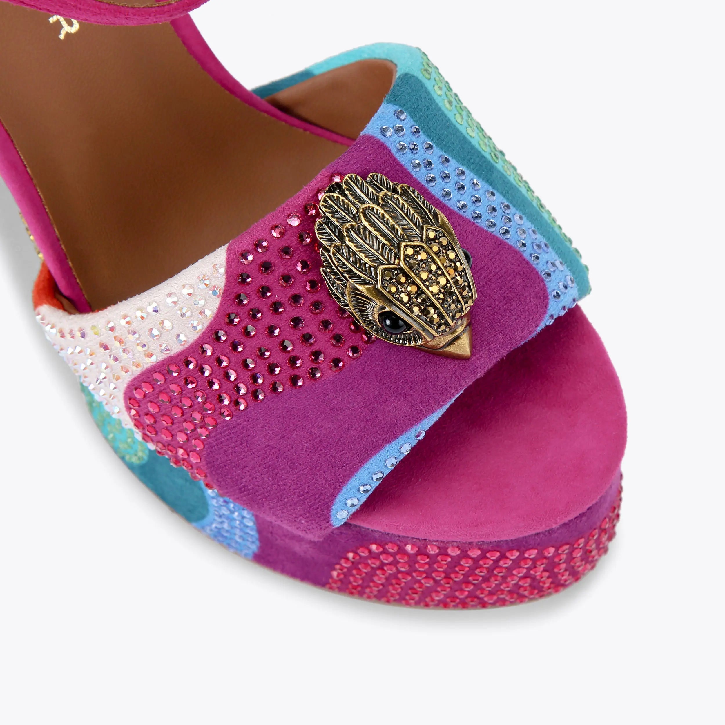 The Kensington Platform Sandal features a suede rainbow swirl upper which is embellished with crystals. There is an antiqued brass eagle head with crystals sat on the toe strap.