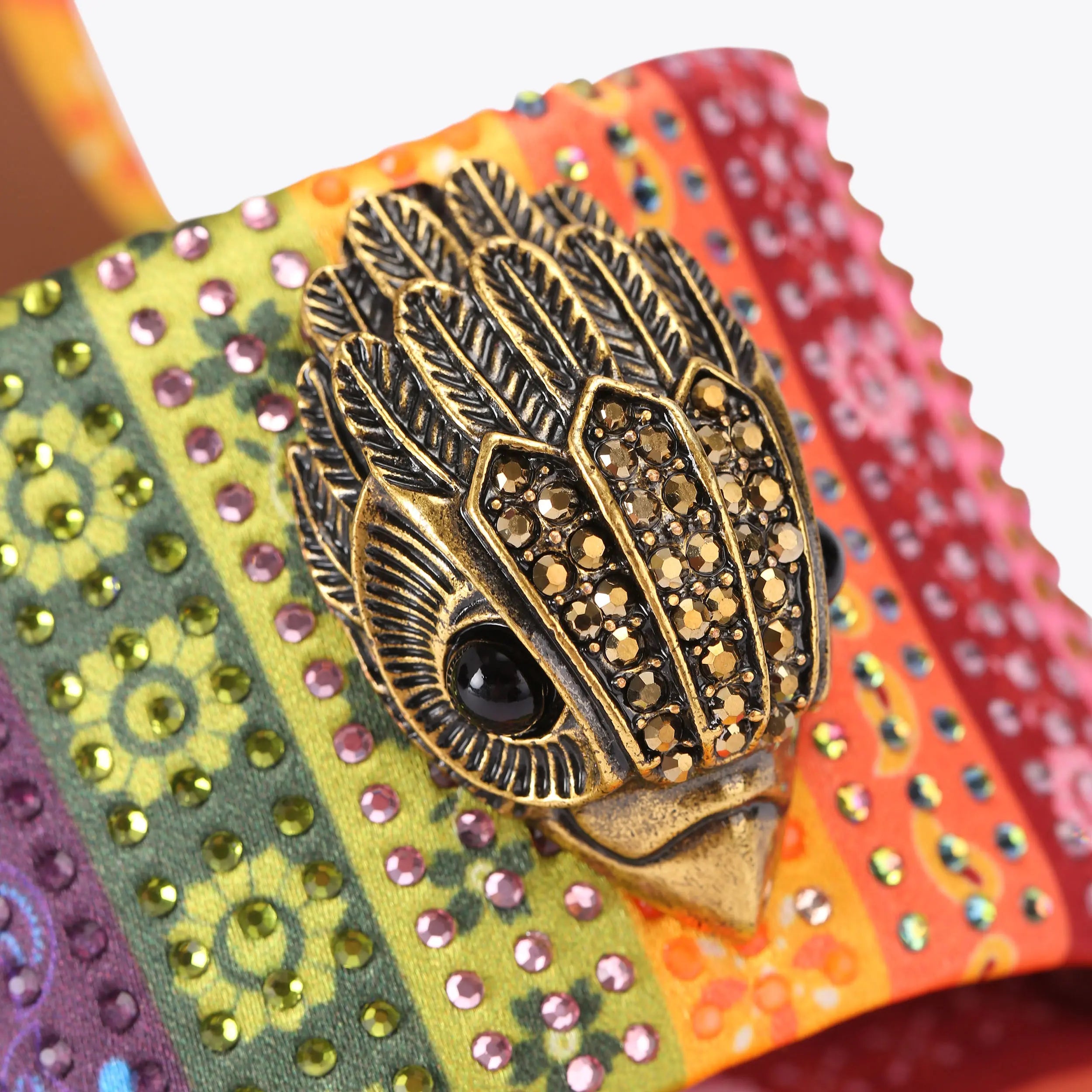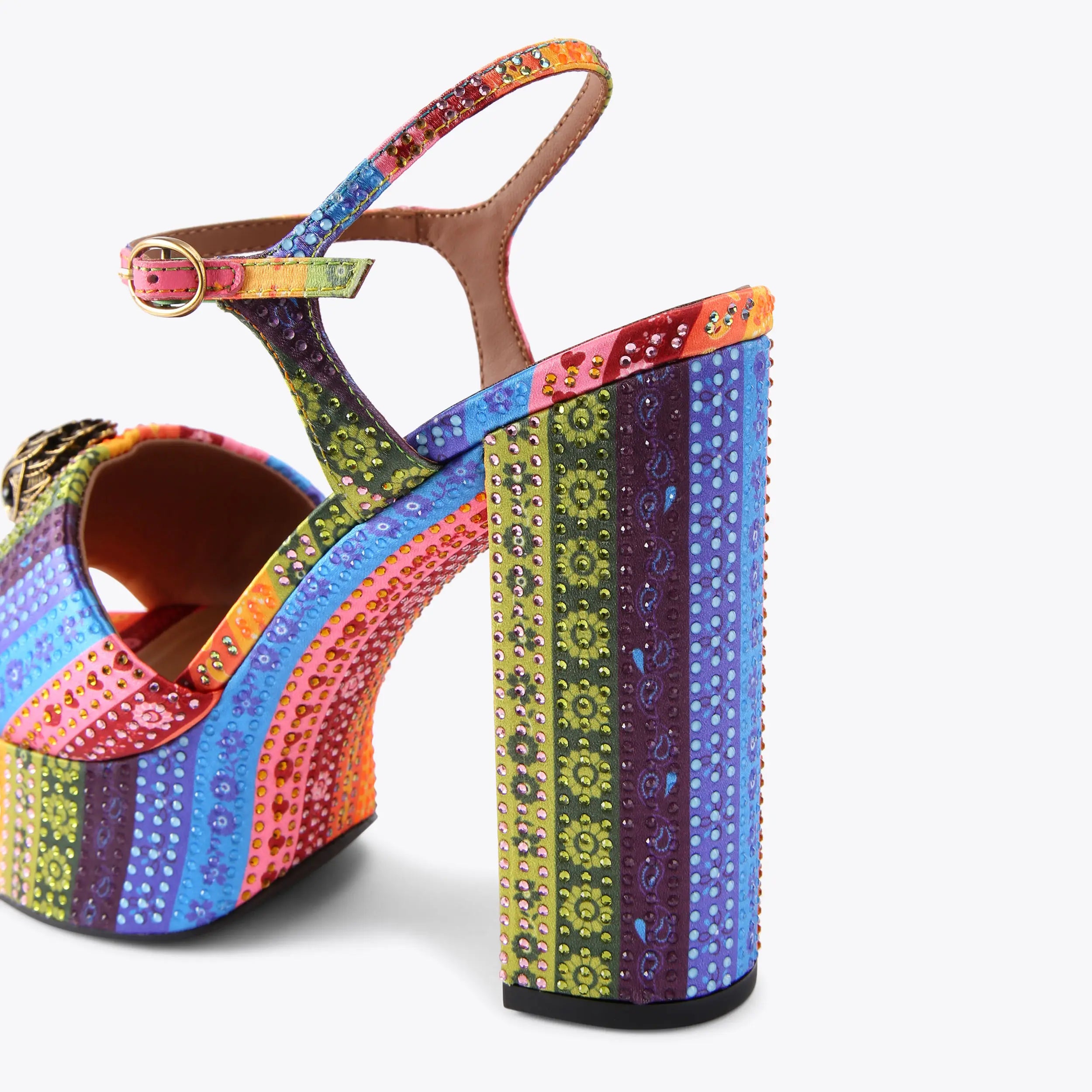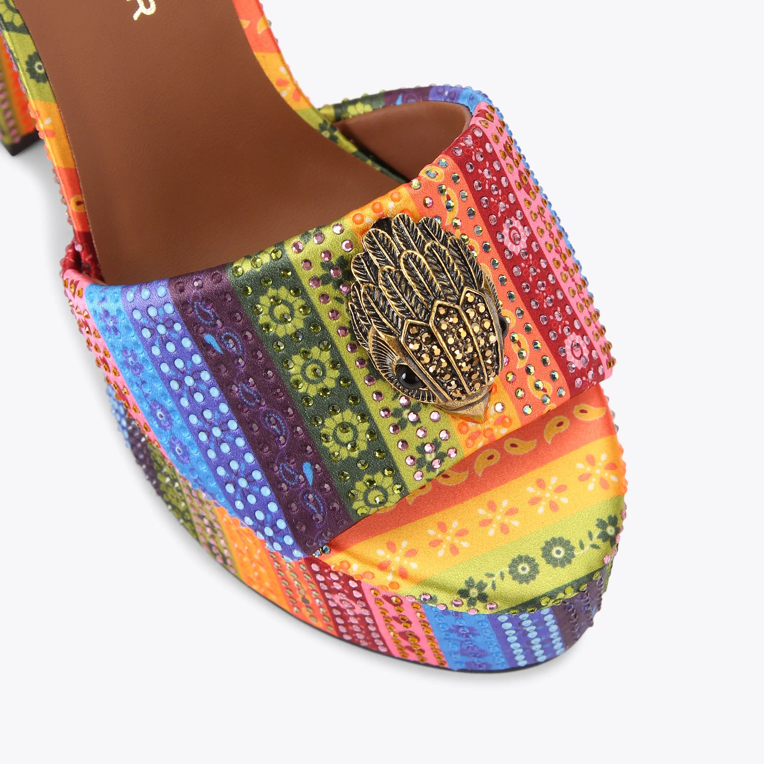 The Kensington Platform Sandal features a printed striped satin upper which is embellished with crystals. There is an antiqued brass eagle head with crystals sat on the toe strap.