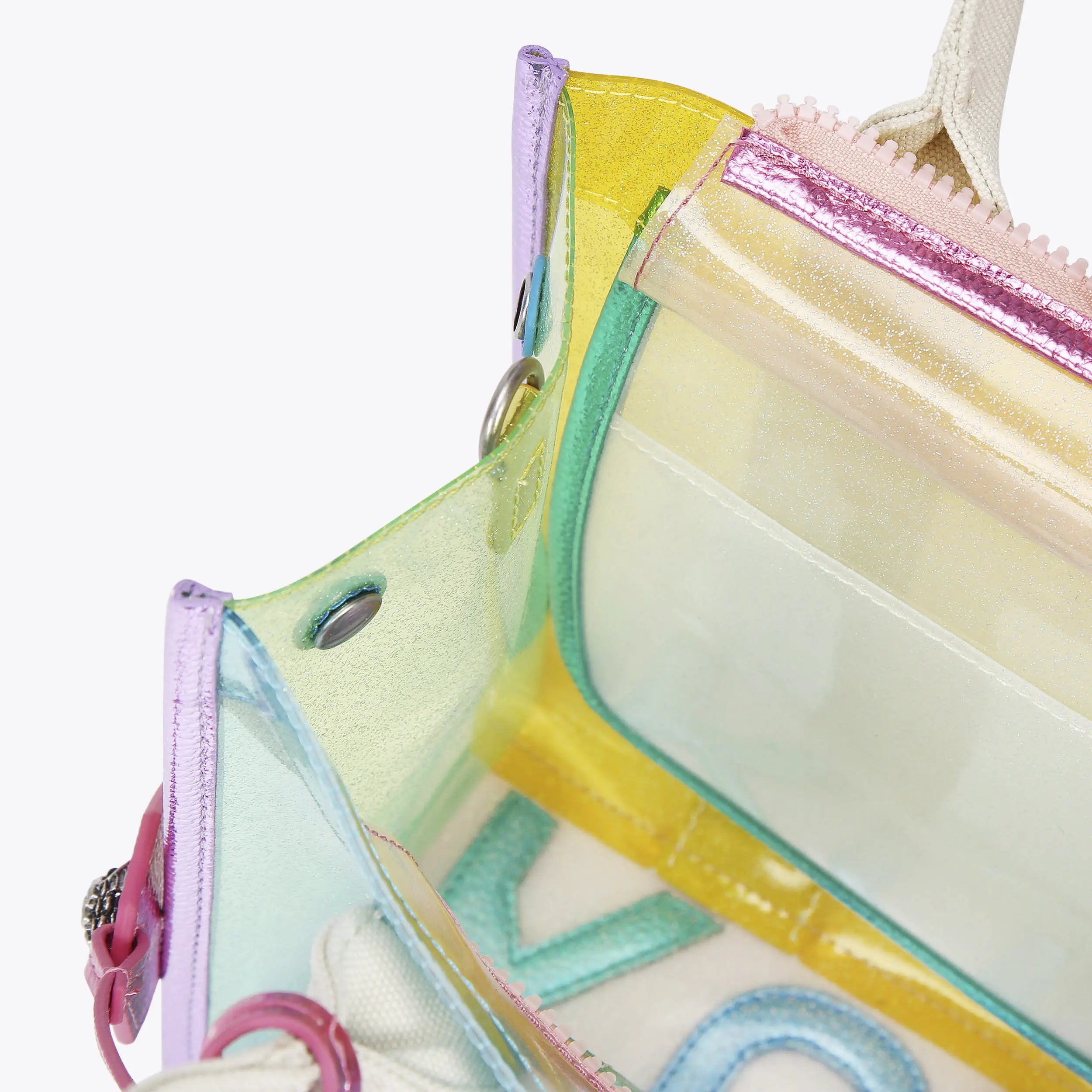 The Vinyl Mini Southbank Tote is crafted from a glitter rainbow vinyl. There are metallic trims as well as antiqued silver Eagle head with crystals on the tab.