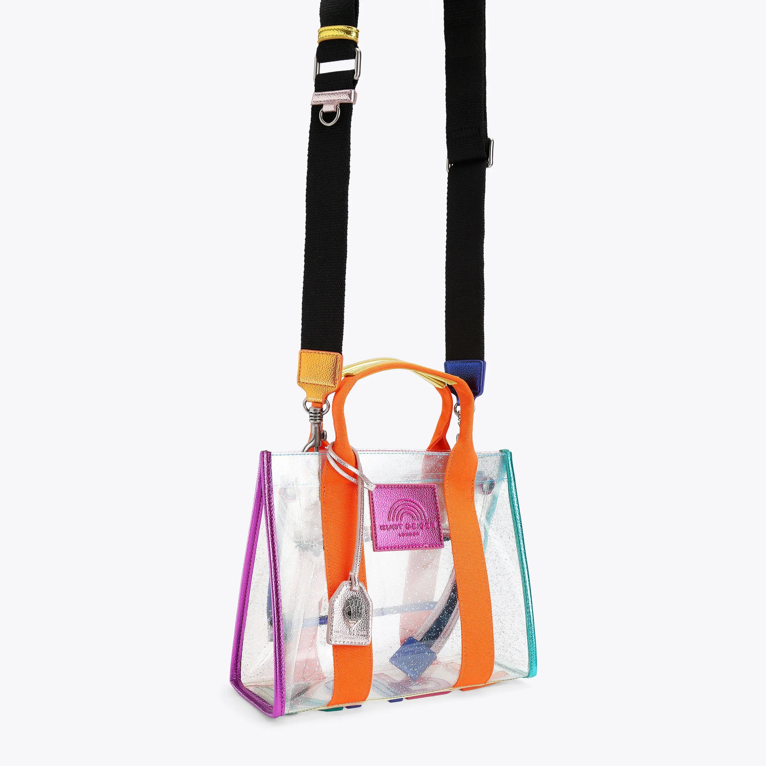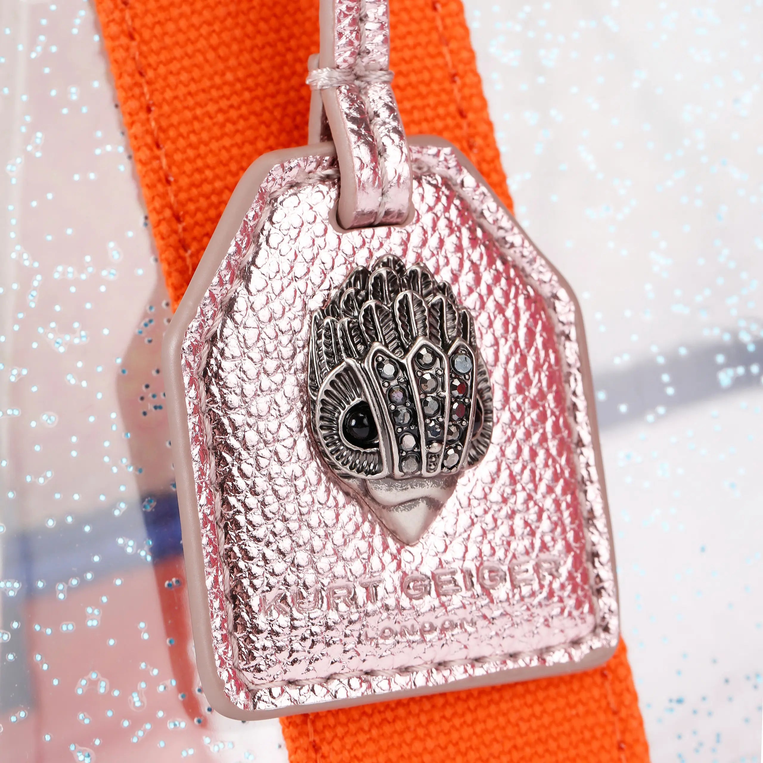 The Small Vinyl Southbank Tote is crafted from a glitter rainbow vinyl. There are metallic trims as well as an antiqued silver eagle head with crystals on the pale pink tab.
