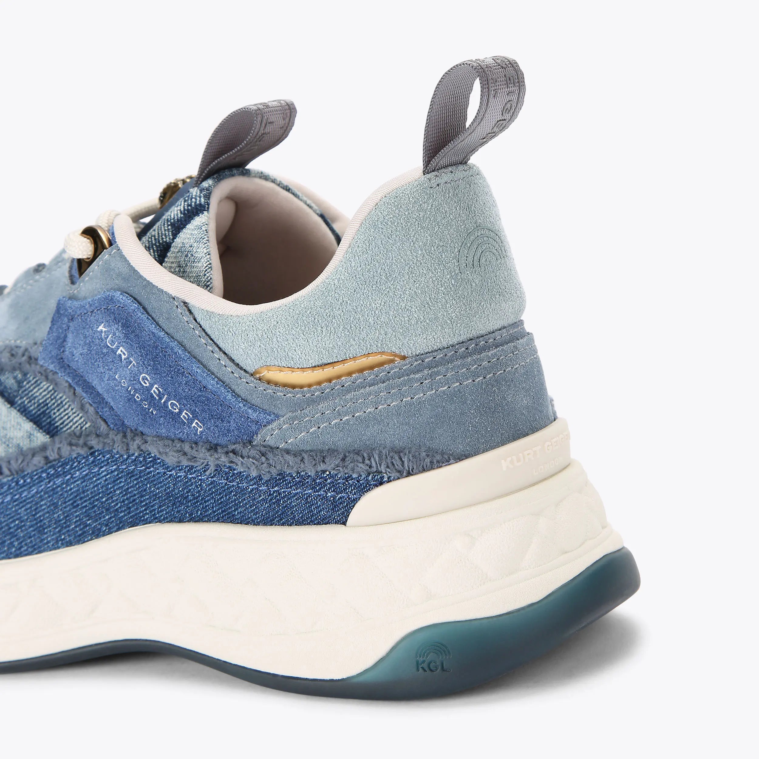 The Kensington Sneaker features a blue denim upper with suede panels and frayed edges. The tongue features a blue branded monocle with antiqued brass eagle head.