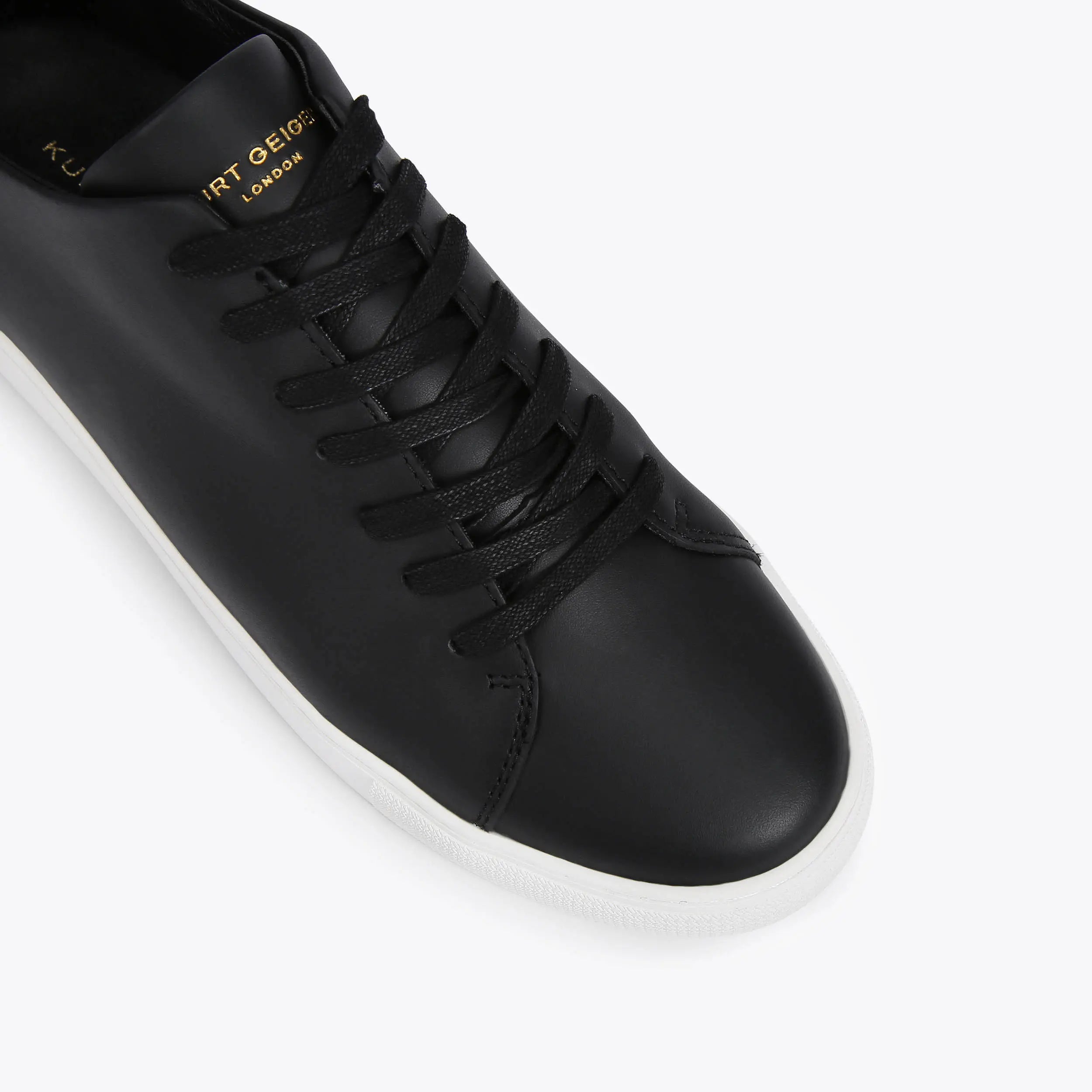 The Lennon is a black sneaker which laces up at the front. There is gold foil embossed branding on the tongue and heel.