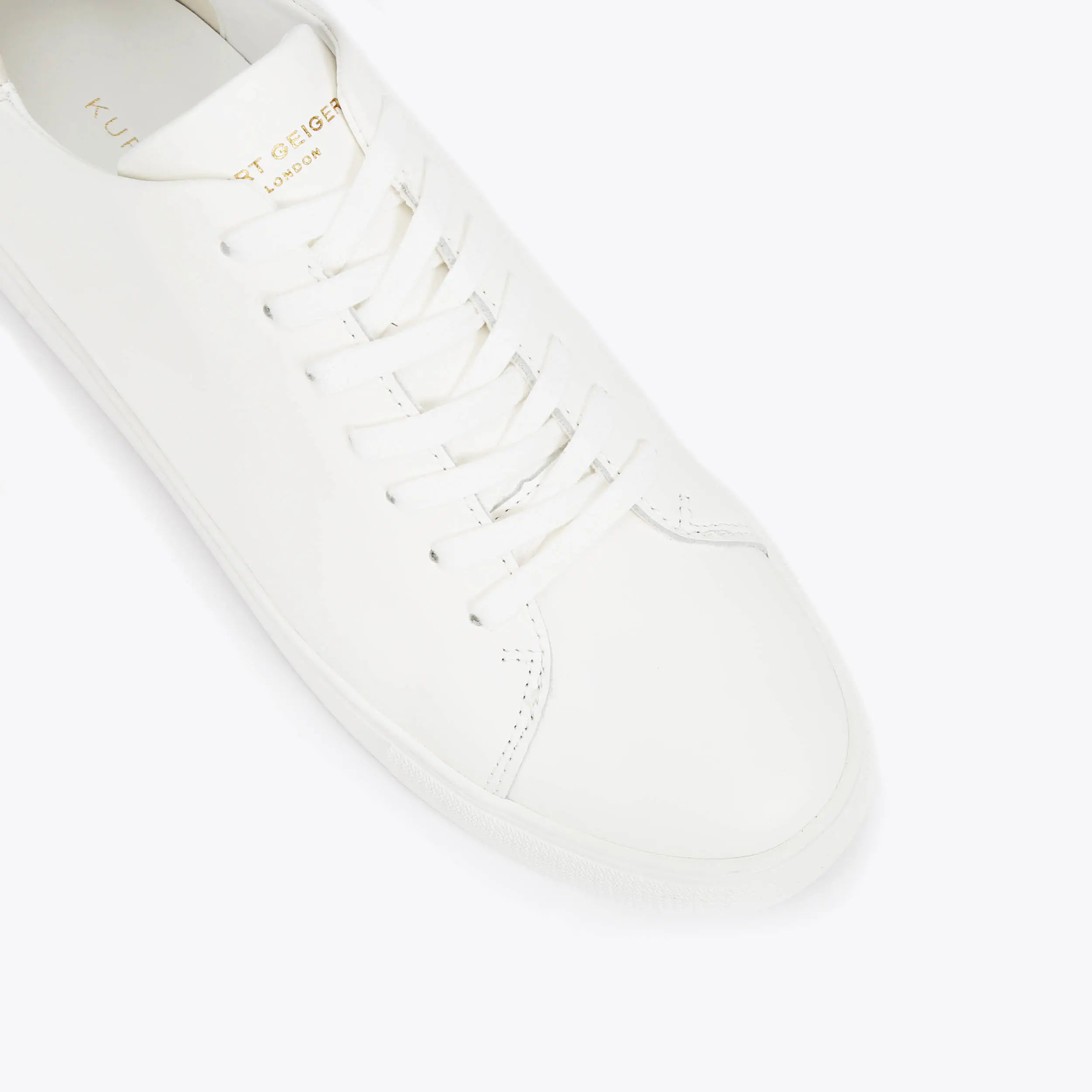 The Lennon is a white sneaker which laces up at the front. There is gold foil embossed branding on the tongue and heel.