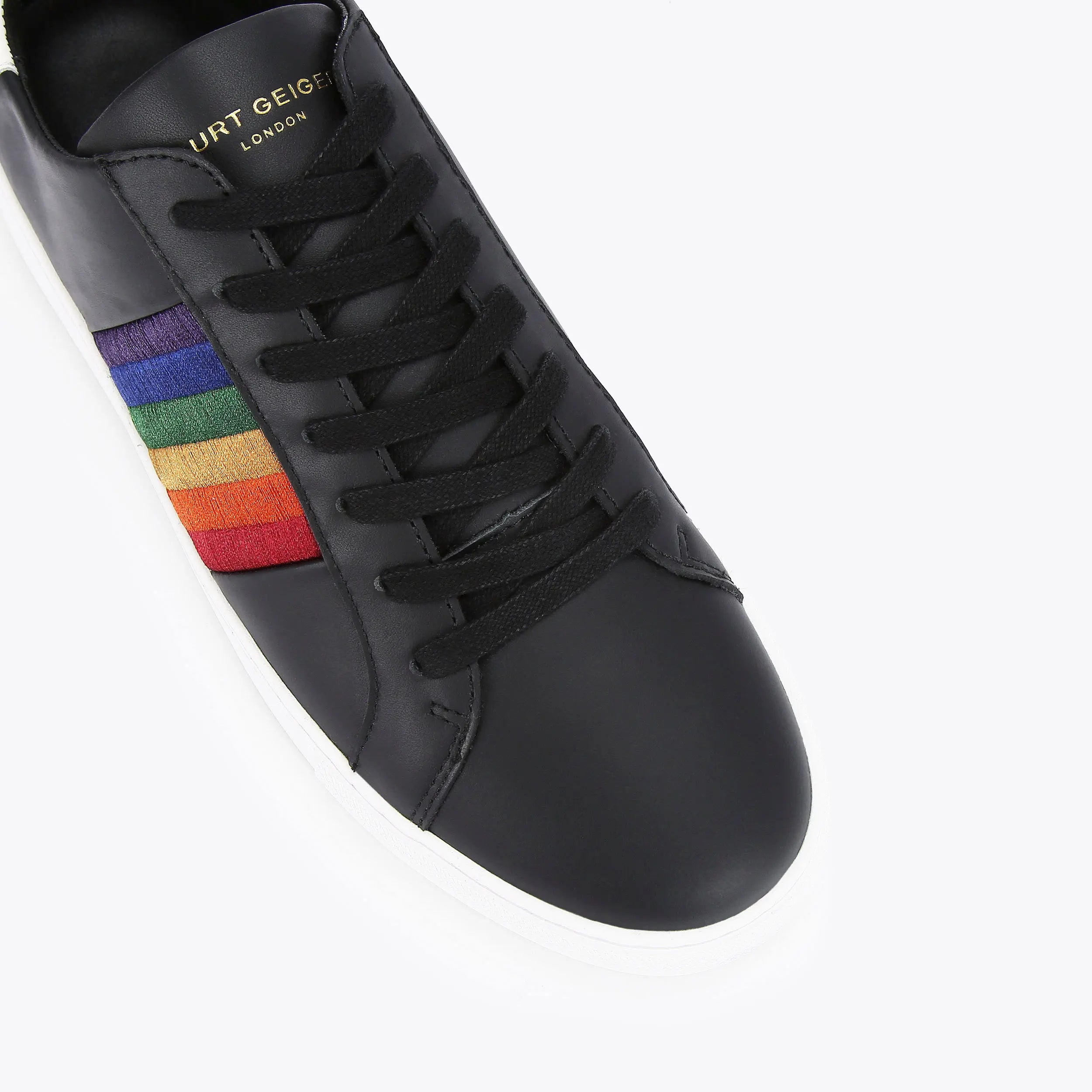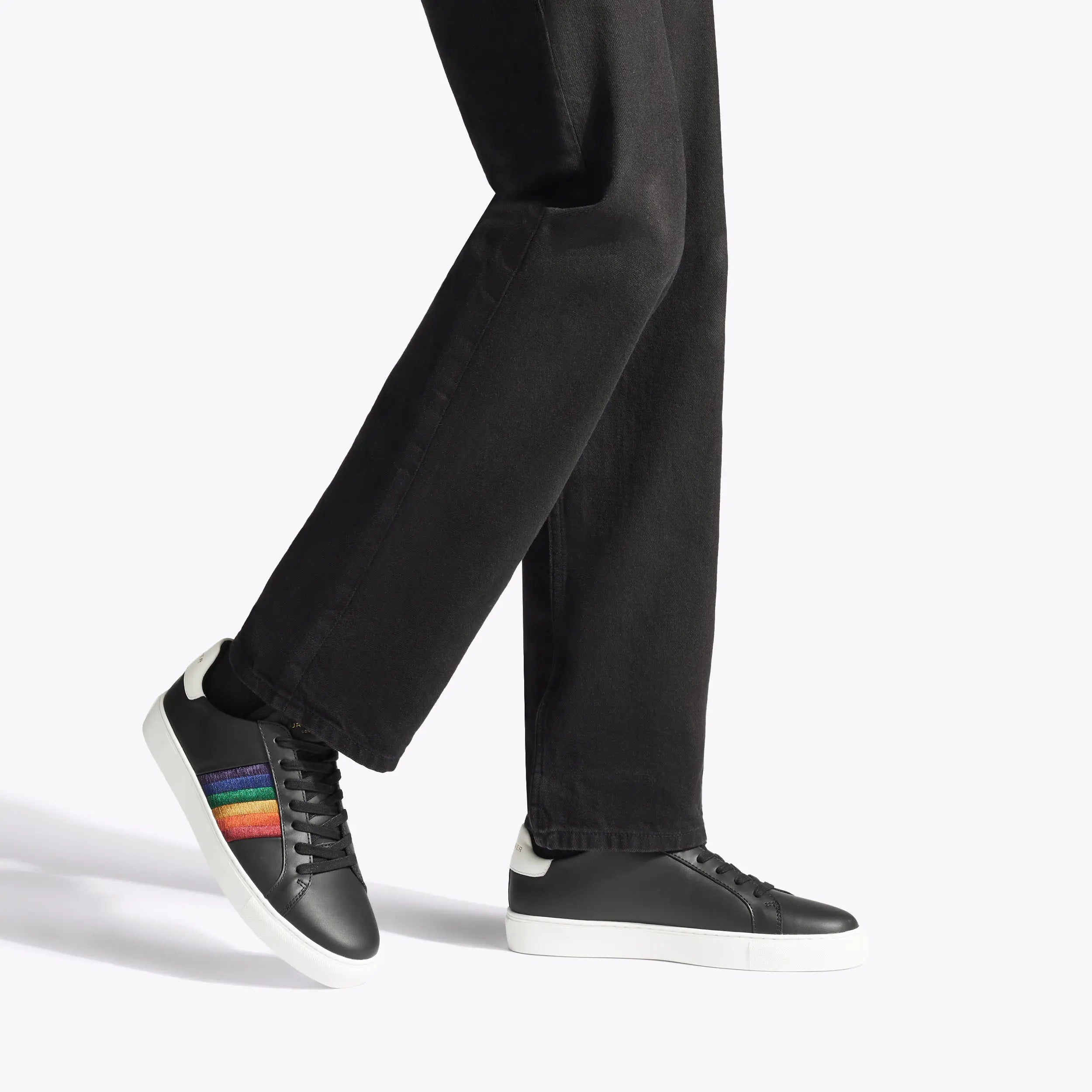 The Lennon Sunset Multi is a black leather sneaker. The outer side features a rainbow stitch design. The tongue and heel feature gold foil embossed logos.