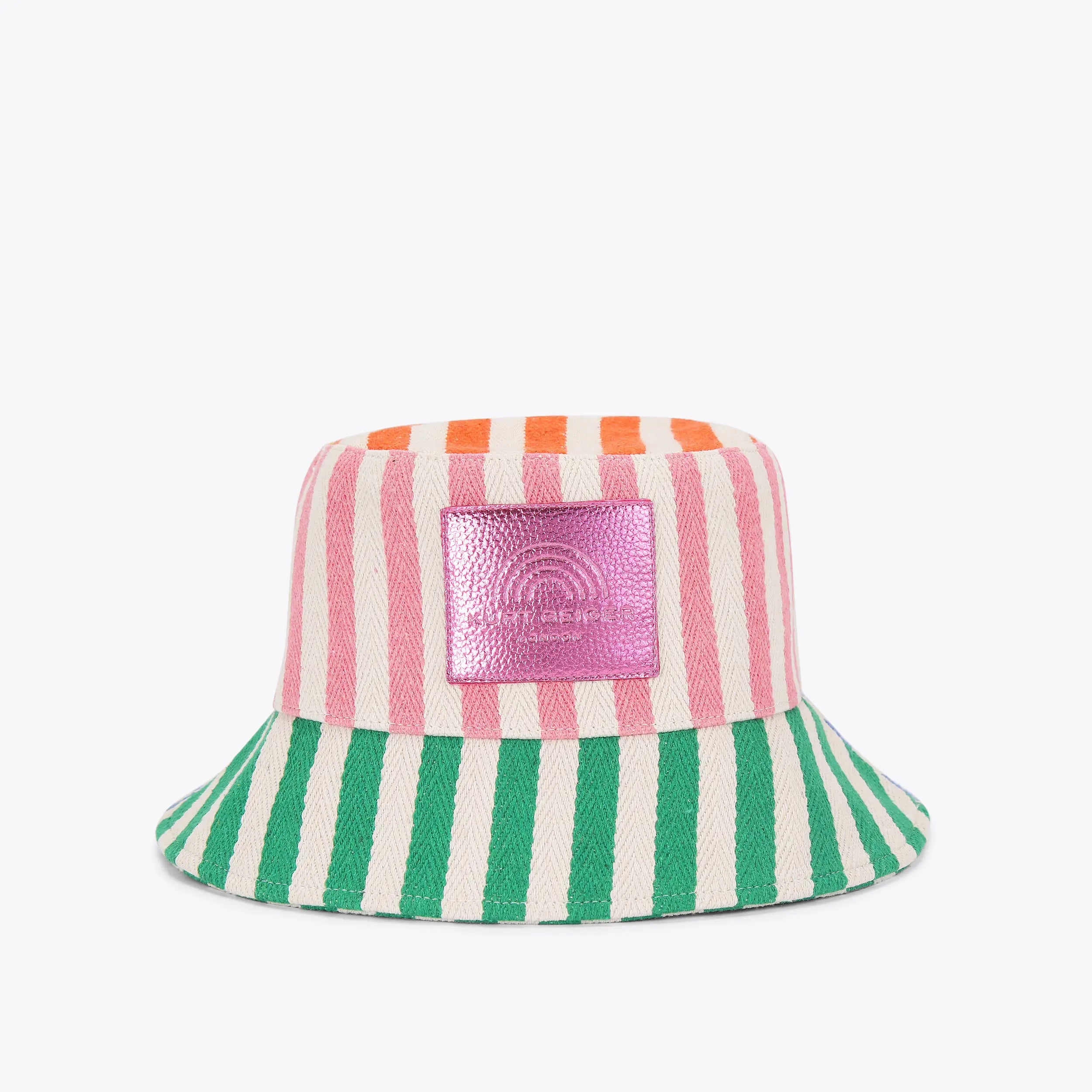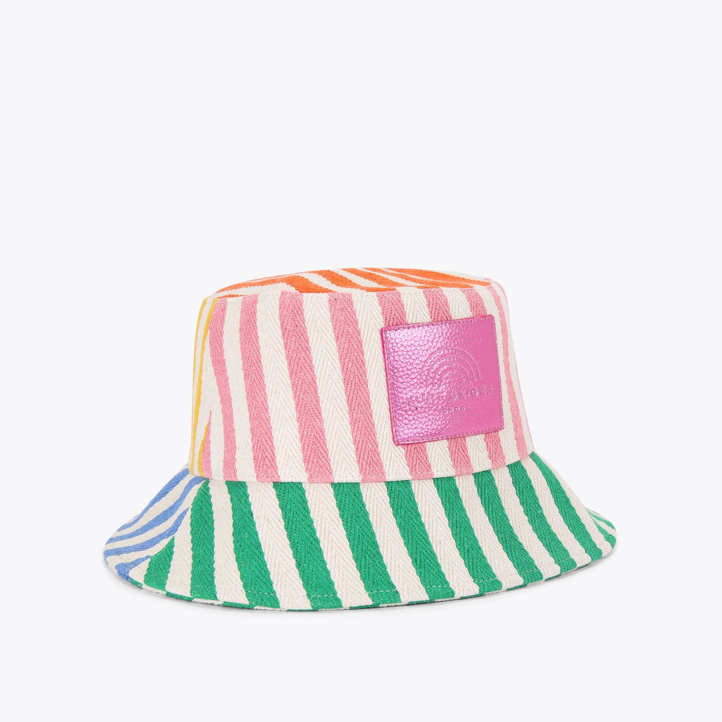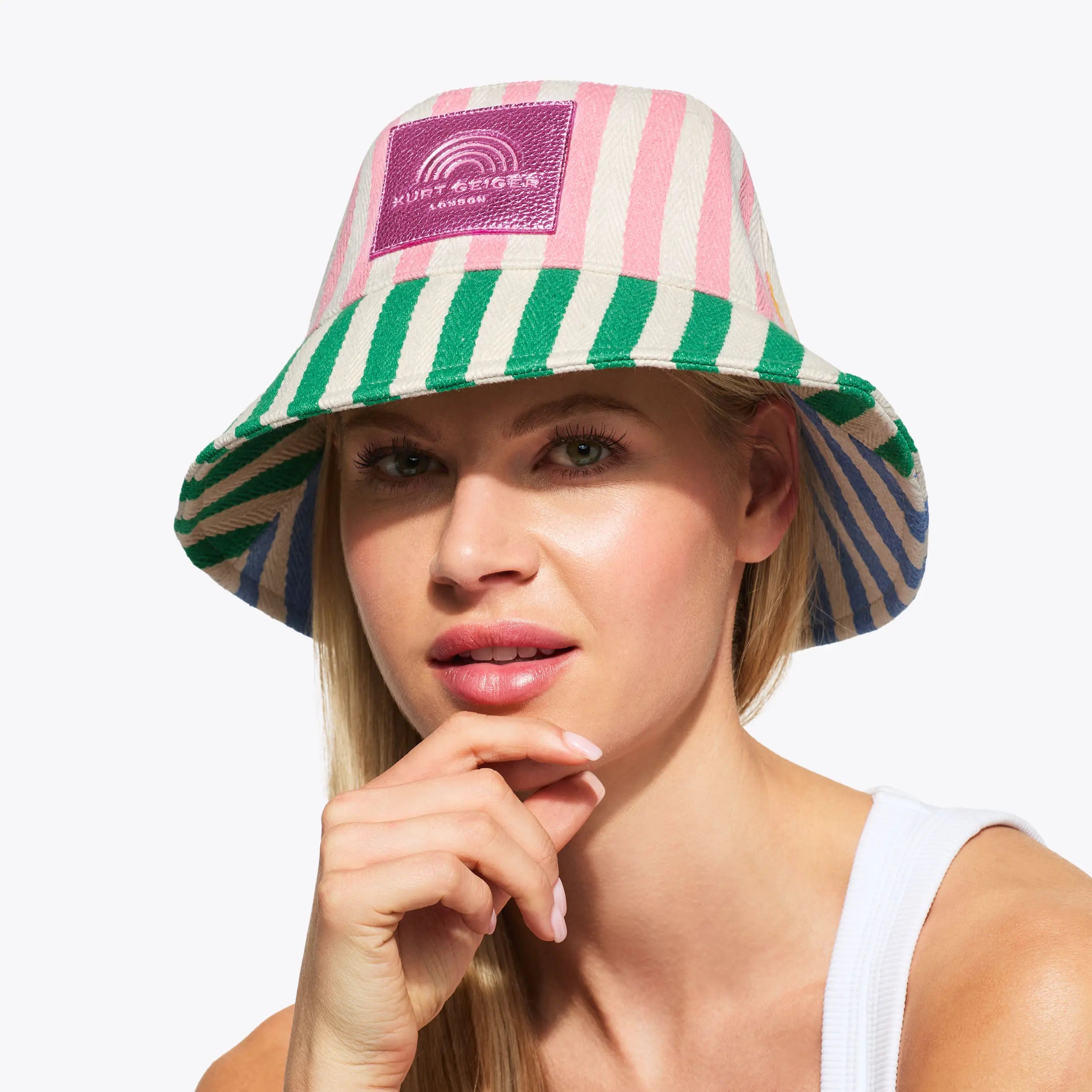 The Southbank Bucket Hat features a rainbow striped design on the neutral cotton. There is a metallic pink branded patch to wear facing the front.
